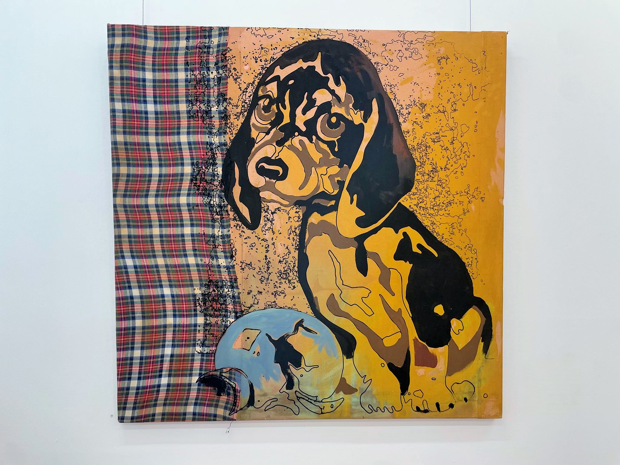 He juxtaposed his dog „Waldi II,“ painted in Paris in 1995 in classically realistic tempera with a somewhat distorted tartan and called the work „L’Emergence.“ The dog stands on tiny islands that perhaps mark its territory. But the title of the work, which translates as „The Emergence,“ broadens the horizon. He points to the philosophical problem that things—and in this case, the dog Waldi and his territory—do not merge into their appearance before our eyes, and certainly not into dualities like those of humans and animals. The dog and its environment retain their own transcendent reality, their emergent side. Works like „L’Emergence“ could therefore transfer overly simplistic thought patterns to higher levels of perception.