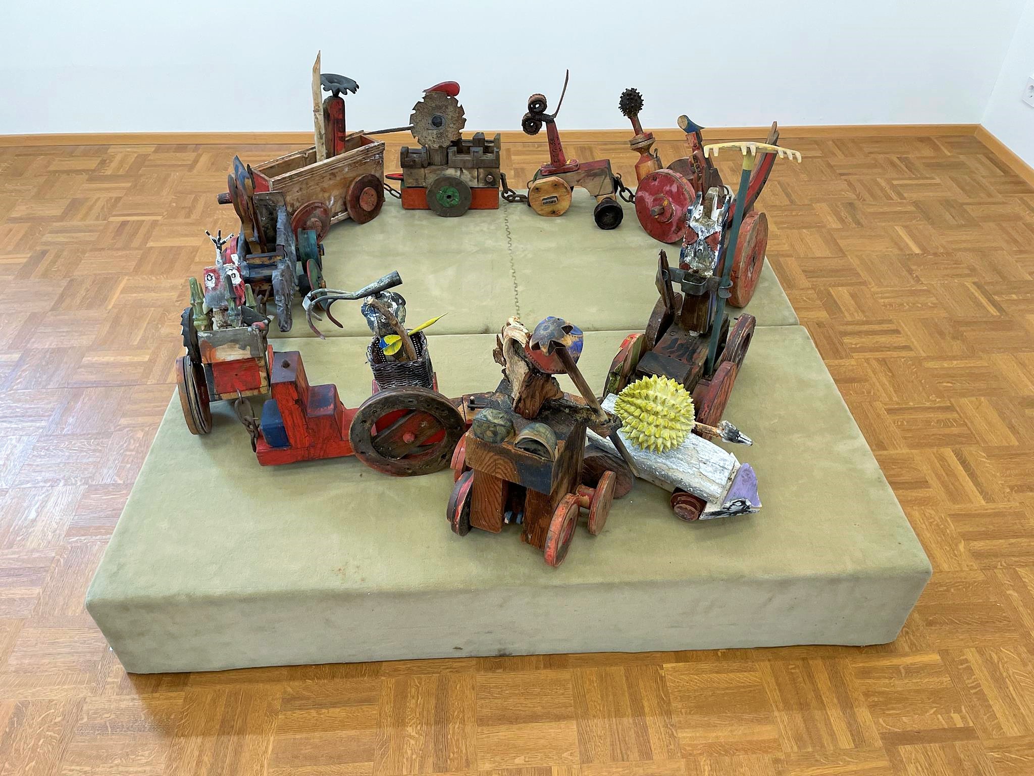 The aforementioned catalog includes three photographic works from Axel Heil’s 1995 performance „Ein Teil der Beute“ (Part of the Prey). Heil wears brown boots, striking red-and-black striped trousers, a dark brown coat, a light brown cap, and carries a guitar, an earth-colored duffel bag, and a replica yellow child’s bicycle on his back. Heil also holds a roll of wrapping paper, a tool halfway between a spear and a whisk—perhaps a crosier—under his left arm, and a blue-white-and-red striped linen shopping bag and an axe in his left hand. With his right hand, he pulls a four-wheeled cart on a rope, bearing a female figure with blond hair and a second staff comparable to the spear, staff, or whisk under Heil’s left arm. Heil’s cart resembles the carts he chained together in the 1991 installation „Croisadement.“