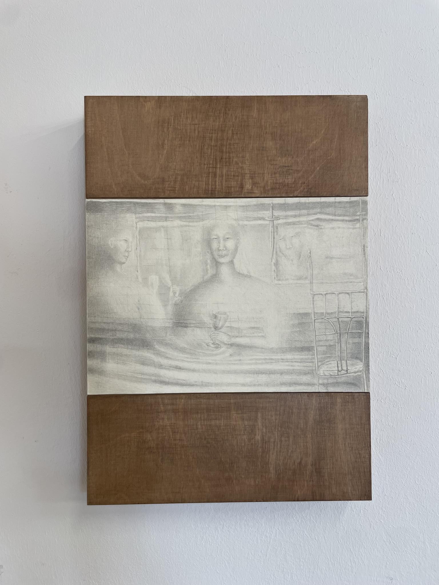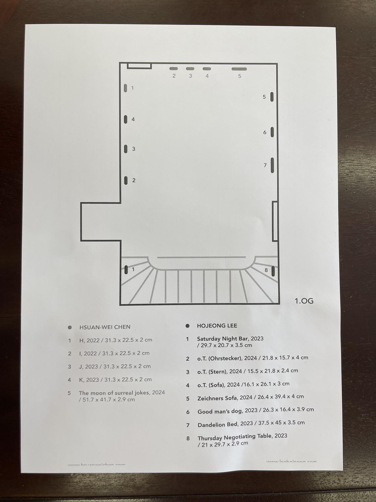 Over the next few weeks, I have resolved to seek a conversation with the drawing ‚Thursday Negotiaten Table‘, because this work reminds me of negotiations with the Evangelical Church Council and my stepbrother that were not always easy. Perhaps this conversation will clarify things that have been overlooked so far. I am sure that you too could find a drawing in Hojeong’s work that is worth talking about. Finally, it should be noted that Hojeong builds her frames herself and sees them as part of her work.  –  Curator Helmut Albert Müller