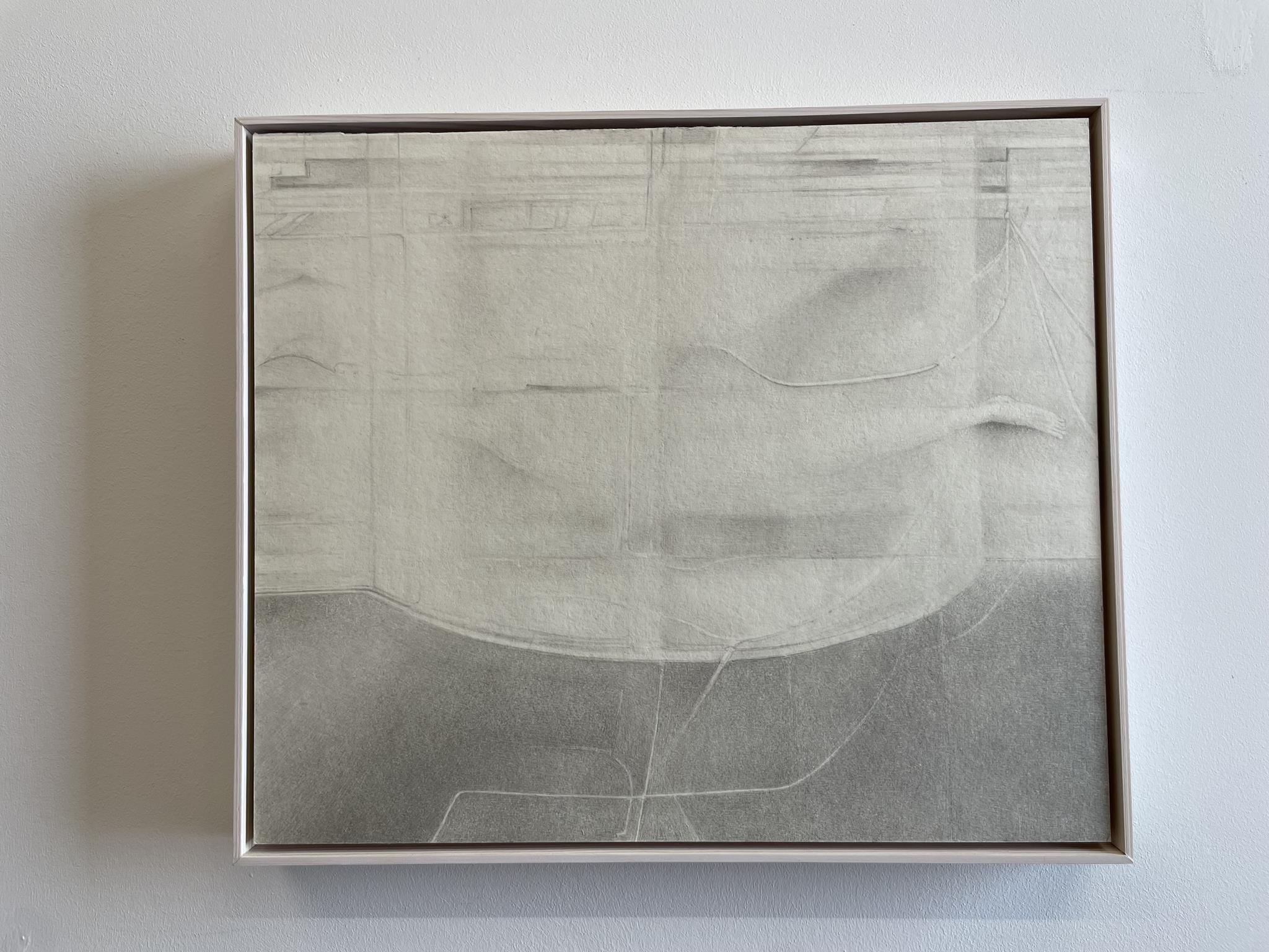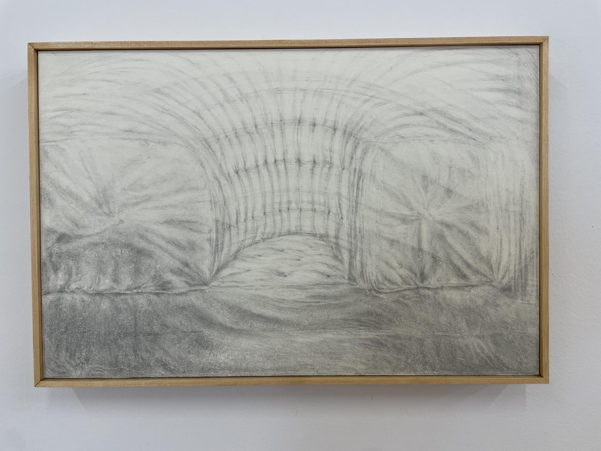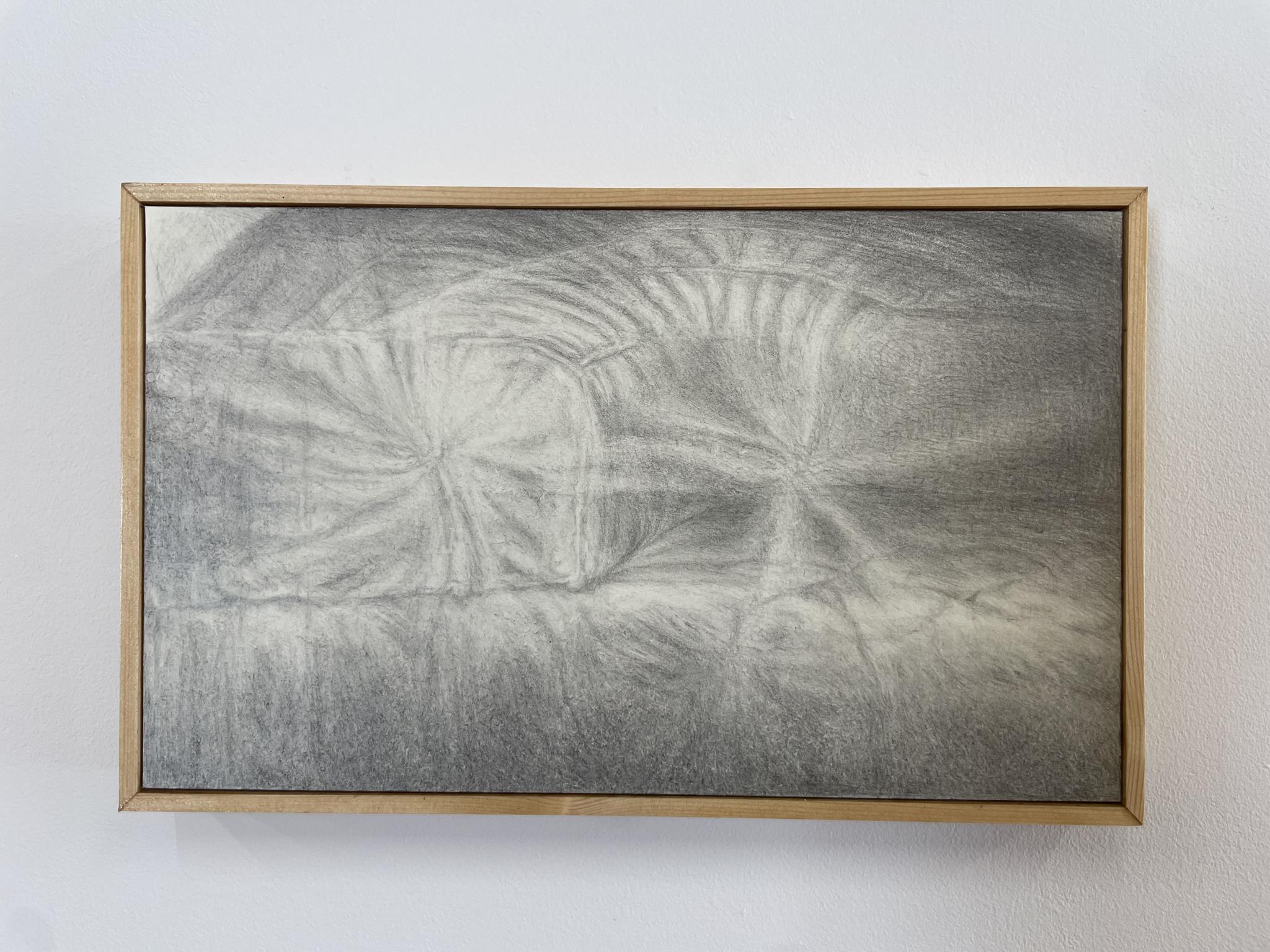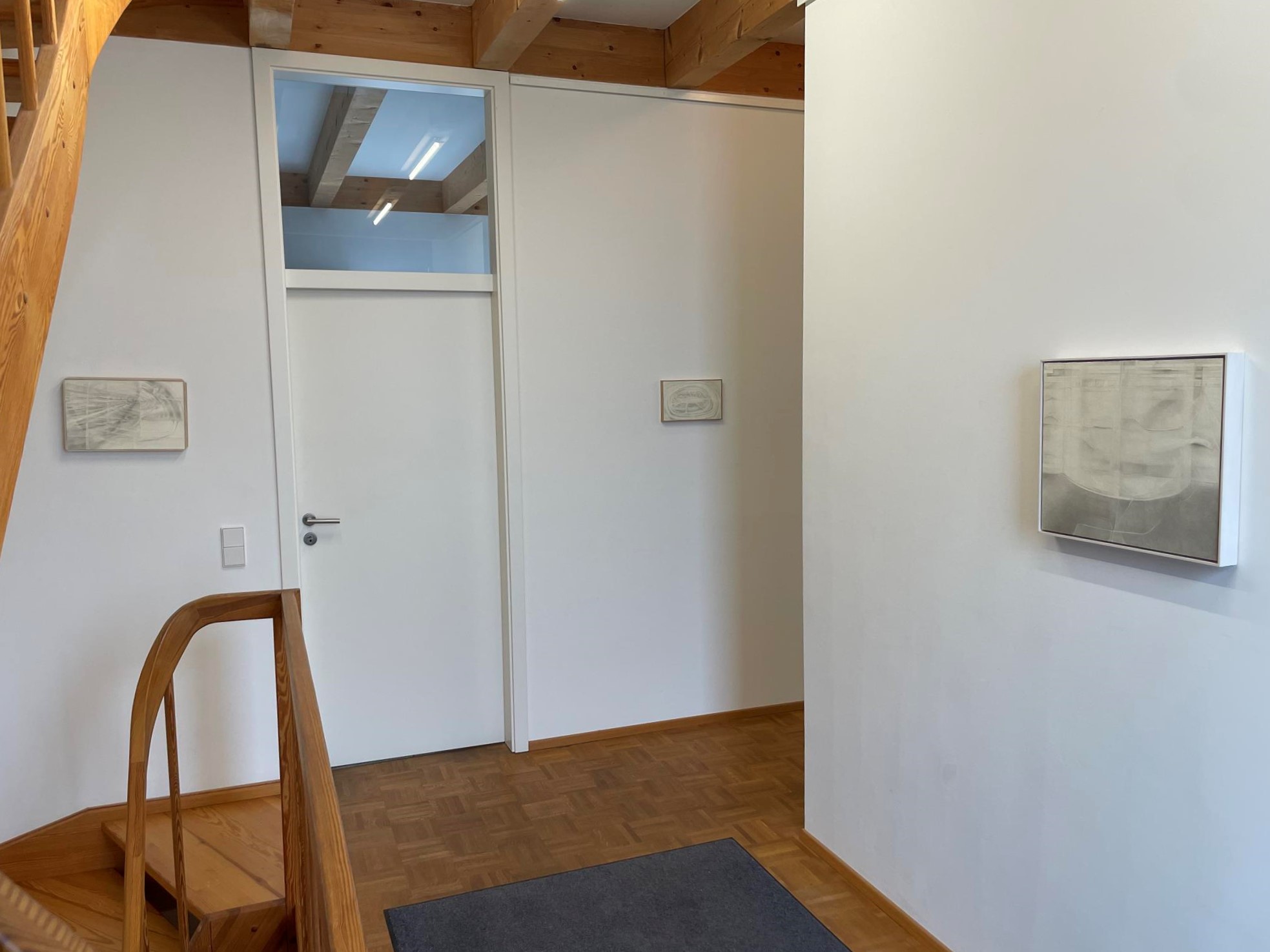 In Hojeong Lee’s black and white drawings, the question of the symbolic meaning of colors does not arise. She says that colors are too beautiful for her and that they overwhelm her perception. That is why she uses pencils of varying degrees of hardness and a black and white spectrum ranging from white to soft gray to deep black to produce her drawings. JaJa has given her drawings abstract titles following the ABC; Hojeong prefers a more concrete approach and suggests titles that remind us of our own experiences. Thus, the drawing in the hallway to the left of the kitchen door is called ‚Zeichner‘, the drawing on the right wall in the hallway ‚Fuß‘, the drawing above the staircase ‚Saturday Night Bar‘, the first drawing on the left wall of the gallery seen from the staircase ‚Ohrstecker‘, the second drawing on the left ‚Stern‘, the third on the left is called ‚Sofa‘ and the third on the right ‚Zeichners Sofa‘; the first on the right is titled ‚Dendelion Bed‘ and the second on the right ‚Good man’s dog‘.