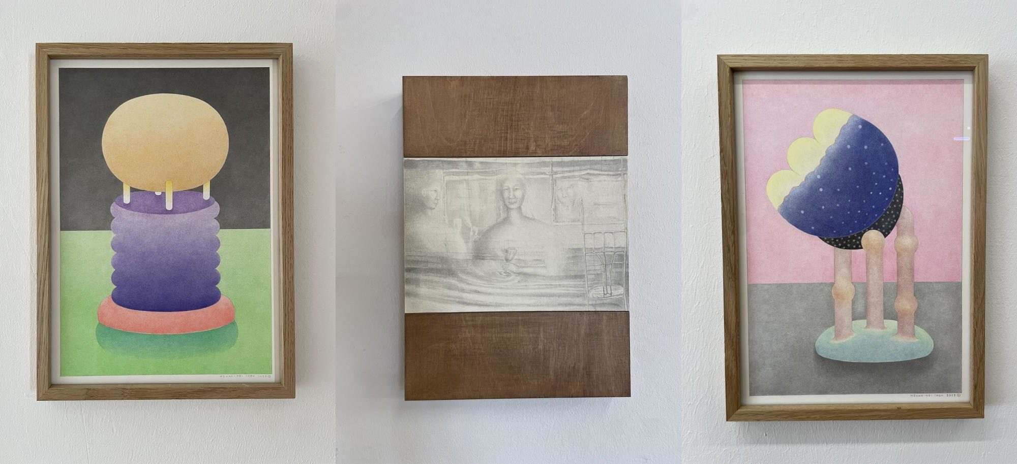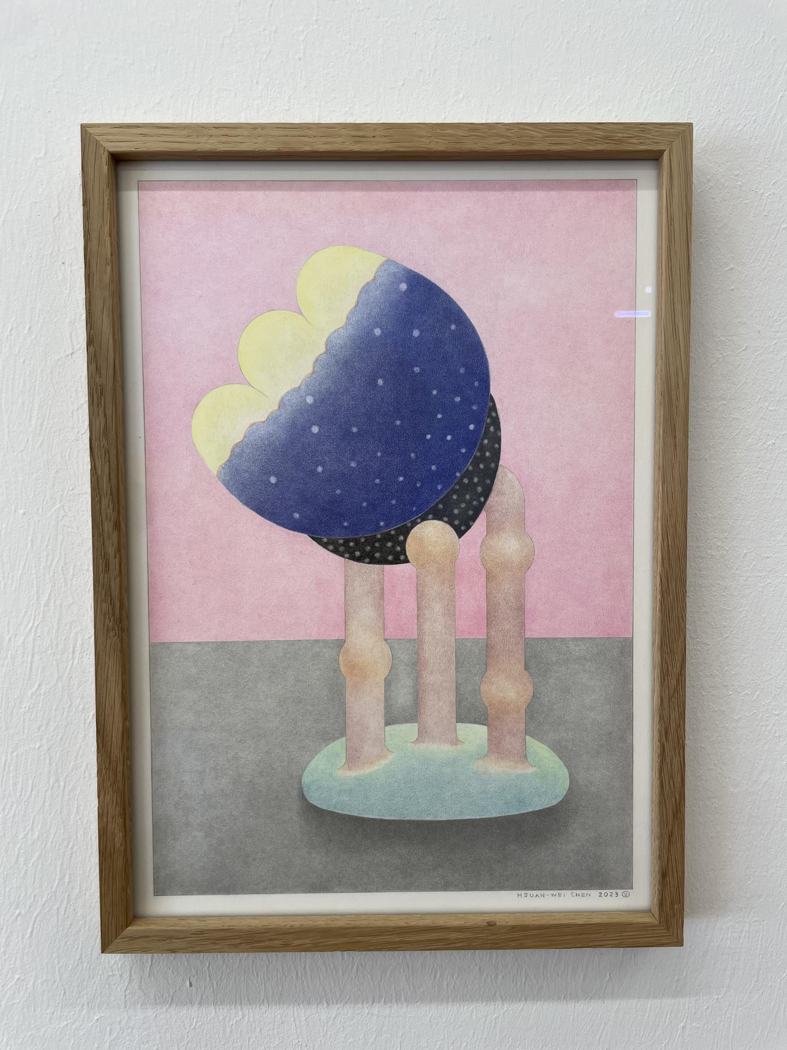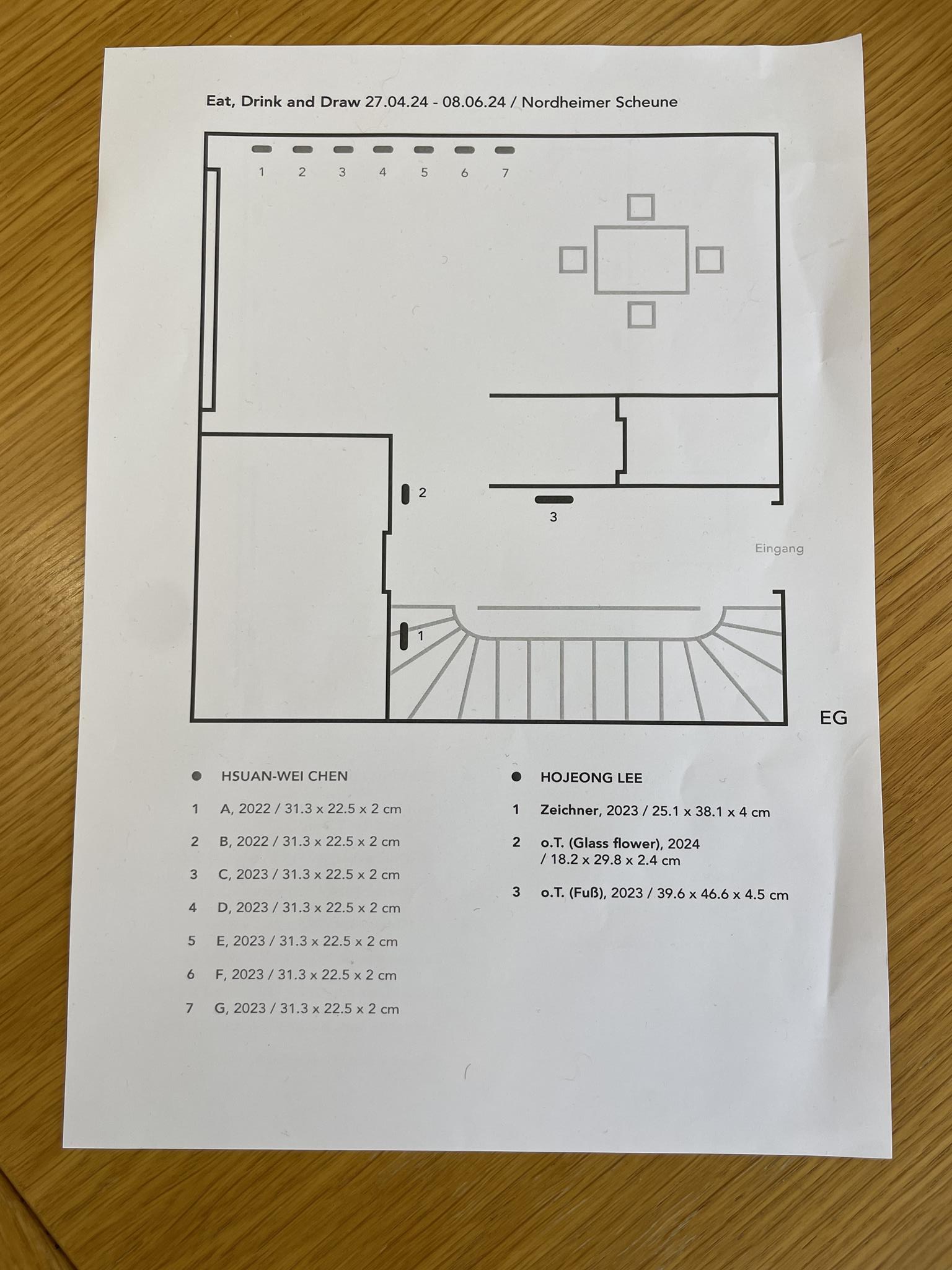 Curator HELMUT ALBERT MÜLLER about the exhibition: Born in Taipei, Taiwan in 1986, Hsuan-wei Chen, a graduate of the master’s program for jewelry, silversmithing and related productions at Birmingham City University and master student of Sophie von Hellermann at the State Academy of Fine Arts in Karlsruhe, who is called JaJa by her friends, and Hojeong Lee, a master student of Karlsruhe rector Marcel van Eden who was born ten years later in South Korea, agreed on the title „Eat, Drink and Draw“ following my invitation to the Nordheimer Scheune and wrote the following to me on 30. September 2023: „As we are two draughtswomen, our main concern is to recall the importance of drawing. The daily practice of eating, drinking and sleeping is strongly connected to both our works. This can also be seen in JaJa’s vases and Hojeong’s drawings, which are characterized by the influences of everyday conversations. The title can be in either German or English“.