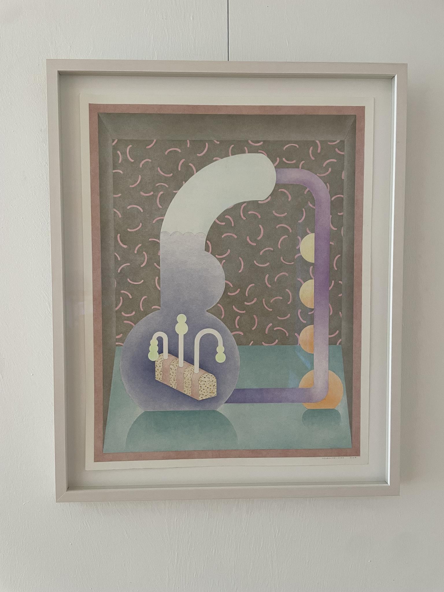 JaJa’s highly precise pictorial play, based on the anatomy of the letters, with abstract forms invented for each letter, entices us to follow this play in our minds; the coloration of the letter bodies she has found with color-saturated neon colors from Faber-Castell awakens our desire to see: the ochre-yellow dot on the letter I is supported by four thin columns whose neon yellow becomes darker towards the top. The ochre of the dot and the neon yellow of the columns are surrounded by a dark gray. The neon yellow columns stand on the upper end of a column shaft made up of six violet circles, which rests on a magenta-colored base. The magenta and violet of this column shaft is embedded in a light neon green, reminiscent of the underside of a green woodpecker or of spring meadows tipping into a light blue.