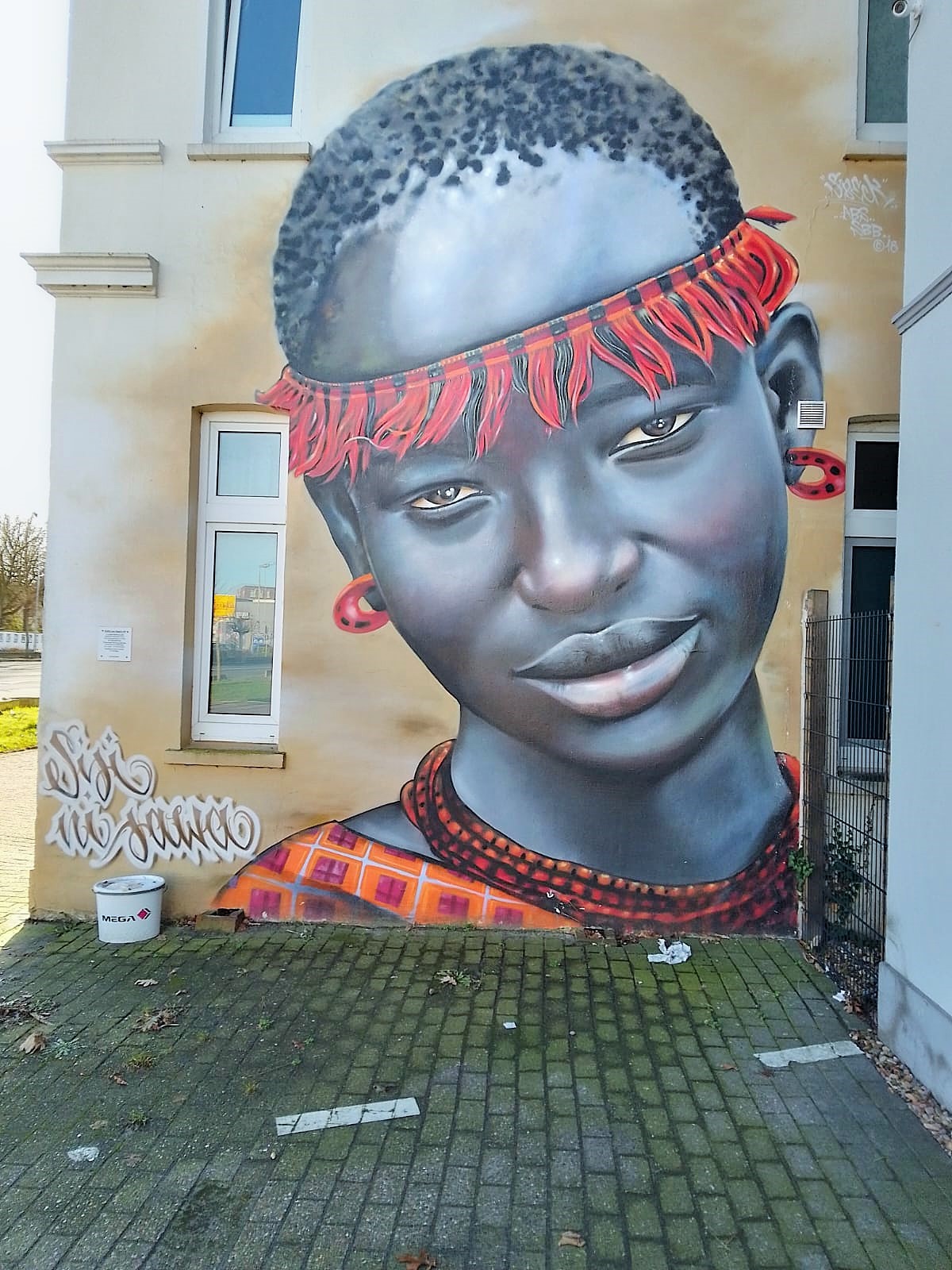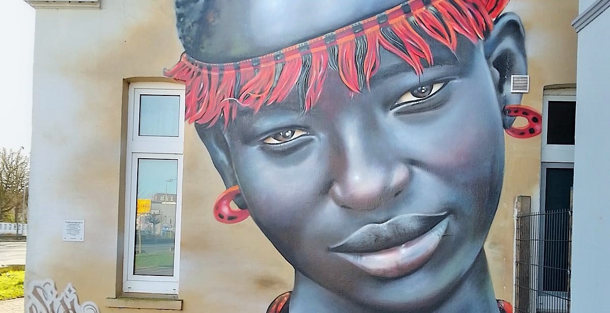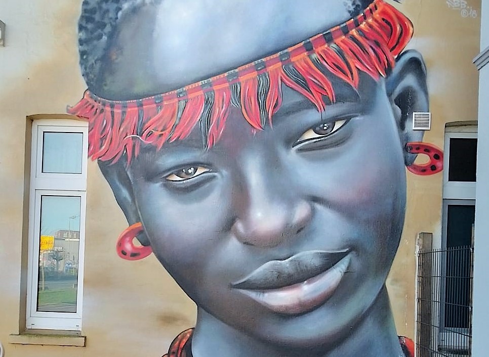 „Sisi ni sawa“ is Swahili and means „We are the same“. The mural is part of the project Kultur aus Tausch, which means „Cultural Exchange“ in English. It is the fourth work in this series initiated by the local artist SBEK, in which he creates portraits of people of different origins. There is a small information board for each of the murals and you can find more artworks in the city like Keno Veith from Cameroon in Burgstraße or a Balinese woman in Ofener Straße.