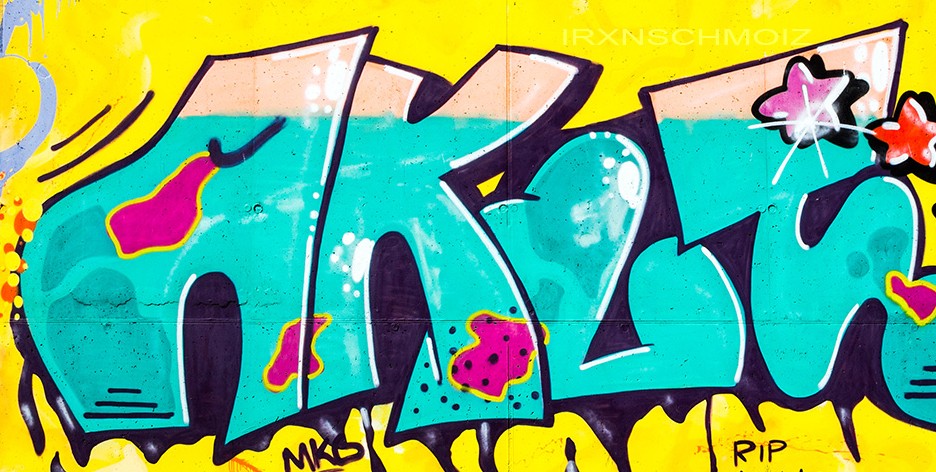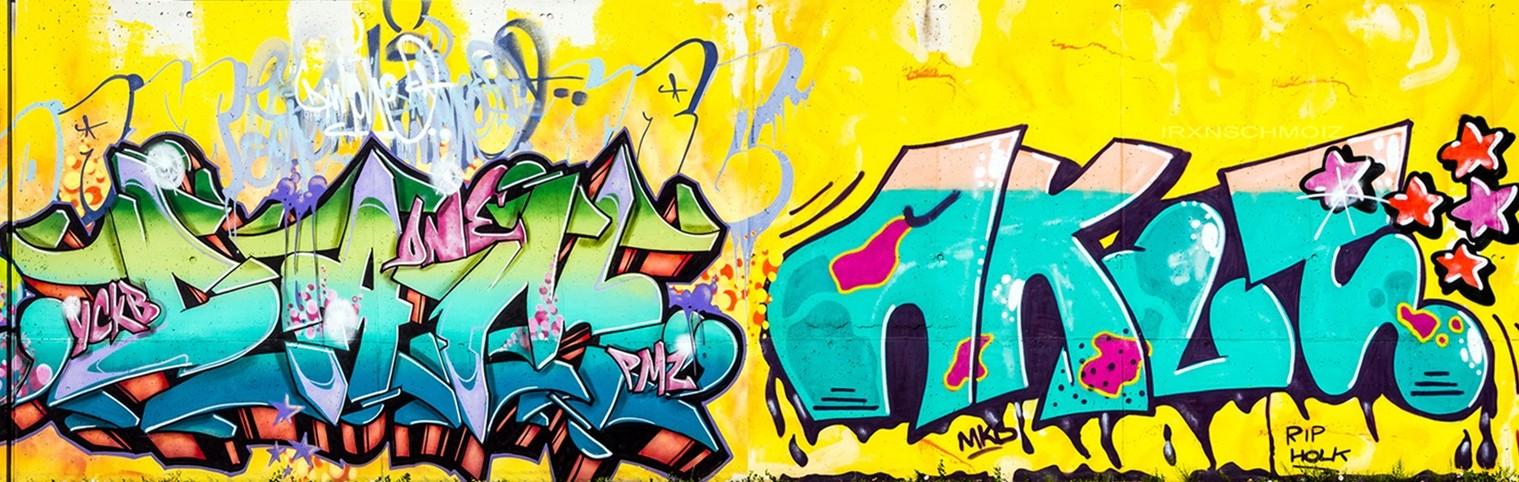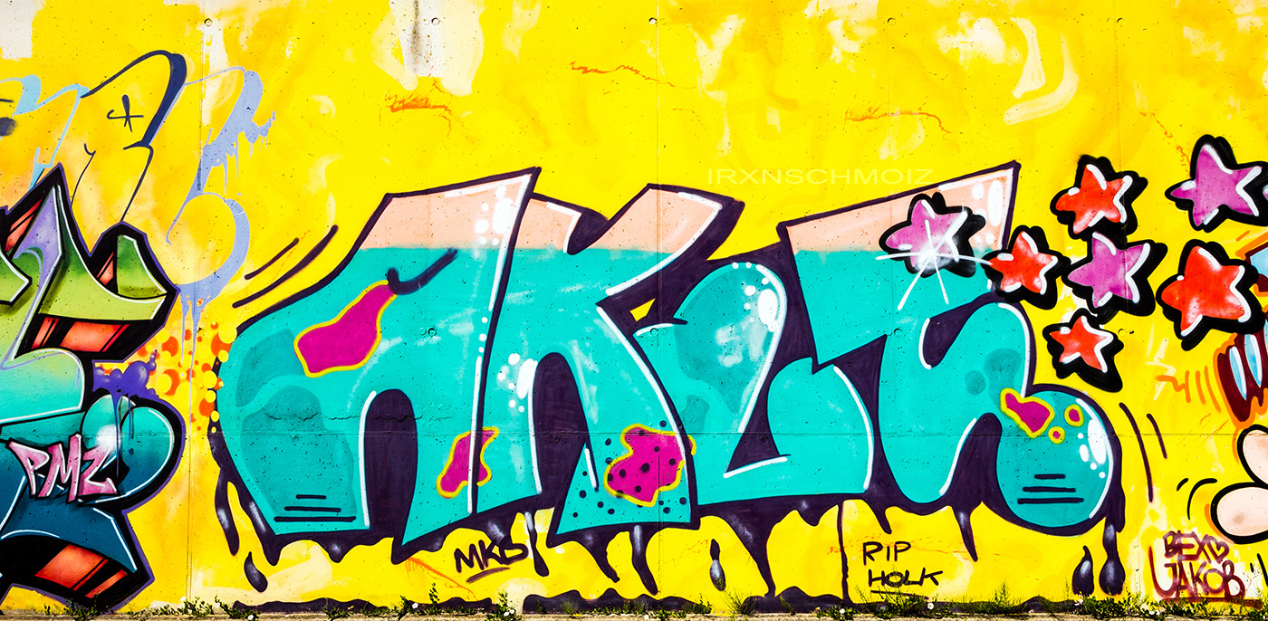 During the FARBFLUT festival in 2018 several artists collaborated on this part of the wall. They chose yellow as the background color. A vibrant yellow, and cool graffiti in the foreground. The graffiti were made from left to right by YET, MYNS, DAM ONE, AKUT, LAN, SINC, HOTE and WATER