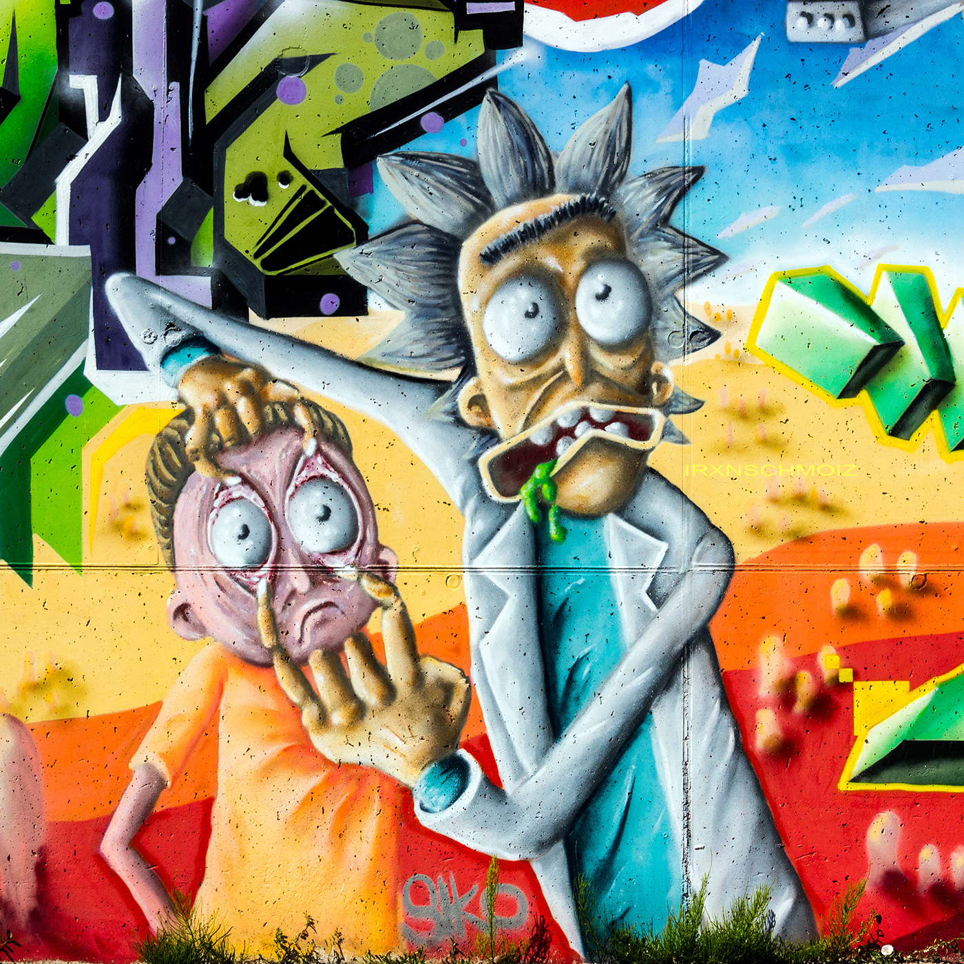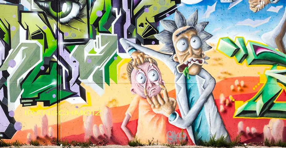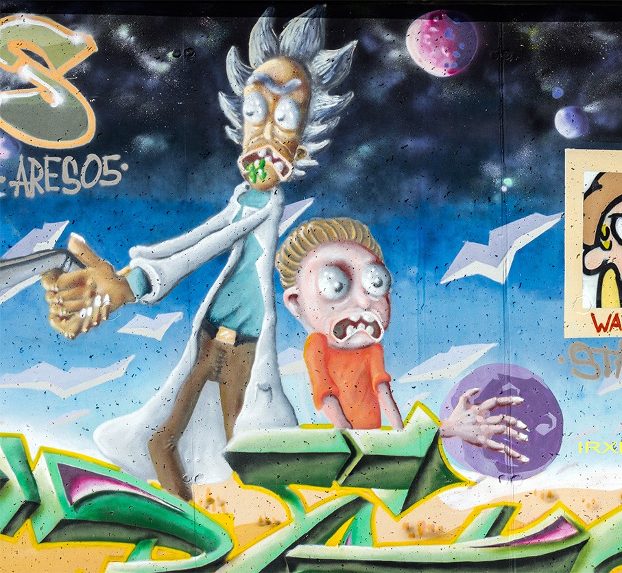 This great concept wall as tribute to the comic series Rick and Morty was made by several artists. B-BASE created the character on the far left, SIKO ORTNER made the graffiti on the left below, the following graffiti and Freddy Krueger were made by CRAZY MISTER SKETCH, the two times Rick and Morty characters are from ARES 05, the graffiti on the right below is from RATE and the wanted poster and screaming pixel boy are from STAK 42