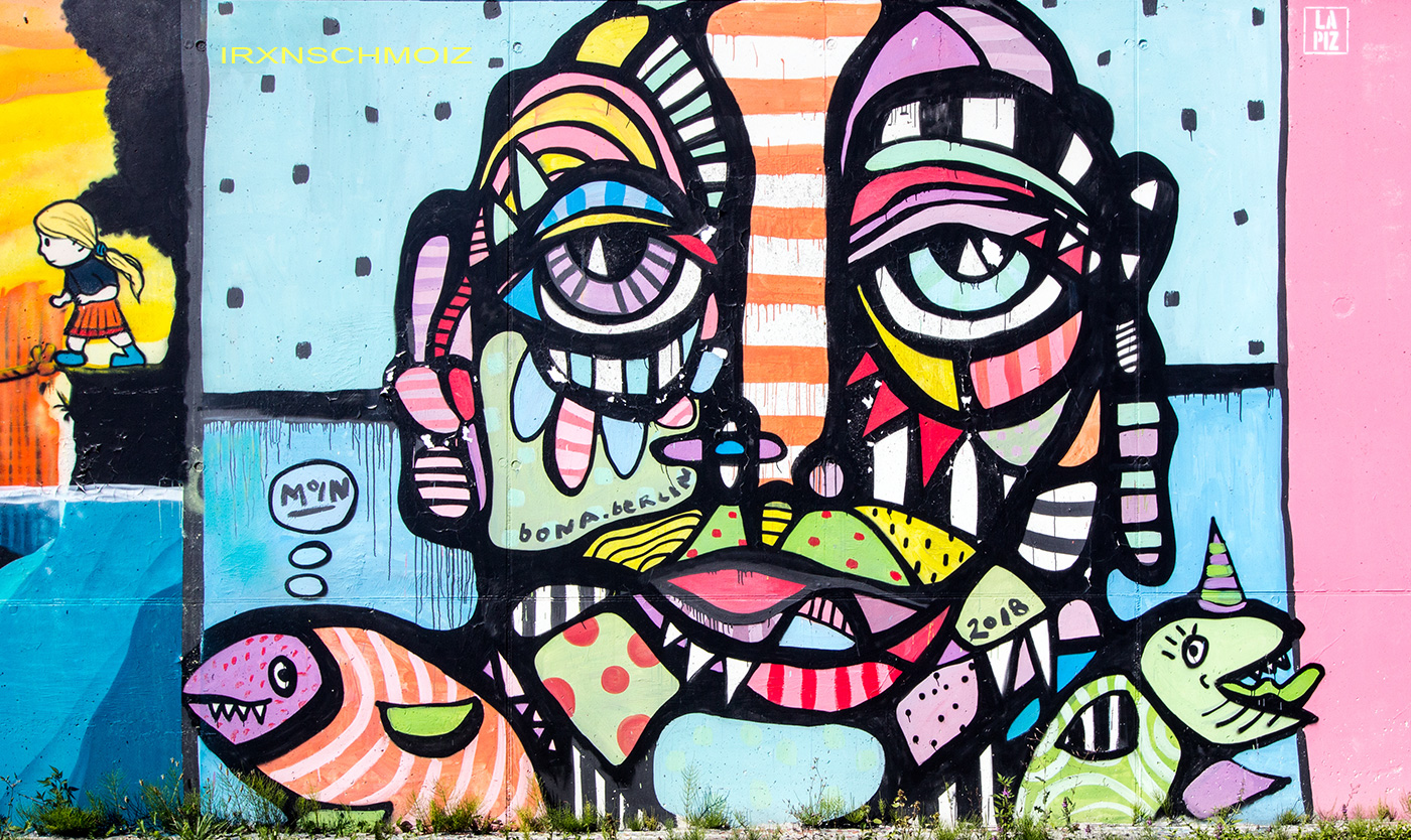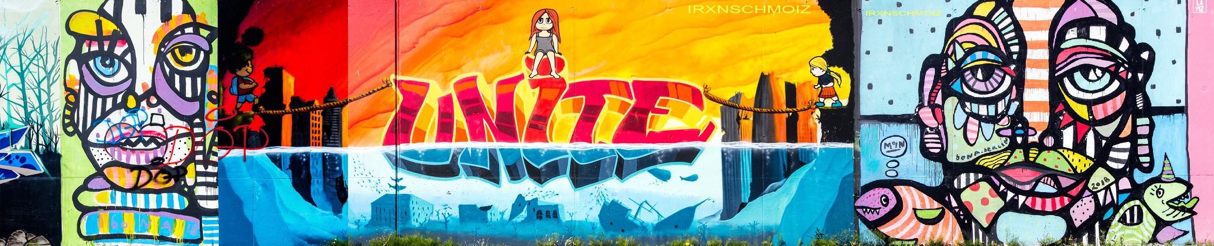 The „Unite“ artwork in the middle was created during a graffiti workshop by the art agency MIB aka MAKE IT BRIGHT. This artwork was made in November 2019 after the FARBFLUT urban art festival, which happened in June 2018. We don’t know which artwork has been there before from the festival, if you have more photos or information, send them to info@vagabundler.com and we will add them to the archive.