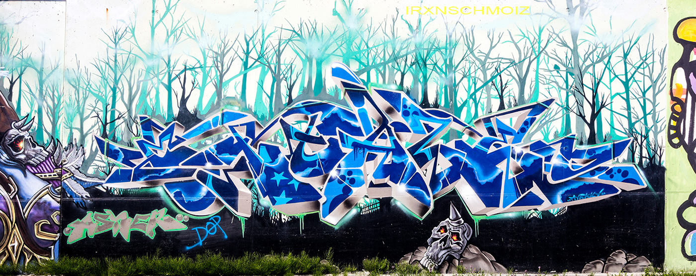 This great collaboration concept wall was made by members of the crews PMZ and WKM. The artworks from left to right were made by BERS, NOE aka SLIN, ANIS, ASHER and EXTASE