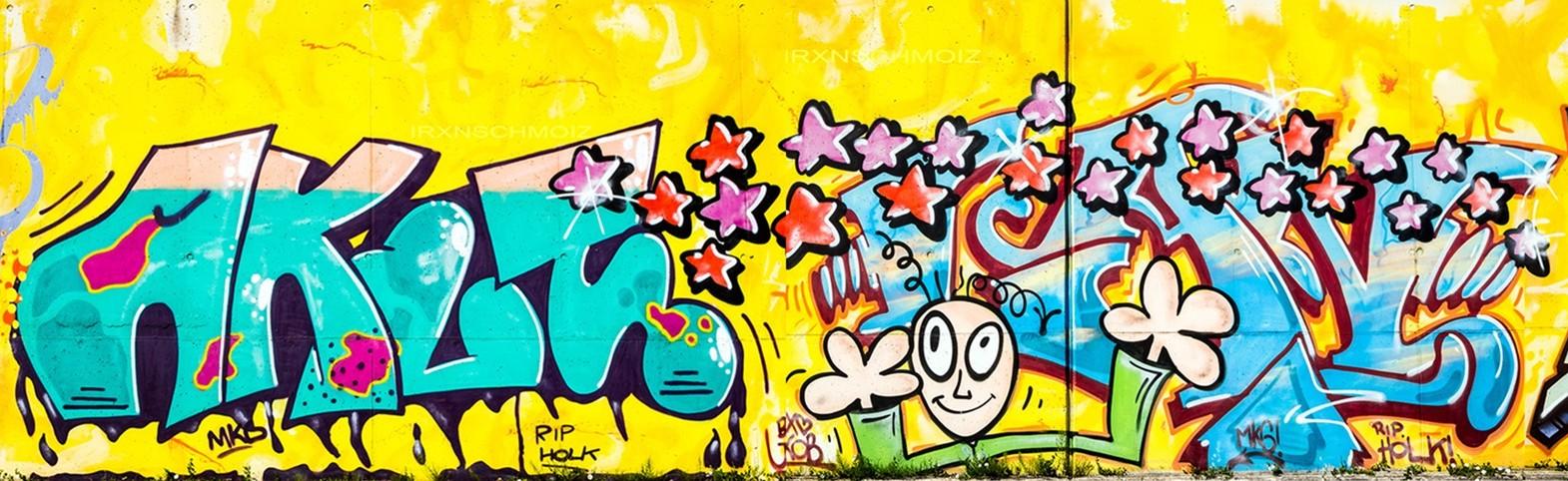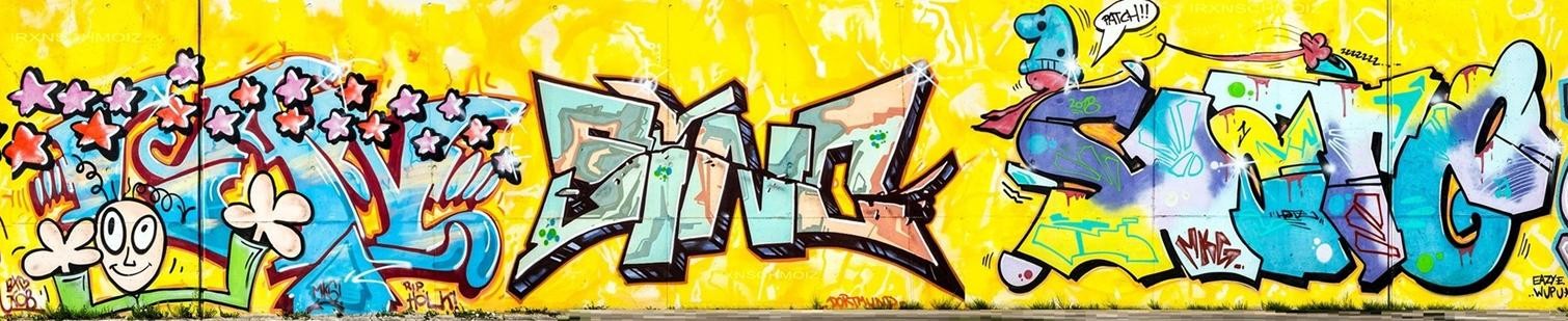 During the FARBFLUT festival in 2018 several artists collaborated on this part of the wall. They chose yellow as the background color. A vibrant yellow, and cool graffiti in the foreground. The graffiti were made from left to right by YET, MYNS, DAM ONE, AKUT, LAN, SINC, HOTE and WATER