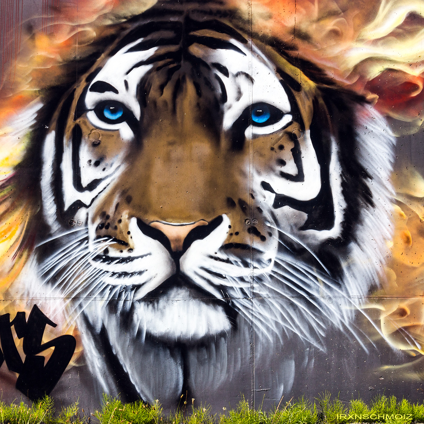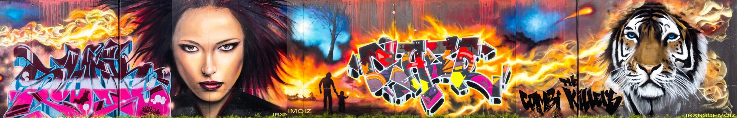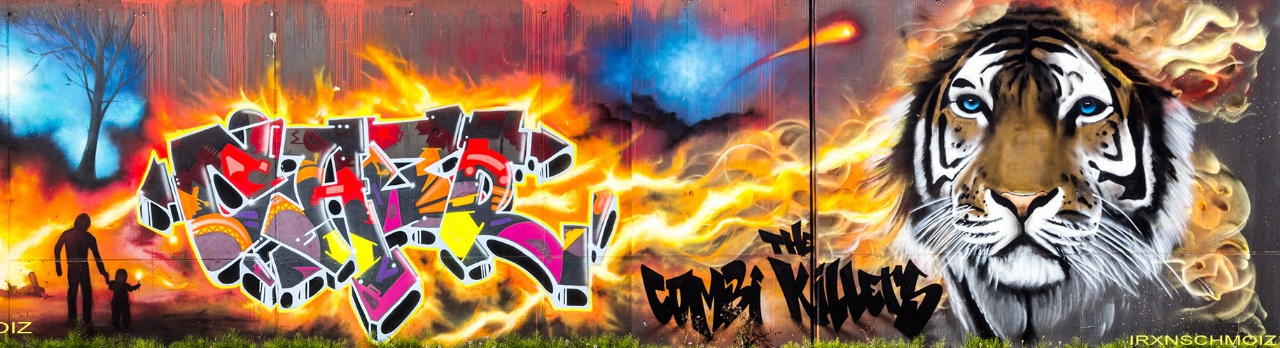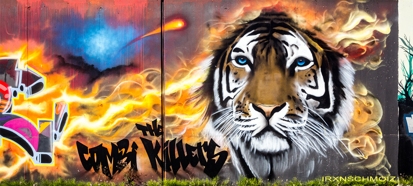 This great collaboration wall was made by the TCK CREW aka THE COMBI KILLERS from the Netherlands. The portrait on the left is from MARC ART, the graffiti on the left was made by SWOK, the face in the middle is from SPERM aka EL 23, the following graffiti is from CAER and the tiger on the right was made by NICKY NAHAFAHIK aka NINA.
