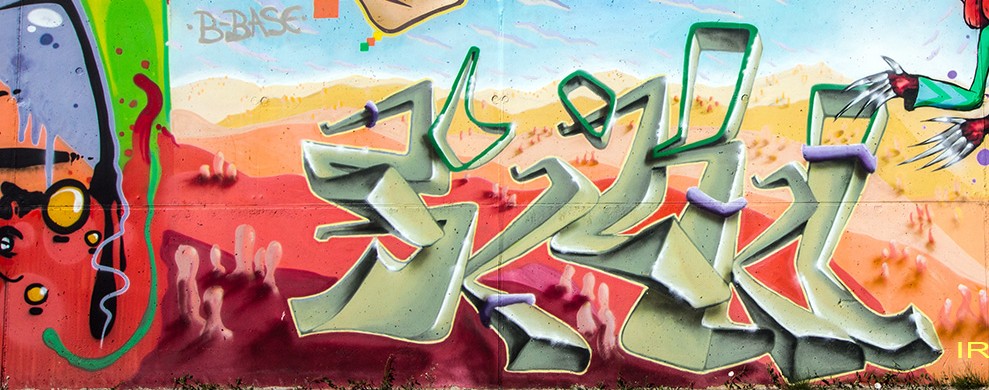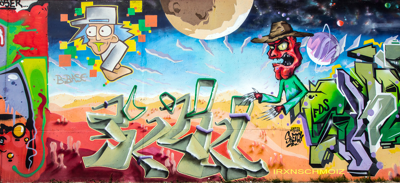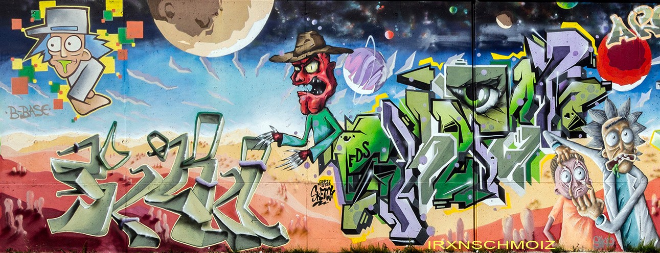 This great concept wall as tribute to the comic series Rick and Morty was made by several artists. B-BASE created the character on the far left, SIKO ORTNER made the graffiti on the left below, the following graffiti and Freddy Krueger were made by CRAZY MISTER SKETCH, the two times Rick and Morty characters are from ARES 05, the graffiti on the right below is from RATE and the wanted poster and screaming pixel boy are from STAK 42