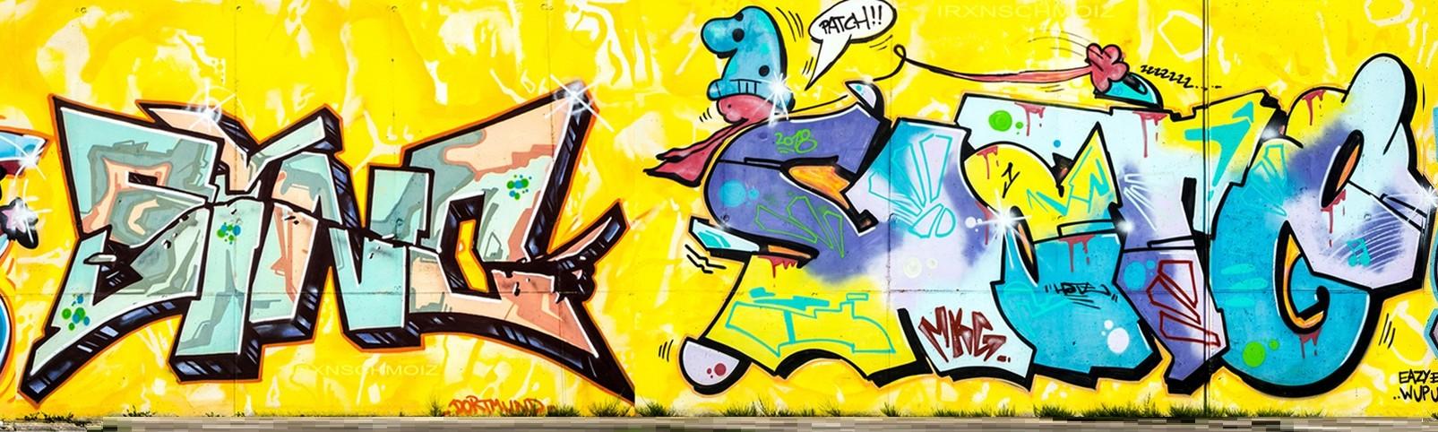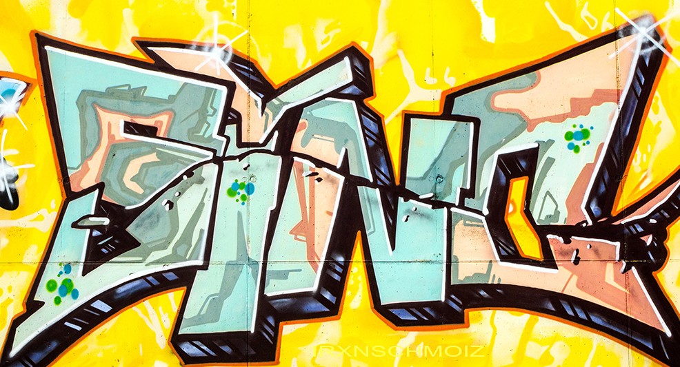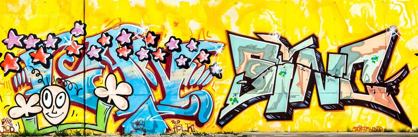 During the FARBFLUT festival in 2018 several artists collaborated on this part of the wall. They chose yellow as the background color. A vibrant yellow, and cool graffiti in the foreground. The graffiti were made from left to right by YET, MYNS, DAM ONE, AKUT, LAN, SINC, HOTE and WATER
