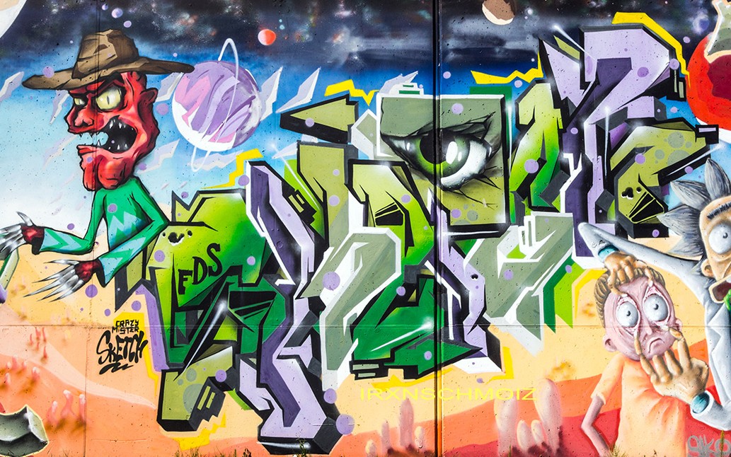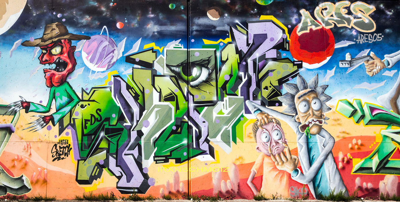 This great concept wall as tribute to the comic series Rick and Morty was made by several artists. B-BASE created the character on the far left, SIKO ORTNER made the graffiti on the left below, the following graffiti and Freddy Krueger were made by CRAZY MISTER SKETCH, the two times Rick and Morty characters are from ARES 05, the graffiti on the right below is from RATE and the wanted poster and screaming pixel boy are from STAK 42