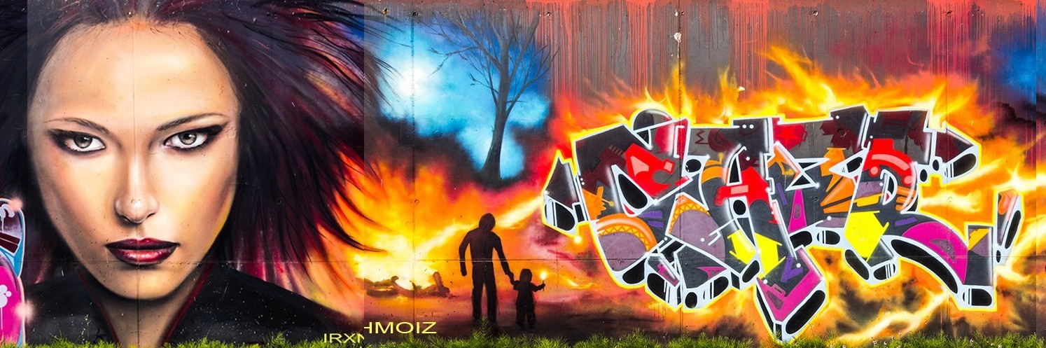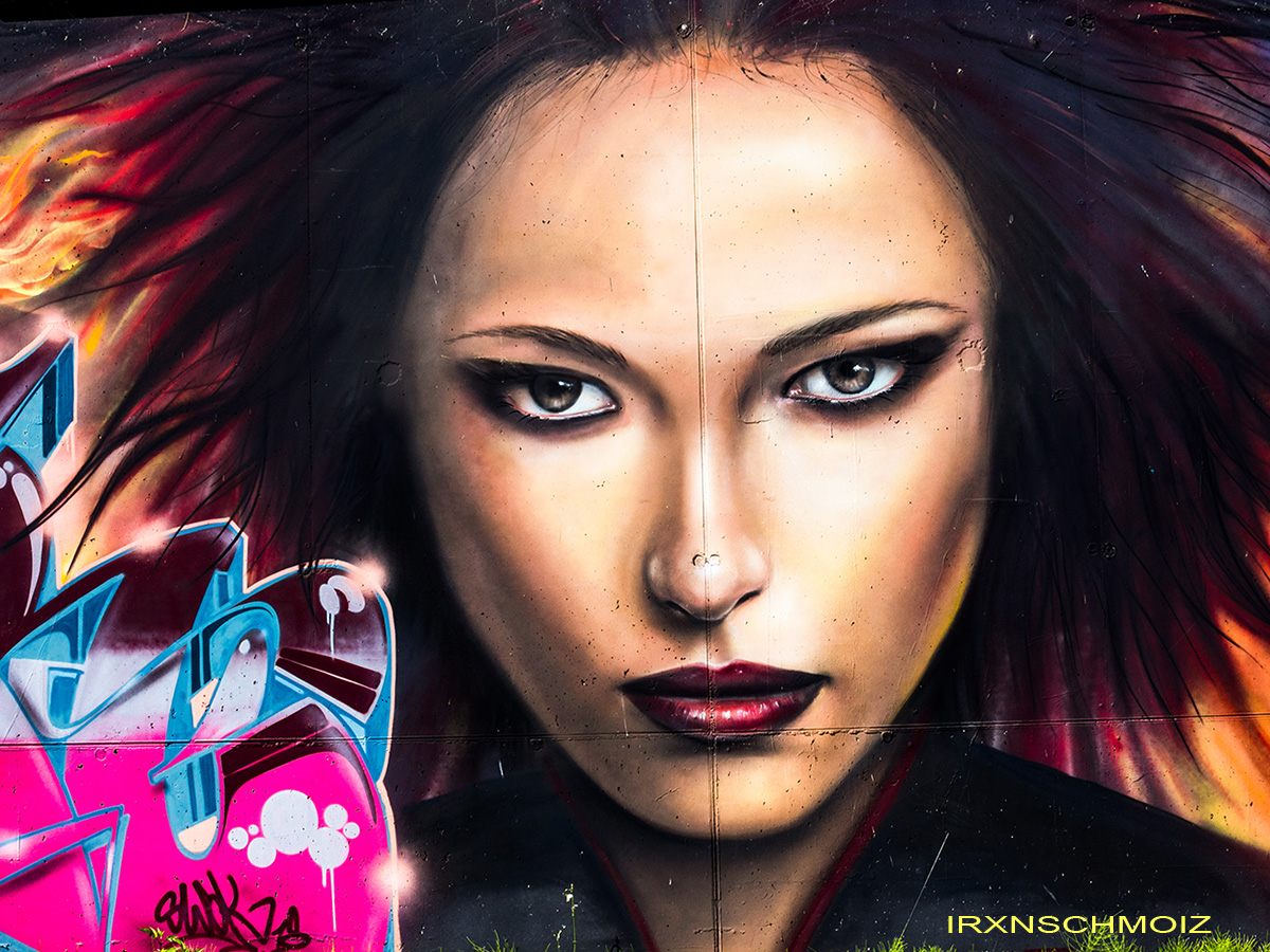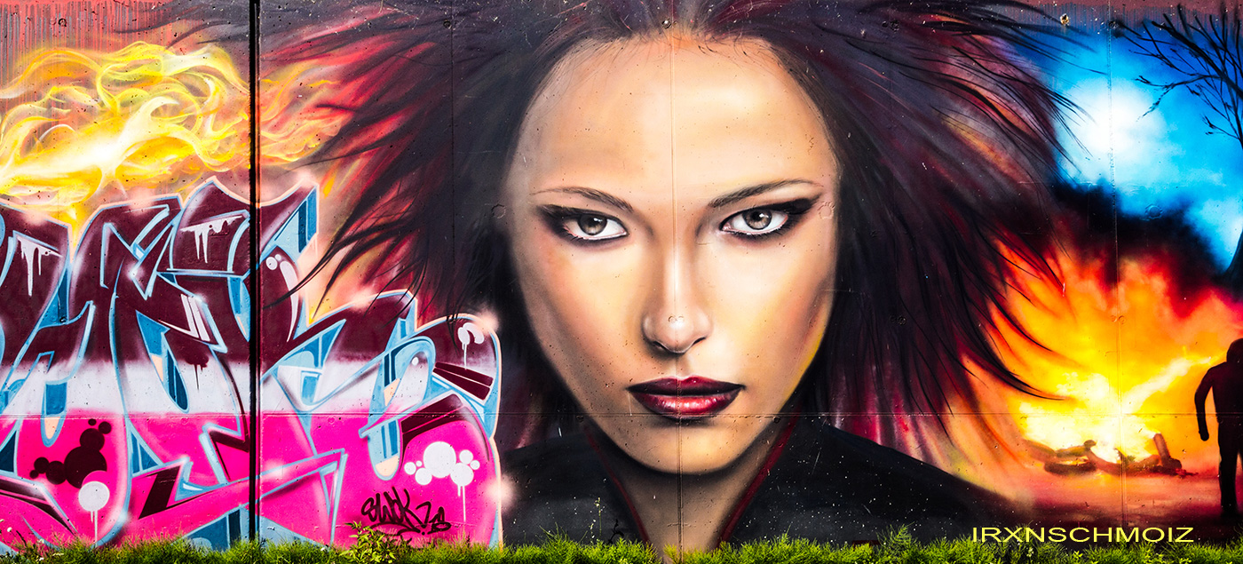 This great collaboration wall was made by the TCK CREW aka THE COMBI KILLERS from the Netherlands. The portrait on the left is from MARC ART, the graffiti on the left was made by SWOK, the face in the middle is from SPERM aka EL 23, the following graffiti is from CAER and the tiger on the right was made by NICKY NAHAFAHIK aka NINA.