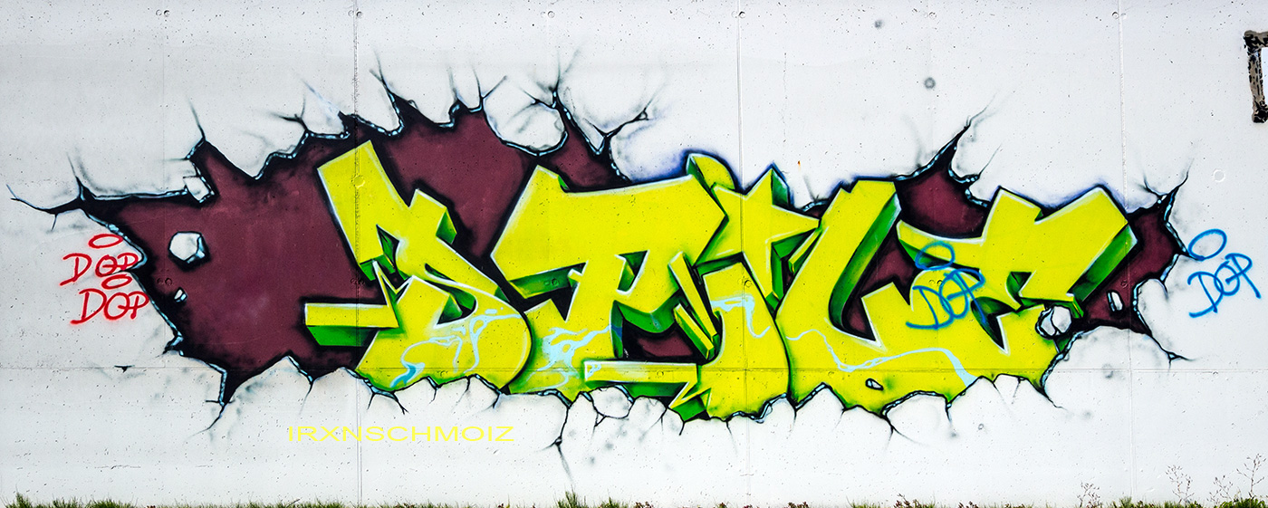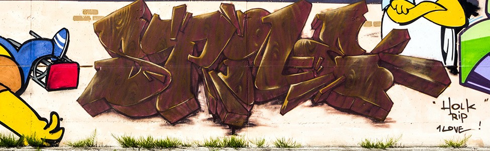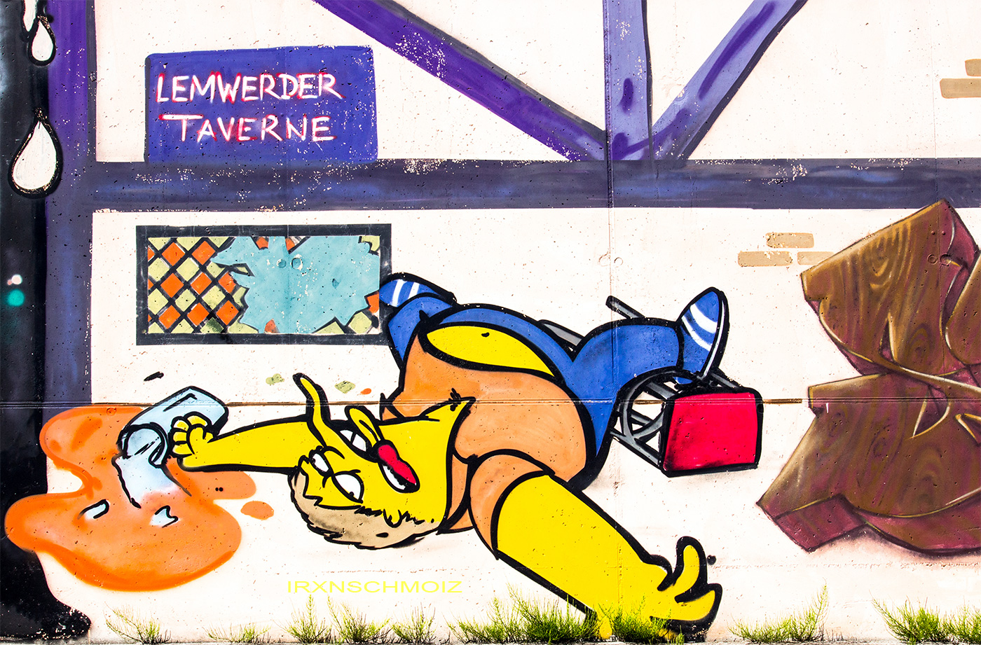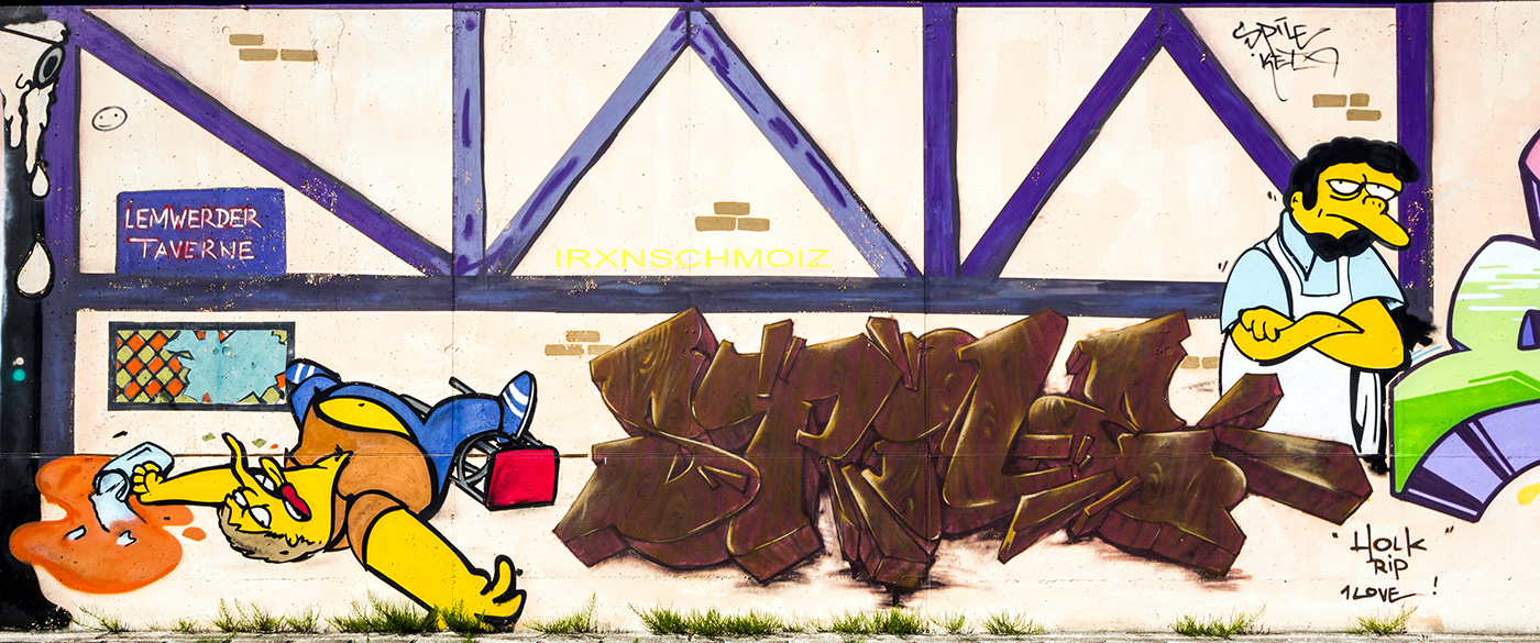 The graffiti on the right is from SEYK. Both artists created this cool Simpons theme together, with Moe’s bar and wasted Barney