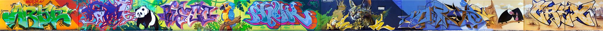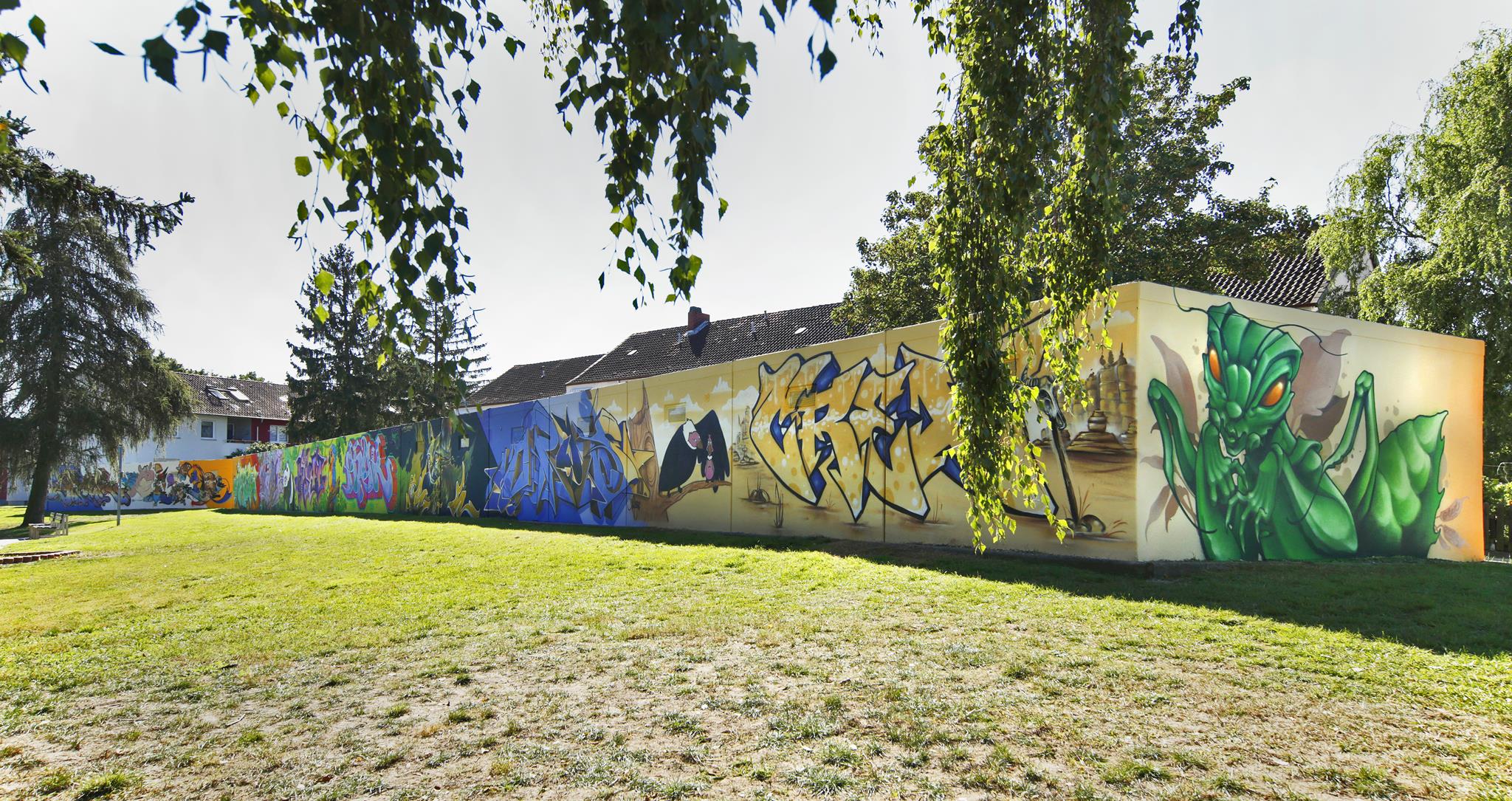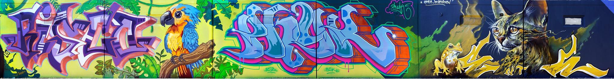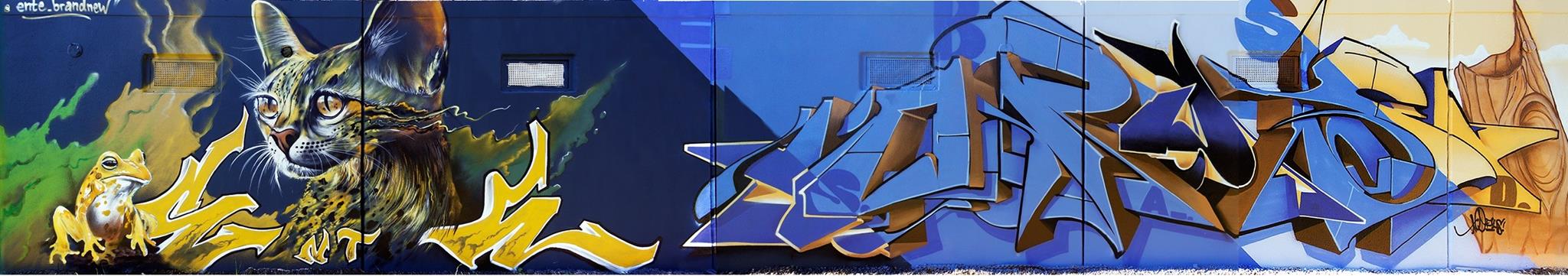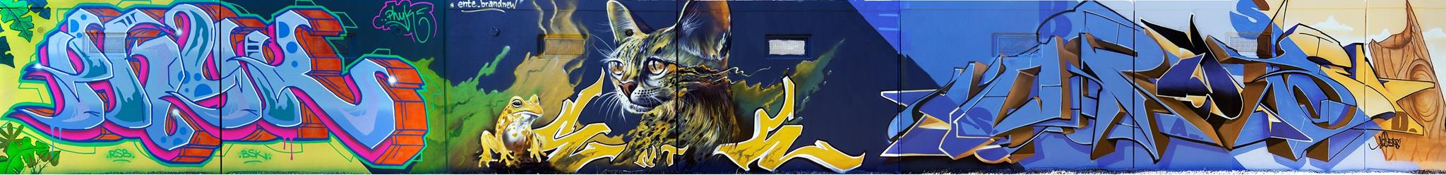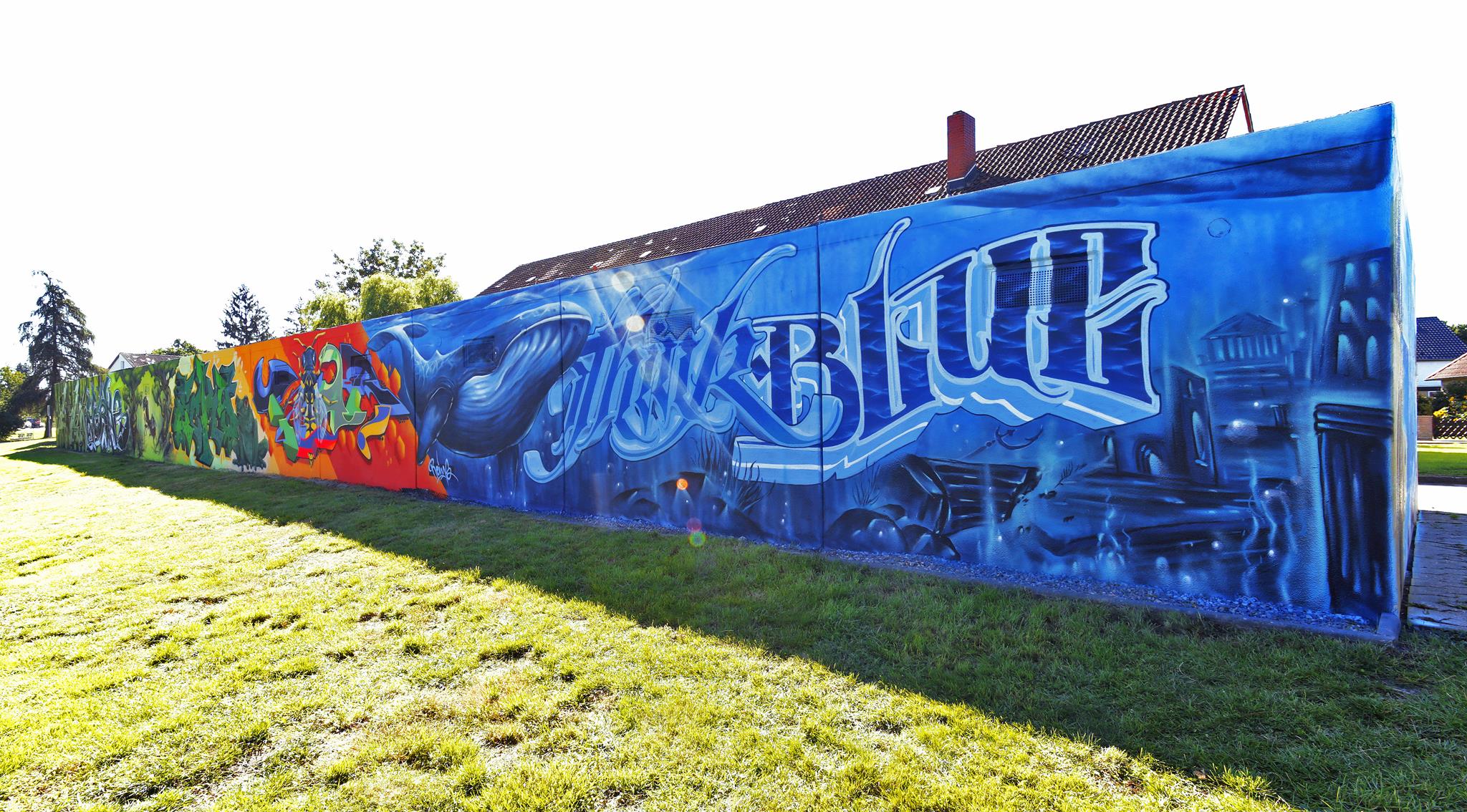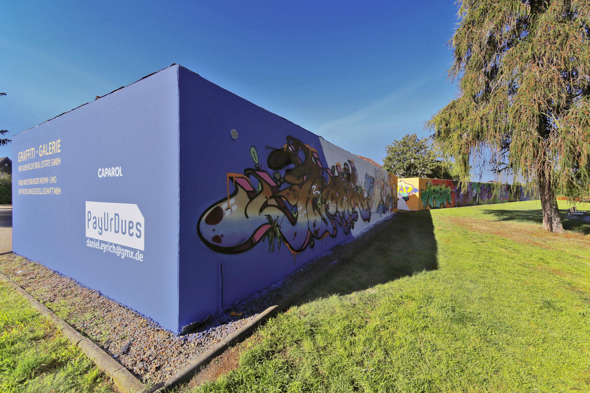 After the great first edition of the WOLFSBURG GRAFFITI JAM in 2020, this fantastic happening went into its second edition in 2023. The 150 meters long garage walls at Lindenstraße 31 in the Vorsfelde district were redesigned by 32 artists from September 1st to 3rd. This time the motto was „Save the animals“ and on a total of more than 400 m² fascinating natural landscapes were created in combination with graffiti writing and various animal characters. The event was once again organized by DANIEL EYRICH and the crew PAYURDUES with sponsorship from the paint manufacturers MOLOTOW and CAPAROL and supported by the housing associations VRE and WOB. Check out as well the page for the 1st jam edition in 2020. There are more pages about urban art in Wolfsburg in our archive, also have a look at the Hallenbad Hall at Schachtweg, the Sticker Collection and the page with Graffiti and Streetart around the city.