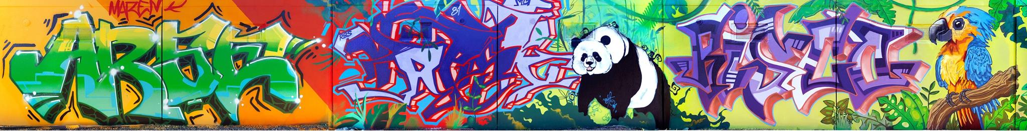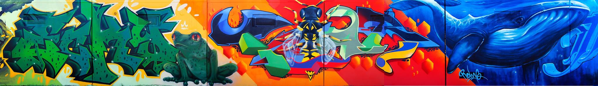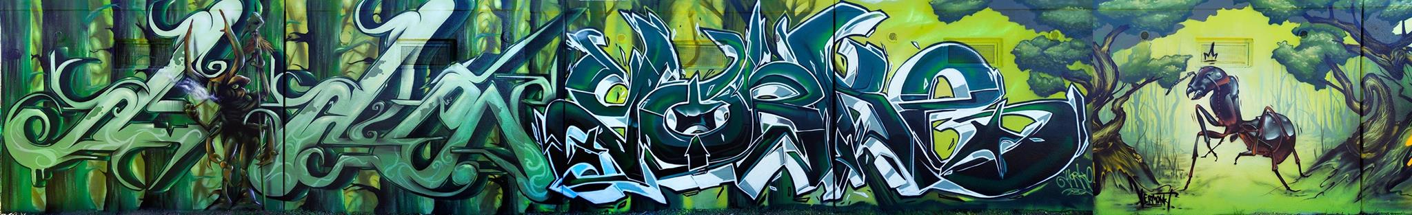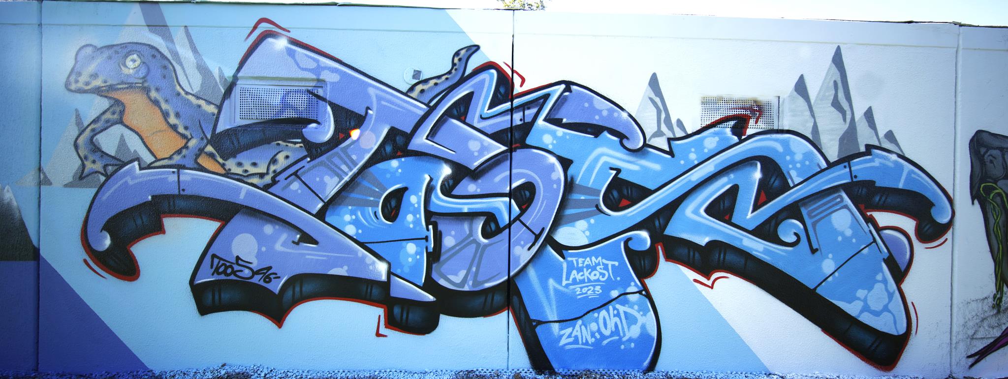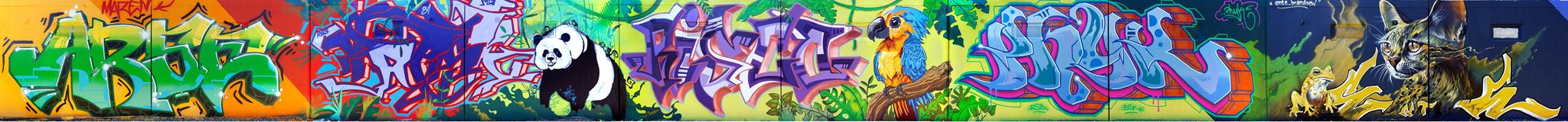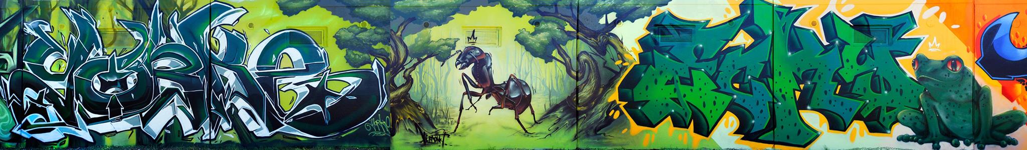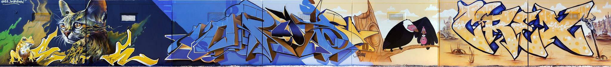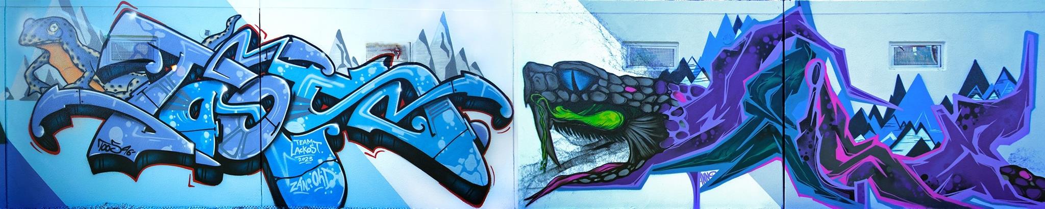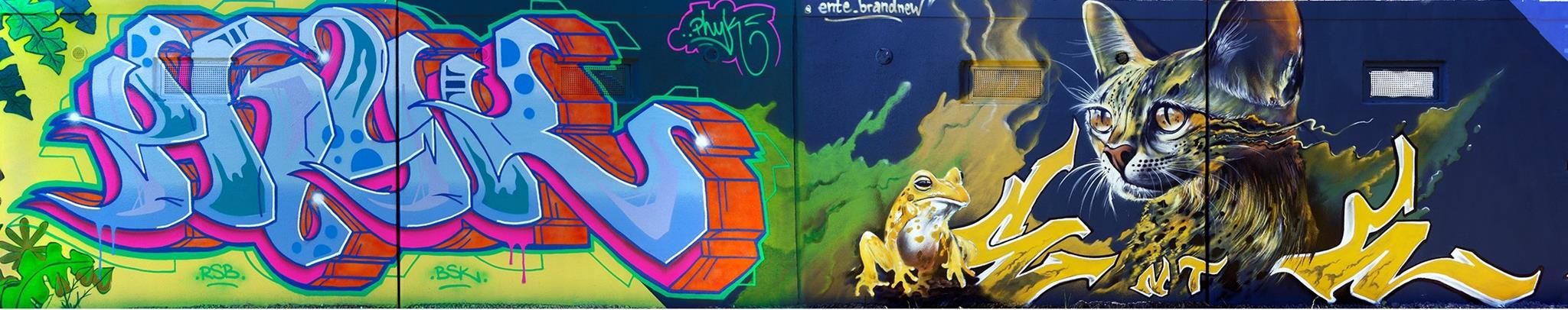 After the great first edition of the WOLFSBURG GRAFFITI JAM in 2020, this fantastic happening went into its second edition in 2023. The 150 meters long garage walls at Lindenstraße 31 in the Vorsfelde district were redesigned by 32 artists from September 1st to 3rd. This time the motto was „Save the animals“ and on a total of more than 400 m² fascinating natural landscapes were created in combination with graffiti writing and various animal characters. The event was once again organized by DANIEL EYRICH and the crew PAYURDUES with sponsorship from the paint manufacturers MOLOTOW and CAPAROL and supported by the housing associations VRE and WOB. Check out as well the page for the 1st jam edition in 2020. There are more pages about urban art in Wolfsburg in our archive, also have a look at the Hallenbad Hall at Schachtweg, the Sticker Collection and the page with Graffiti and Streetart around the city.