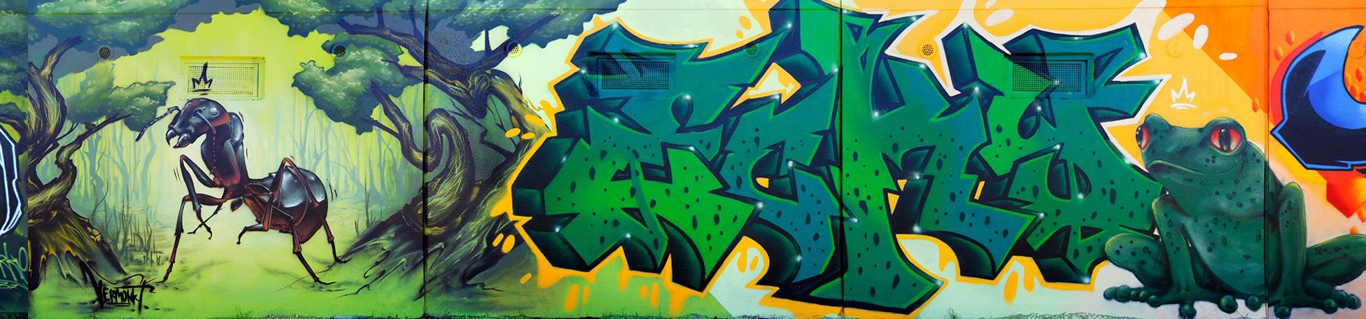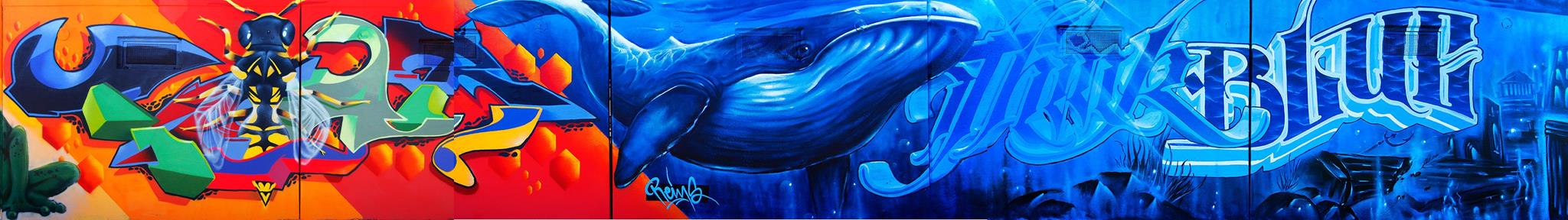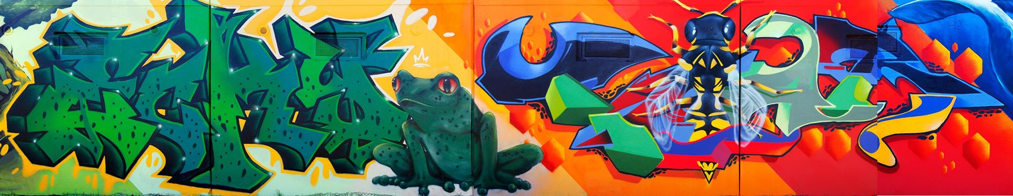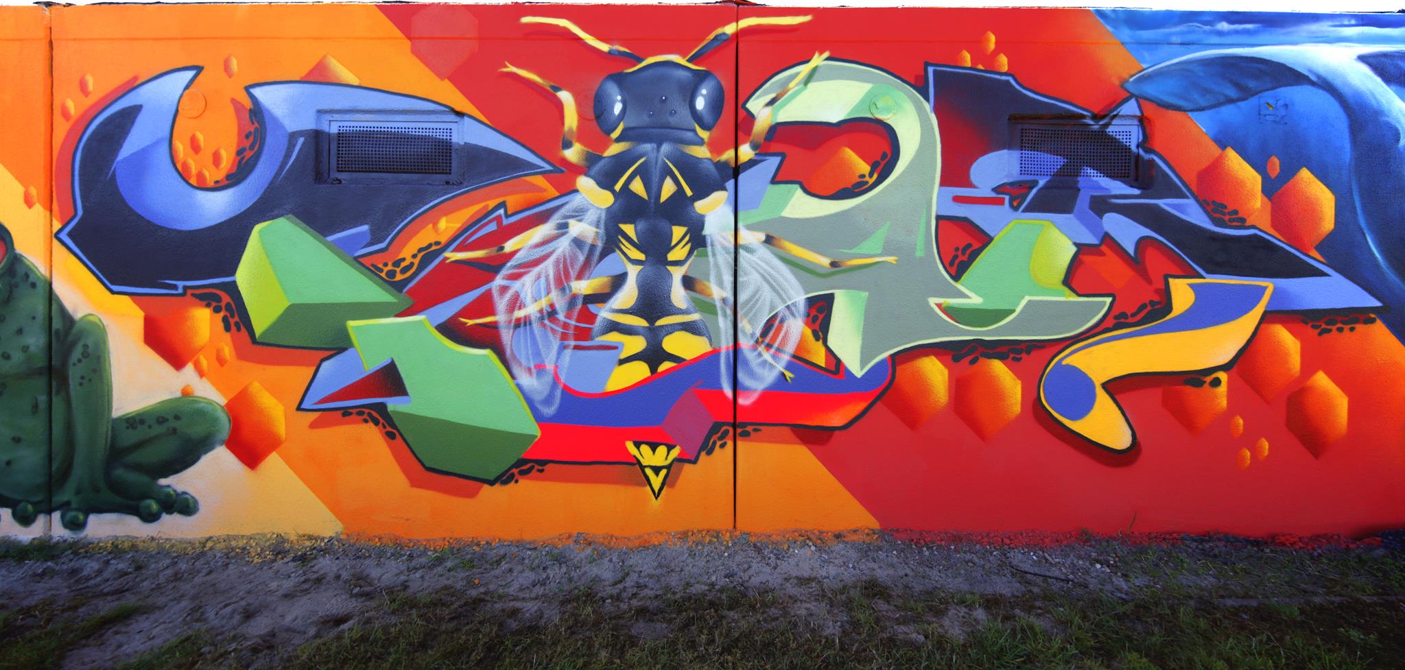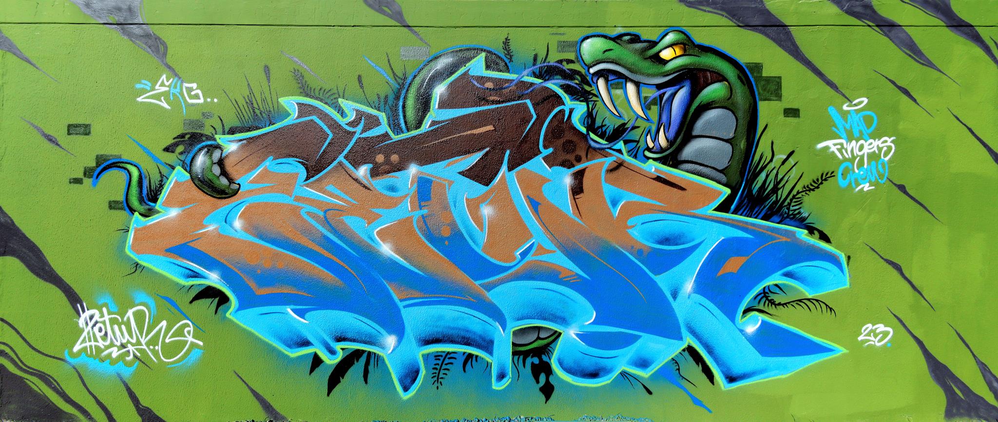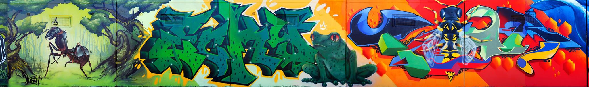 After the great first edition of the WOLFSBURG GRAFFITI JAM in 2020, this fantastic happening went into its second edition in 2023. The 150 meters long garage walls at Lindenstraße 31 in the Vorsfelde district were redesigned by 32 artists from September 1st to 3rd. This time the motto was „Save the animals“ and on a total of more than 400 m² fascinating natural landscapes were created in combination with graffiti writing and various animal characters. The event was once again organized by DANIEL EYRICH and the crew PAYURDUES with sponsorship from the paint manufacturers MOLOTOW and CAPAROL and supported by the housing associations VRE and WOB. Check out as well the page for the 1st jam edition in 2020. There are more pages about urban art in Wolfsburg in our archive, also have a look at the Hallenbad Hall at Schachtweg, the Sticker Collection and the page with Graffiti and Streetart around the city.