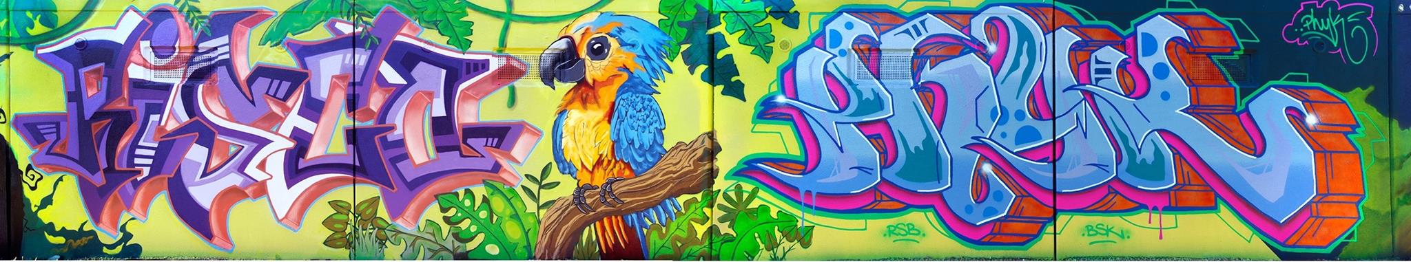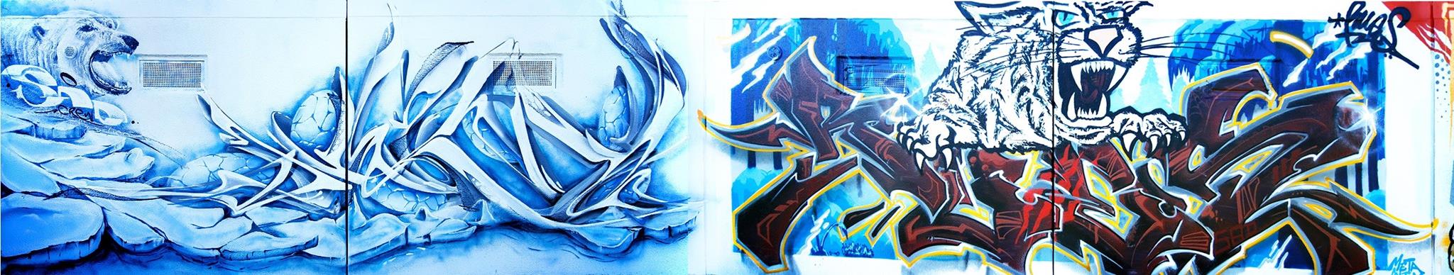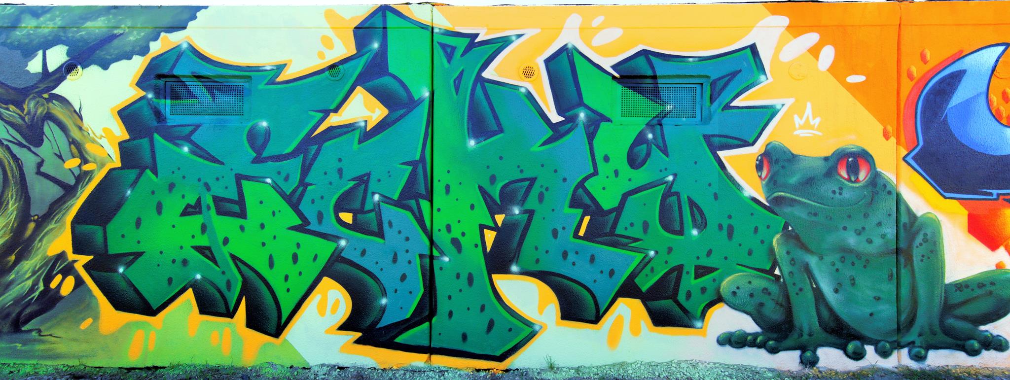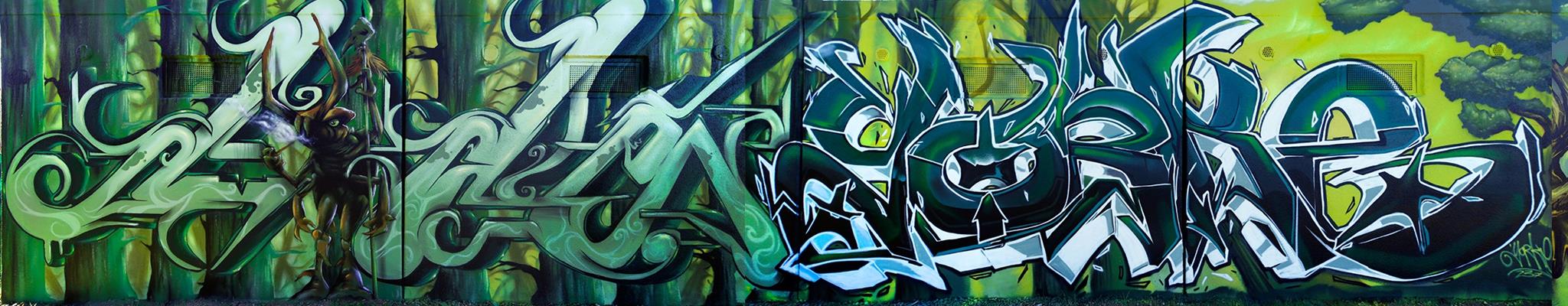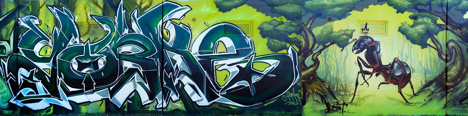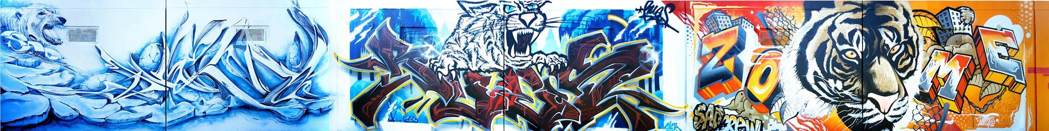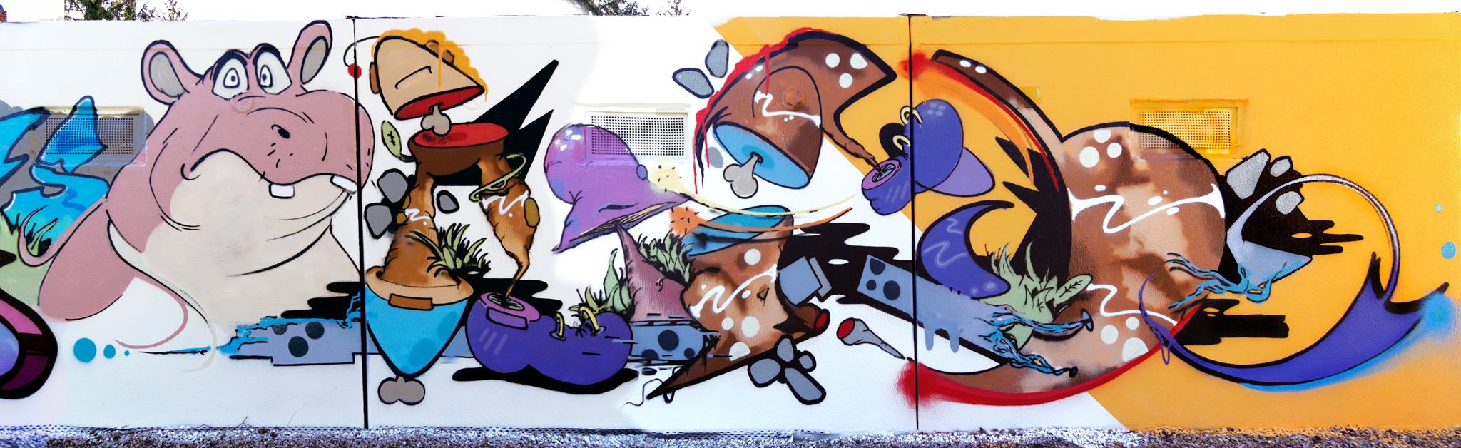 After the great first edition of the WOLFSBURG GRAFFITI JAM in 2020, this fantastic happening went into its second edition in 2023. The 150 meters long garage walls at Lindenstraße 31 in the Vorsfelde district were redesigned by 32 artists from September 1st to 3rd. This time the motto was „Save the animals“ and on a total of more than 400 m² fascinating natural landscapes were created in combination with graffiti writing and various animal characters. The event was once again organized by DANIEL EYRICH and the crew PAYURDUES with sponsorship from the paint manufacturers MOLOTOW and CAPAROL and supported by the housing associations VRE and WOB. Check out as well the page for the 1st jam edition in 2020. There are more pages about urban art in Wolfsburg in our archive, also have a look at the Hallenbad Hall at Schachtweg, the Sticker Collection and the page with Graffiti and Streetart around the city.