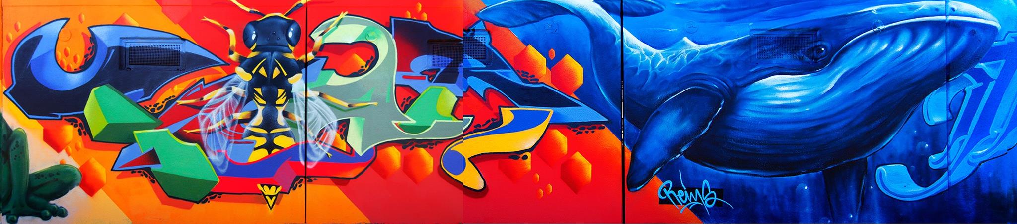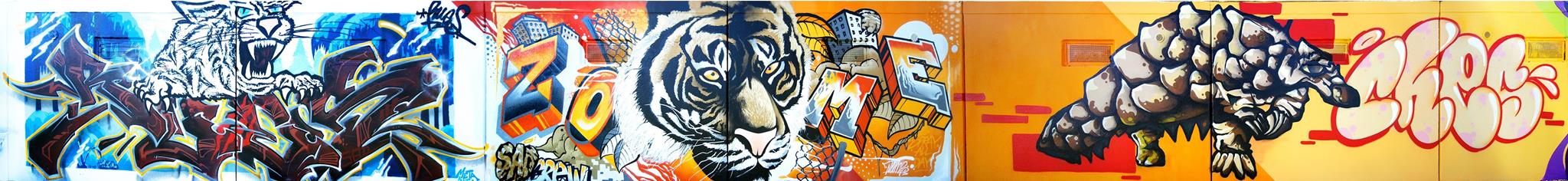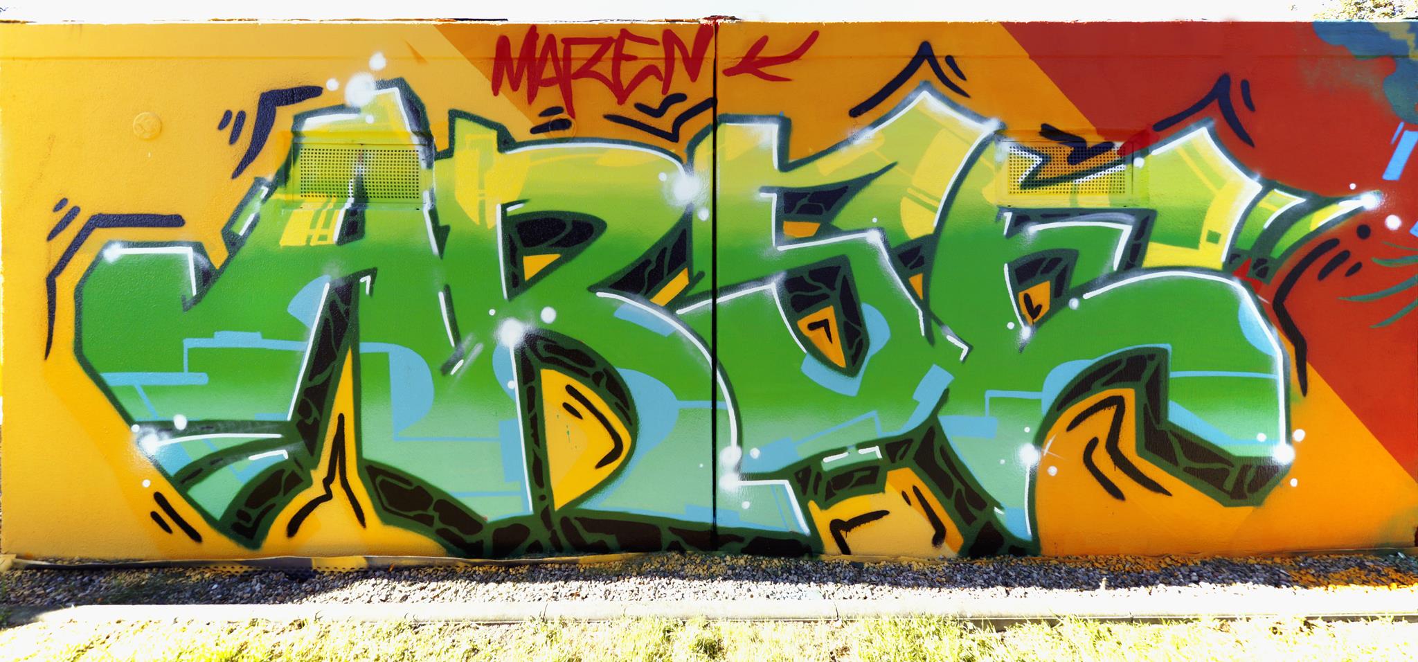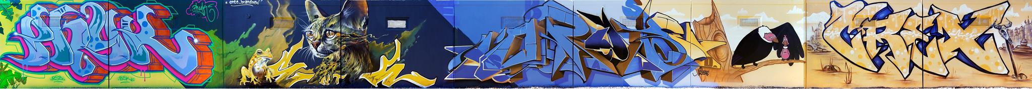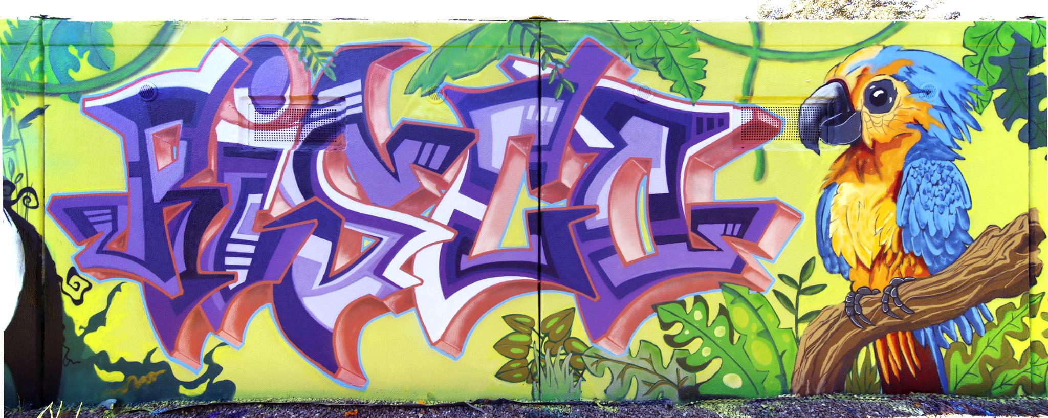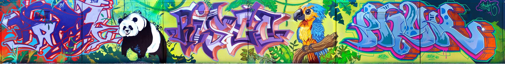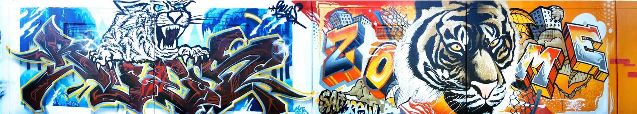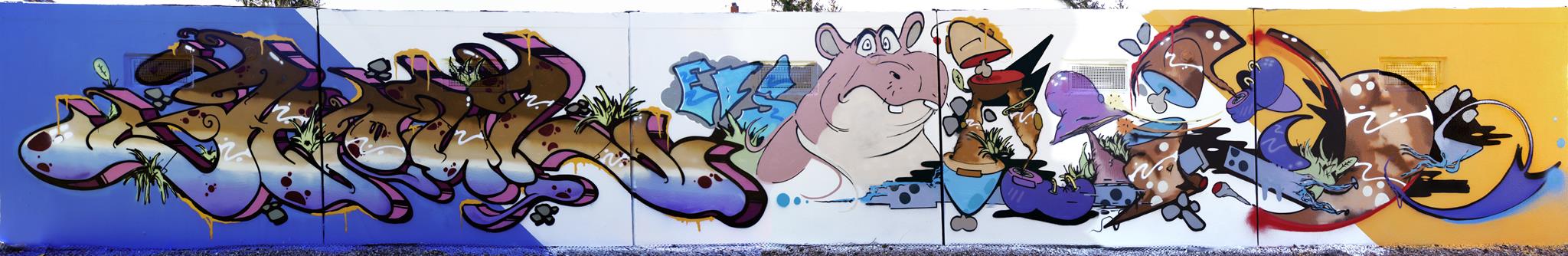 After the great first edition of the WOLFSBURG GRAFFITI JAM in 2020, this fantastic happening went into its second edition in 2023. The 150 meters long garage walls at Lindenstraße 31 in the Vorsfelde district were redesigned by 32 artists from September 1st to 3rd. This time the motto was „Save the animals“ and on a total of more than 400 m² fascinating natural landscapes were created in combination with graffiti writing and various animal characters. The event was once again organized by DANIEL EYRICH and the crew PAYURDUES with sponsorship from the paint manufacturers MOLOTOW and CAPAROL and supported by the housing associations VRE and WOB. Check out as well the page for the 1st jam edition in 2020. There are more pages about urban art in Wolfsburg in our archive, also have a look at the Hallenbad Hall at Schachtweg, the Sticker Collection and the page with Graffiti and Streetart around the city.