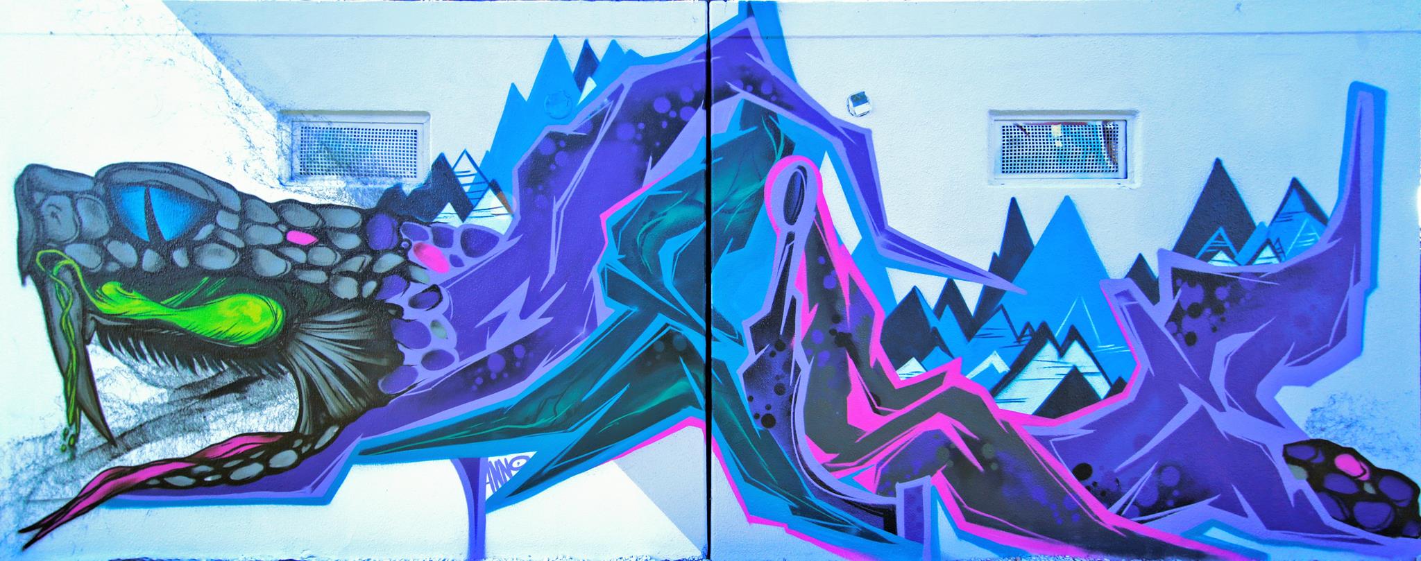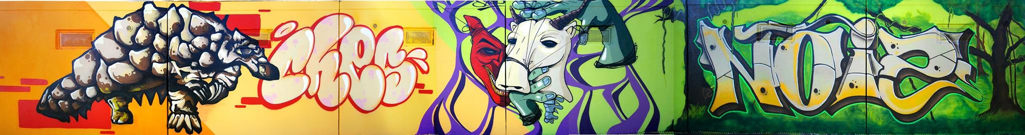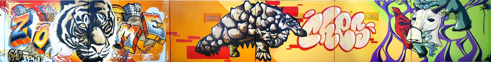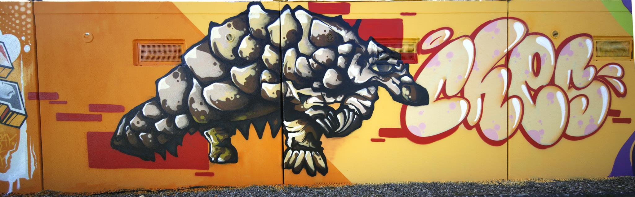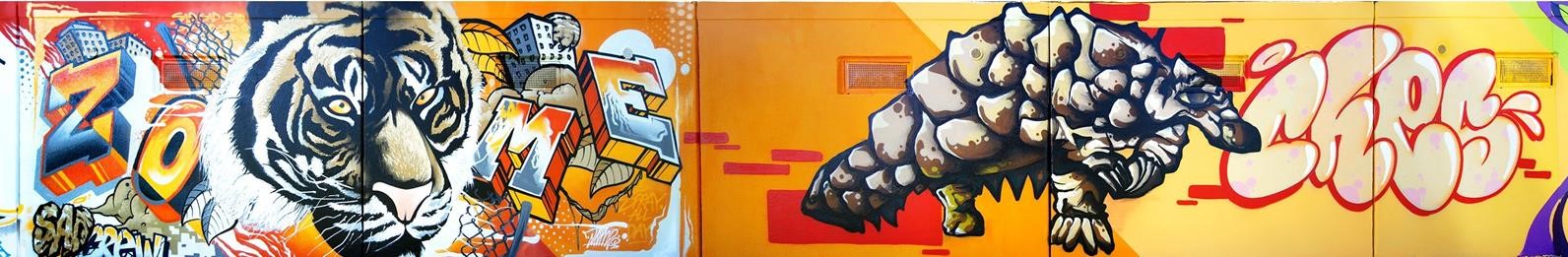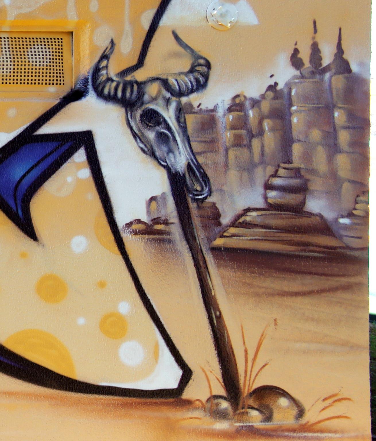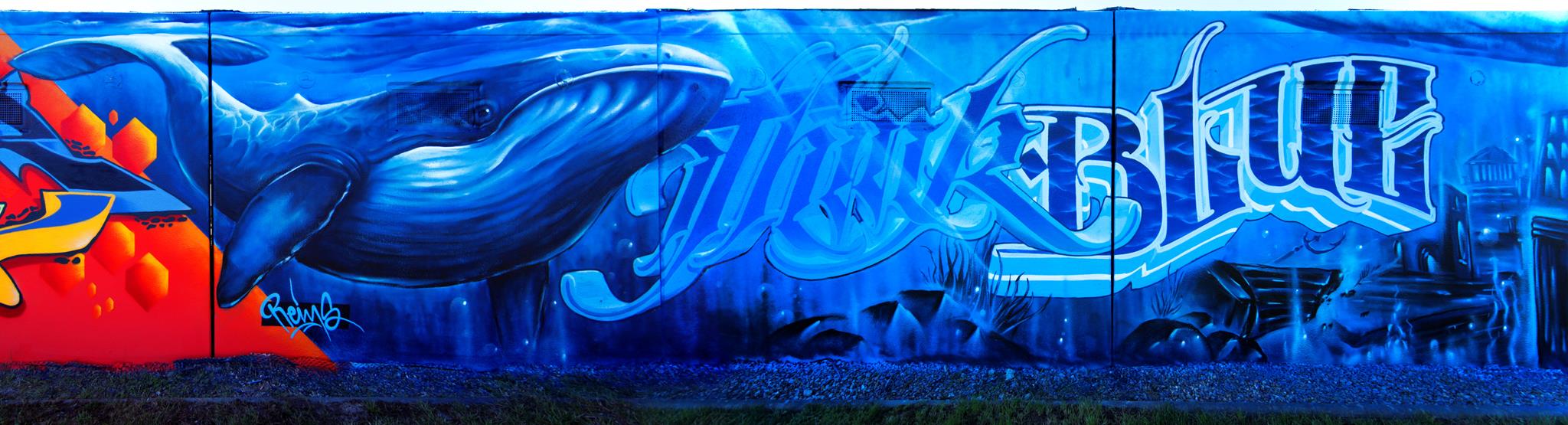 After the great first edition of the WOLFSBURG GRAFFITI JAM in 2020, this fantastic happening went into its second edition in 2023. The 150 meters long garage walls at Lindenstraße 31 in the Vorsfelde district were redesigned by 32 artists from September 1st to 3rd. This time the motto was „Save the animals“ and on a total of more than 400 m² fascinating natural landscapes were created in combination with graffiti writing and various animal characters. The event was once again organized by DANIEL EYRICH and the crew PAYURDUES with sponsorship from the paint manufacturers MOLOTOW and CAPAROL and supported by the housing associations VRE and WOB. Check out as well the page for the 1st jam edition in 2020. There are more pages about urban art in Wolfsburg in our archive, also have a look at the Hallenbad Hall at Schachtweg, the Sticker Collection and the page with Graffiti and Streetart around the city.