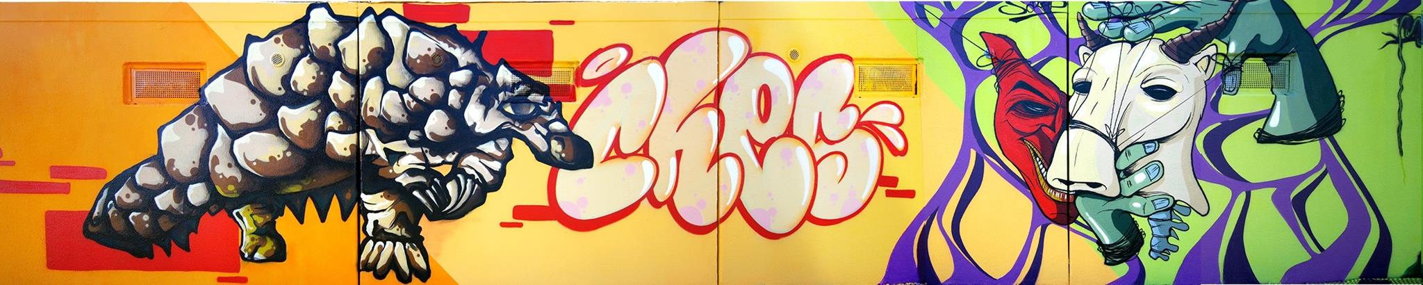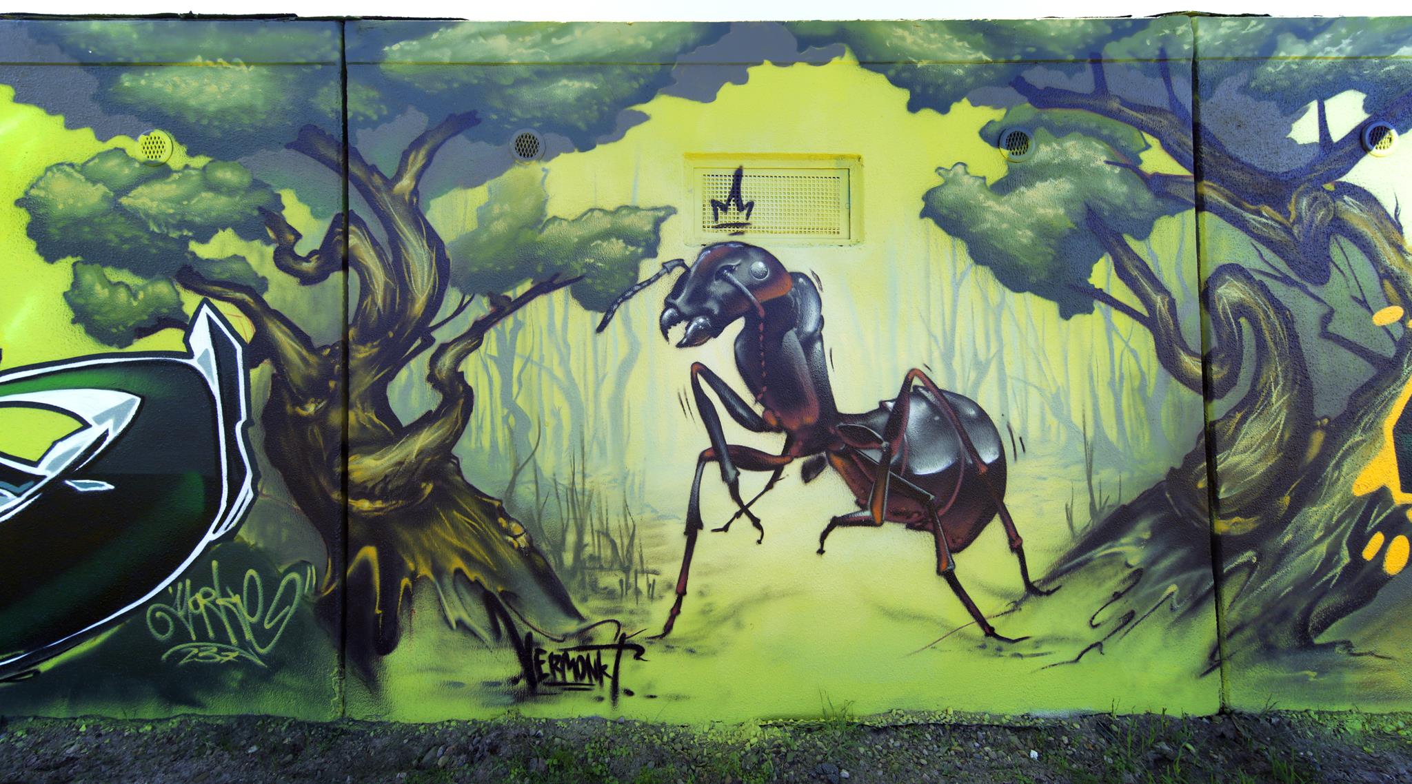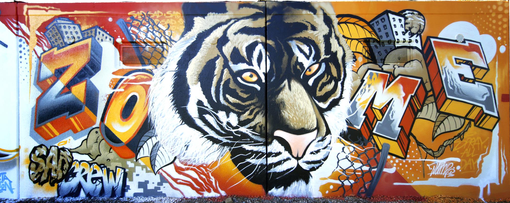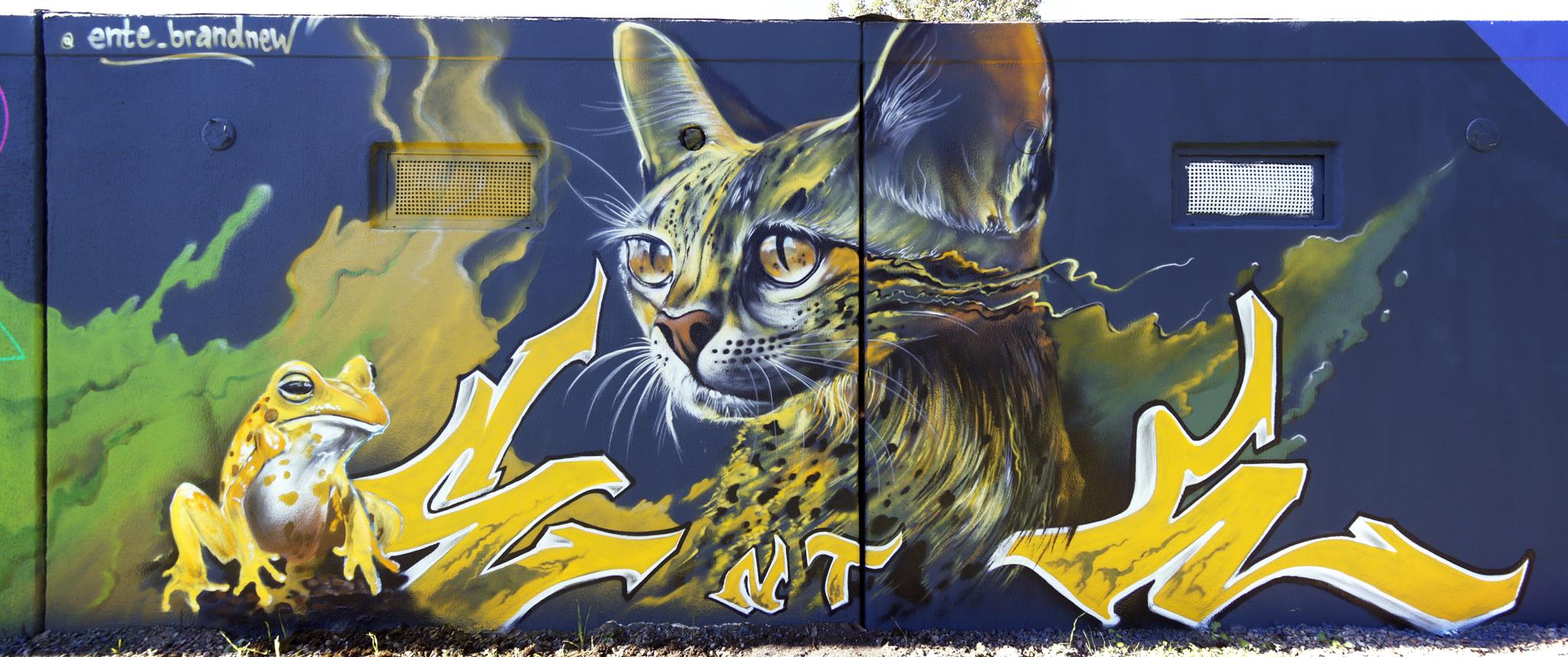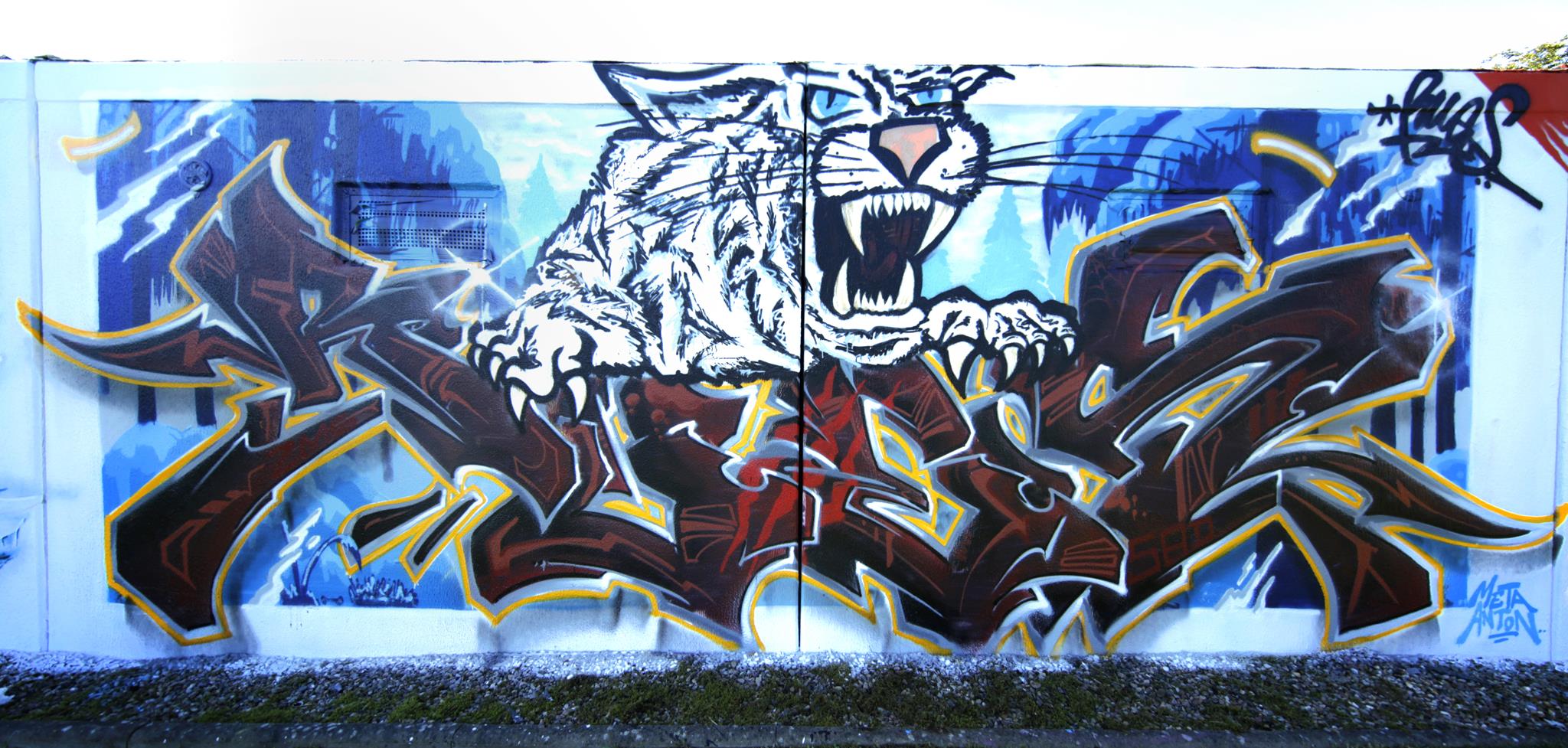 After the great first edition of the WOLFSBURG GRAFFITI JAM in 2020, this fantastic happening went into its second edition in 2023. The 150 meters long garage walls at Lindenstraße 31 in the Vorsfelde district were redesigned by 32 artists from September 1st to 3rd. This time the motto was „Save the animals“ and on a total of more than 400 m² fascinating natural landscapes were created in combination with graffiti writing and various animal characters. The event was once again organized by DANIEL EYRICH and the crew PAYURDUES with sponsorship from the paint manufacturers MOLOTOW and CAPAROL and supported by the housing associations VRE and WOB. Check out as well the page for the 1st jam edition in 2020. There are more pages about urban art in Wolfsburg in our archive, also have a look at the Hallenbad Hall at Schachtweg, the Sticker Collection and the page with Graffiti and Streetart around the city.