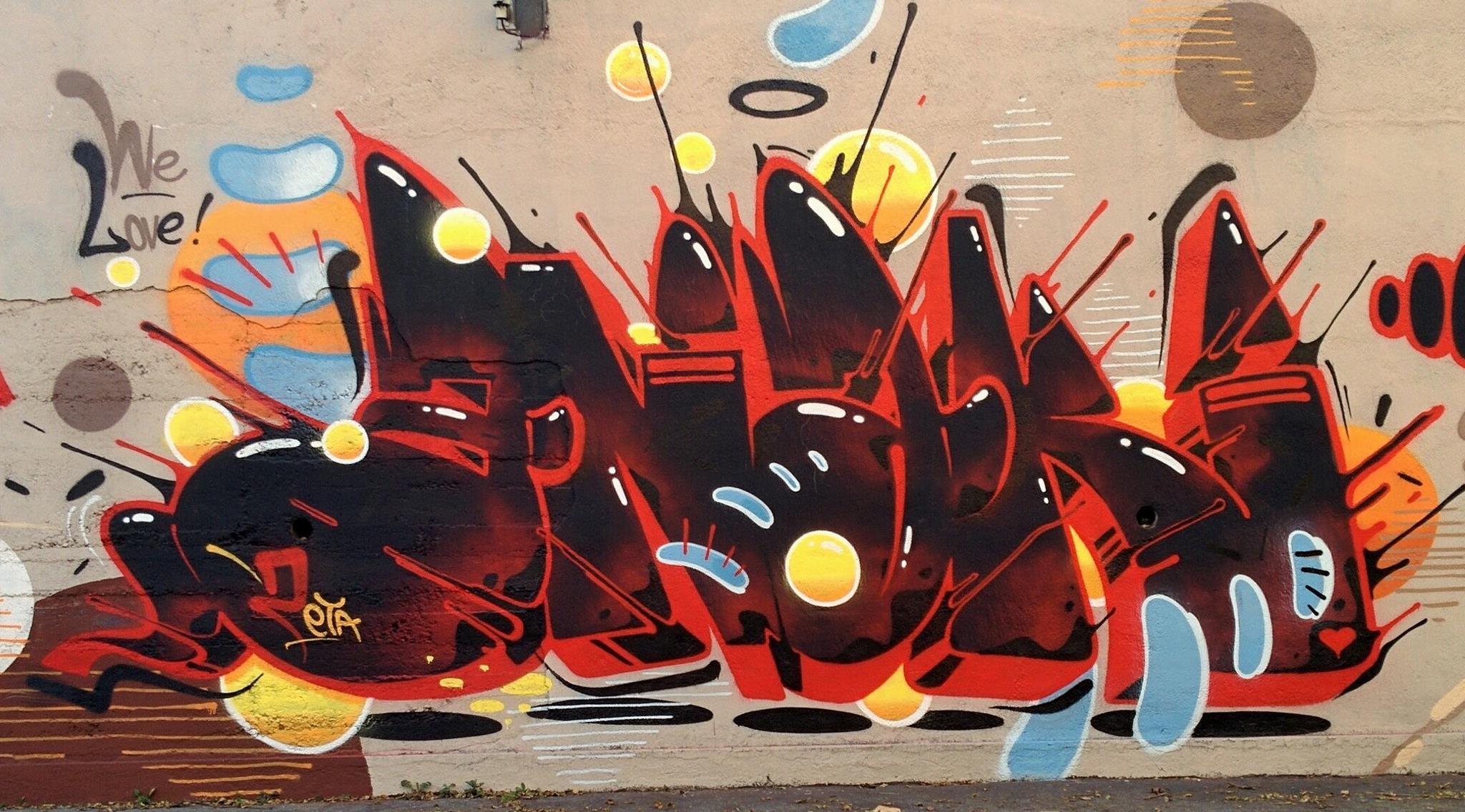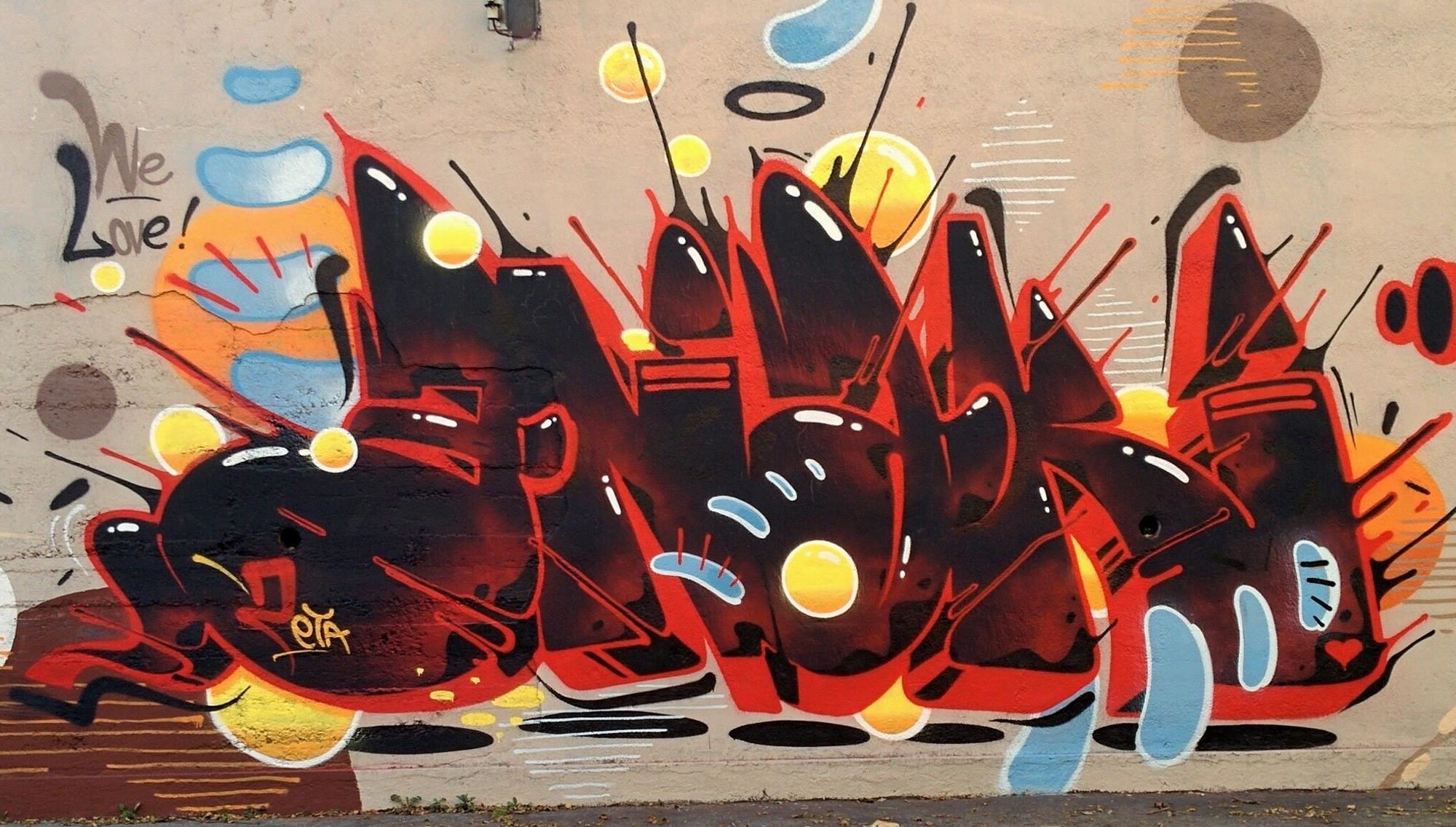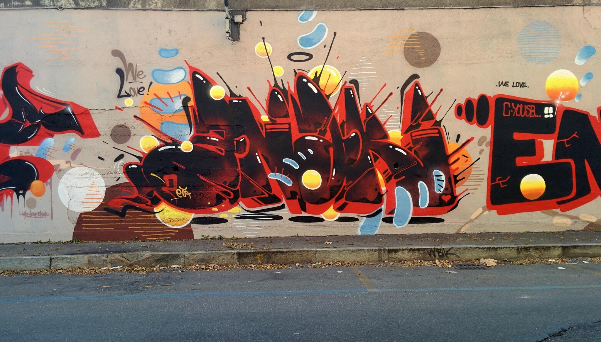 This artwork is part of a tribute wall for the artist ALESSANDRO BIANCO aka ENAK, who lived from 1980 till 2007. Several artists met from time to time to honor him with colorful creations. Included in this spray session from 2019 were BIGTATO, SPRAY AT HOME, WASP CREW, ZETA and several others.