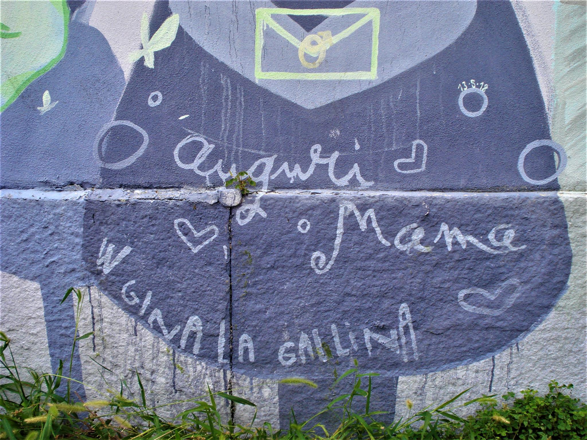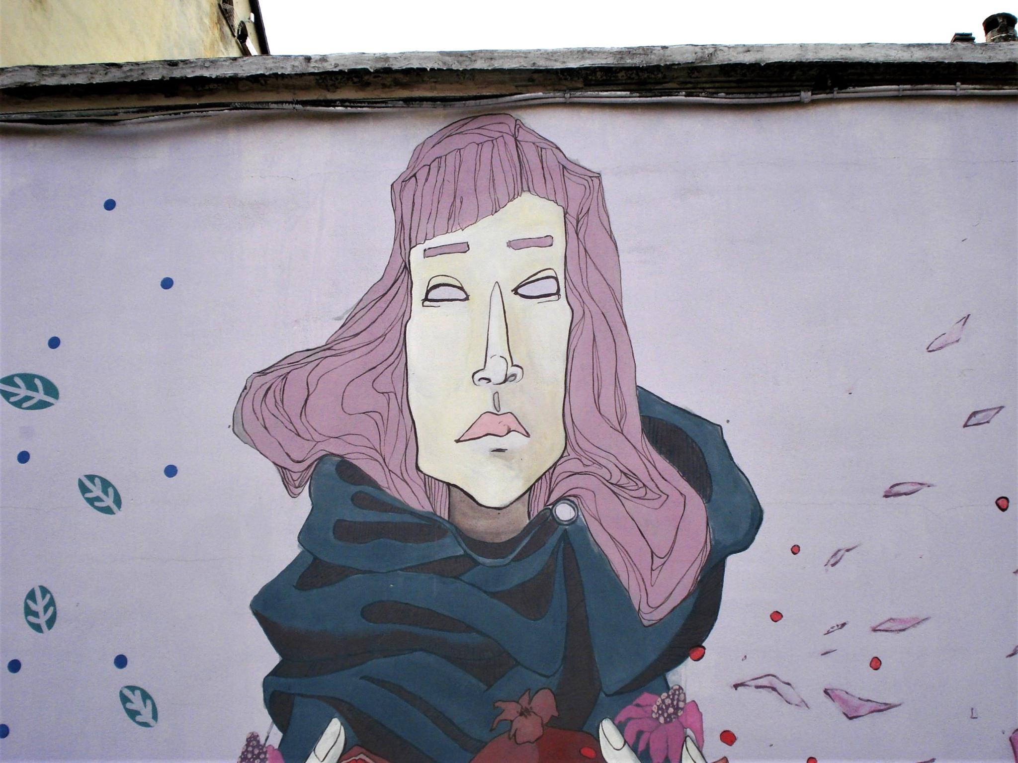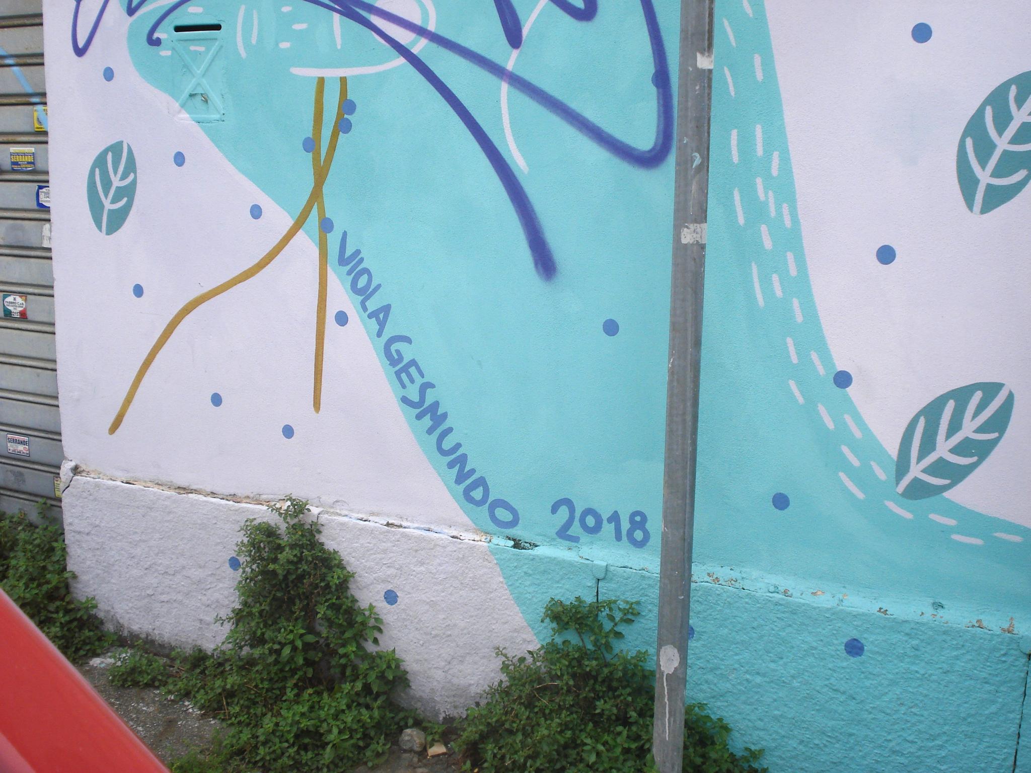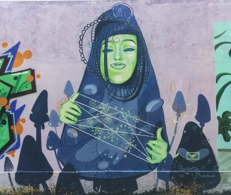 A delicate work like the title that accompanies it created by the illustrator PAOLA GRANATO aka O who is part of the female jam „The Queen of the Alps“ organized by Murarte and Monkeys Evolution. The protagonist, with a mystical appearance, appears intent on playing with a magical thread surrounded by symbols and shapes reminiscent of distant galaxies. With sweet words, the artist describes her work to us: “Play your voice in the bird’s beak, it arrives at the mouth when it moves the September leaves. It’s you, sweet, on the bed of the brooks. Play your voice. Spirit of the forest. Everyone’s melody. The cradle I know. Play your voice loud, esthete that does not speak of walls like weaves of silk“. A gentle visual poem on the wall. This arwork was made in 2018. – MAUA MUSEUM