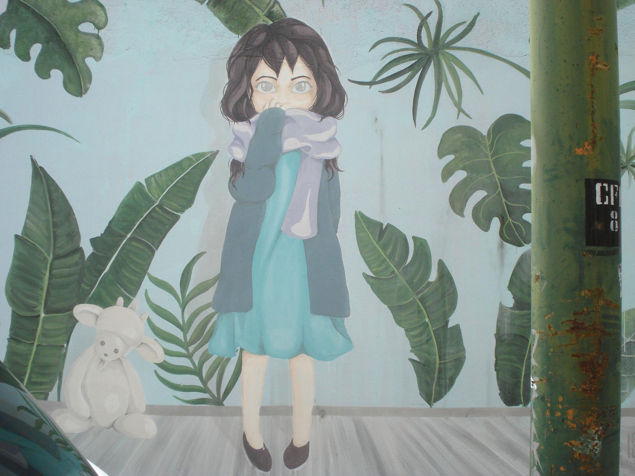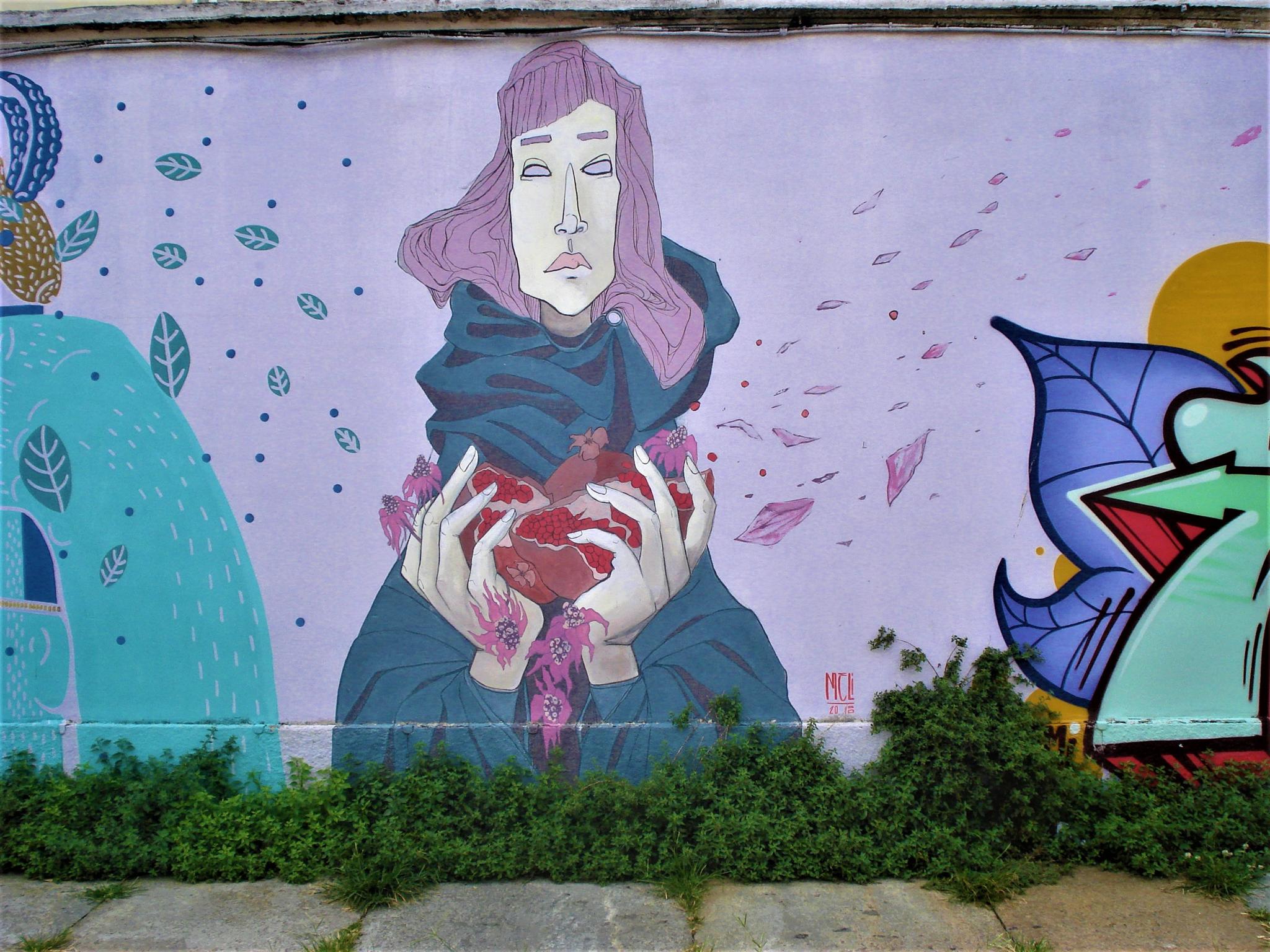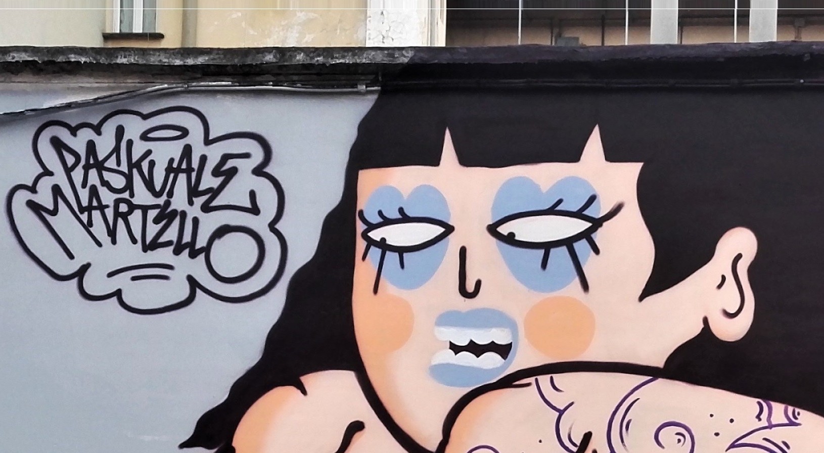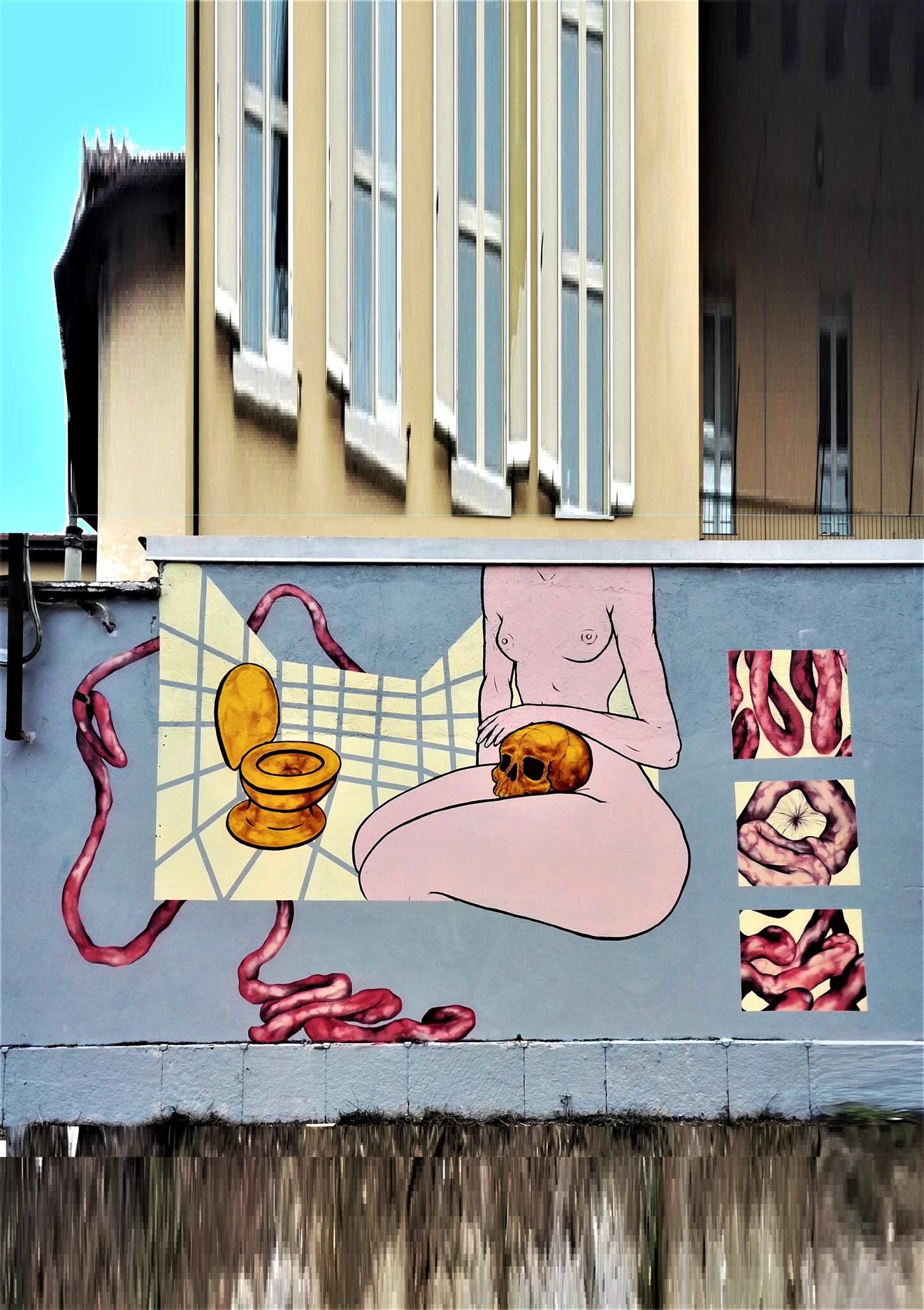 A delicate work like the title that accompanies it created by the illustrator PAOLA GRANATO aka O who is part of the female jam „The Queen of the Alps“ organized by Murarte and Monkeys Evolution. The protagonist, with a mystical appearance, appears intent on playing with a magical thread surrounded by symbols and shapes reminiscent of distant galaxies. With sweet words, the artist describes her work to us: “Play your voice in the bird’s beak, it arrives at the mouth when it moves the September leaves. It’s you, sweet, on the bed of the brooks. Play your voice. Spirit of the forest. Everyone’s melody. The cradle I know. Play your voice loud, esthete that does not speak of walls like weaves of silk“. A gentle visual poem on the wall. This arwork was made in 2018. – MAUA MUSEUM
