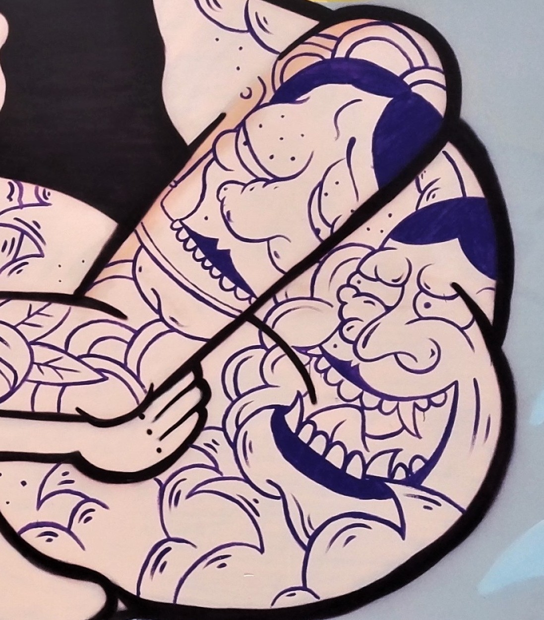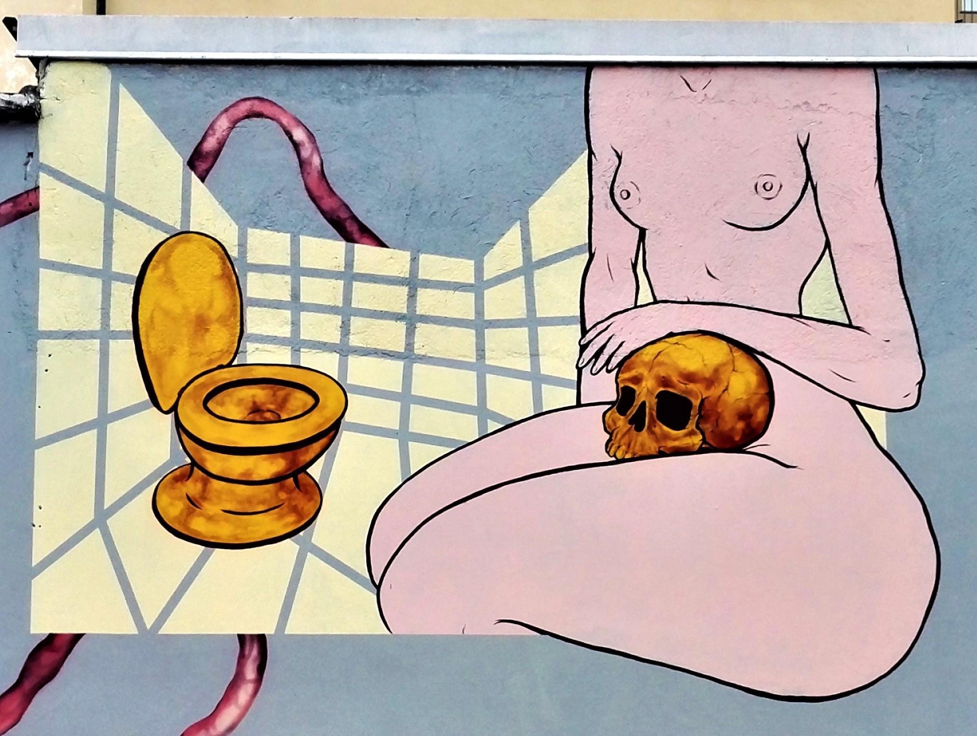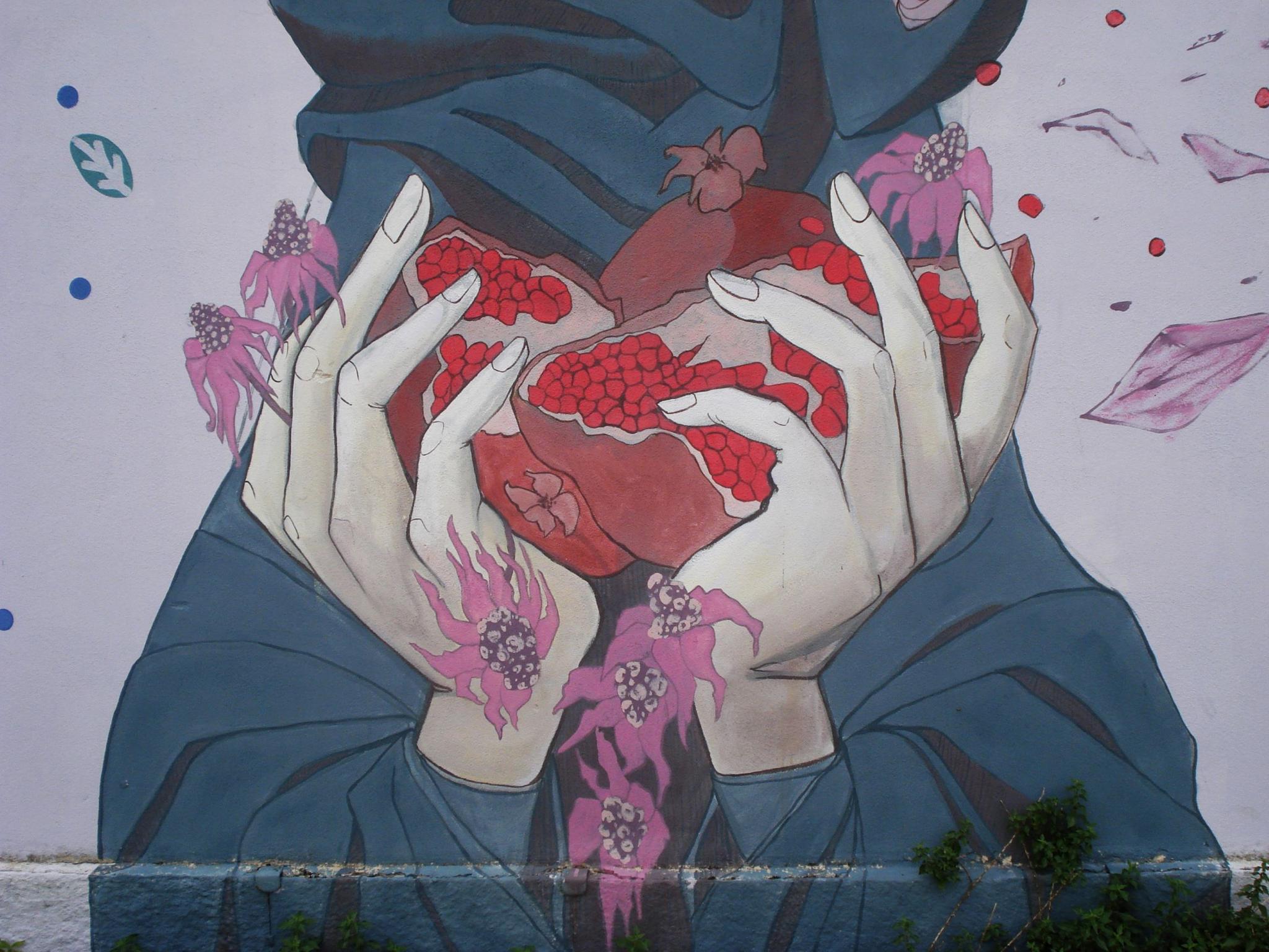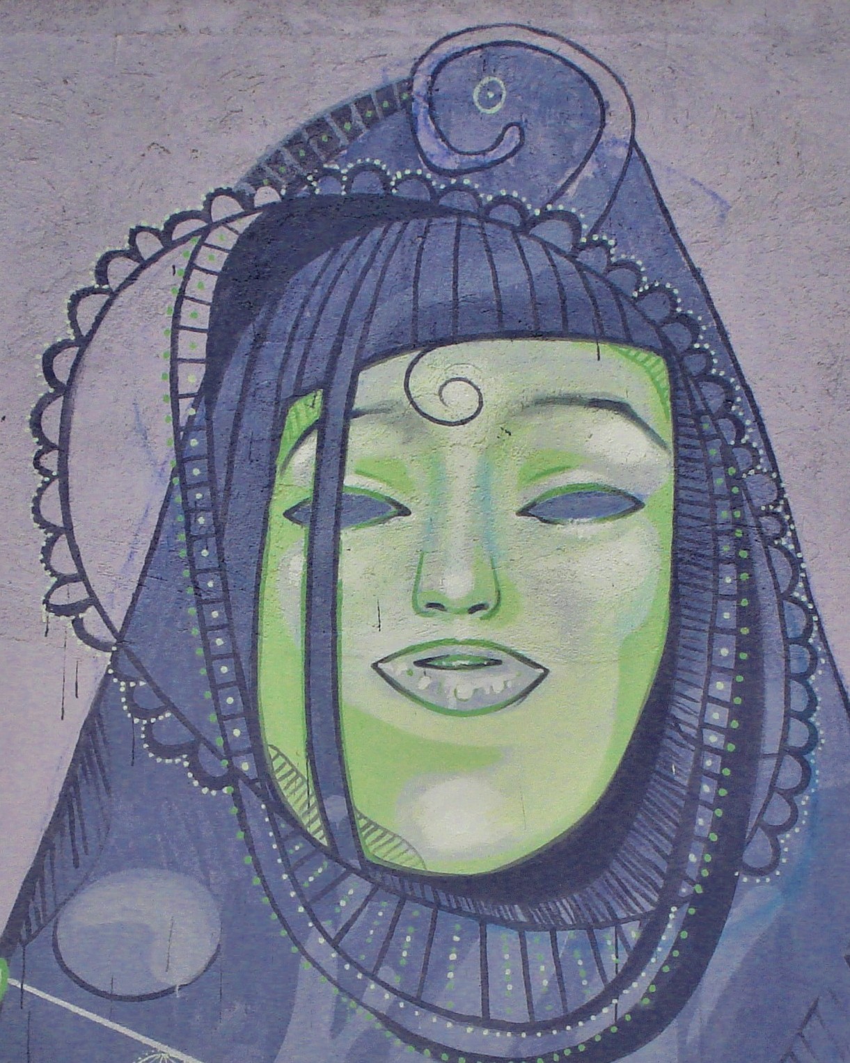 A delicate work like the title that accompanies it created by the illustrator PAOLA GRANATO aka O who is part of the female jam „The Queen of the Alps“ organized by Murarte and Monkeys Evolution. The protagonist, with a mystical appearance, appears intent on playing with a magical thread surrounded by symbols and shapes reminiscent of distant galaxies. With sweet words, the artist describes her work to us: “Play your voice in the bird’s beak, it arrives at the mouth when it moves the September leaves. It’s you, sweet, on the bed of the brooks. Play your voice. Spirit of the forest. Everyone’s melody. The cradle I know. Play your voice loud, esthete that does not speak of walls like weaves of silk“. A gentle visual poem on the wall. This arwork was made in 2018. – MAUA MUSEUM
