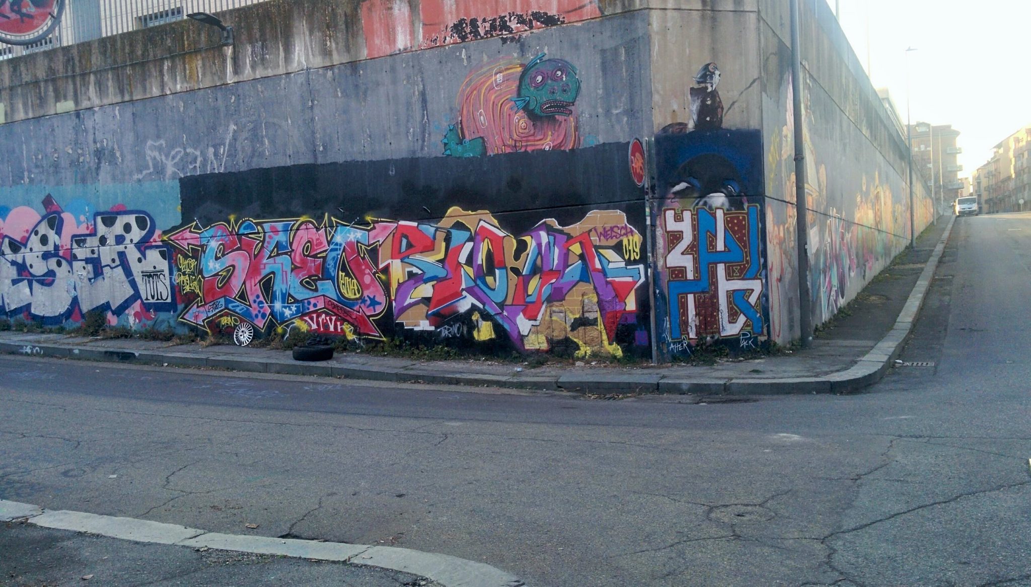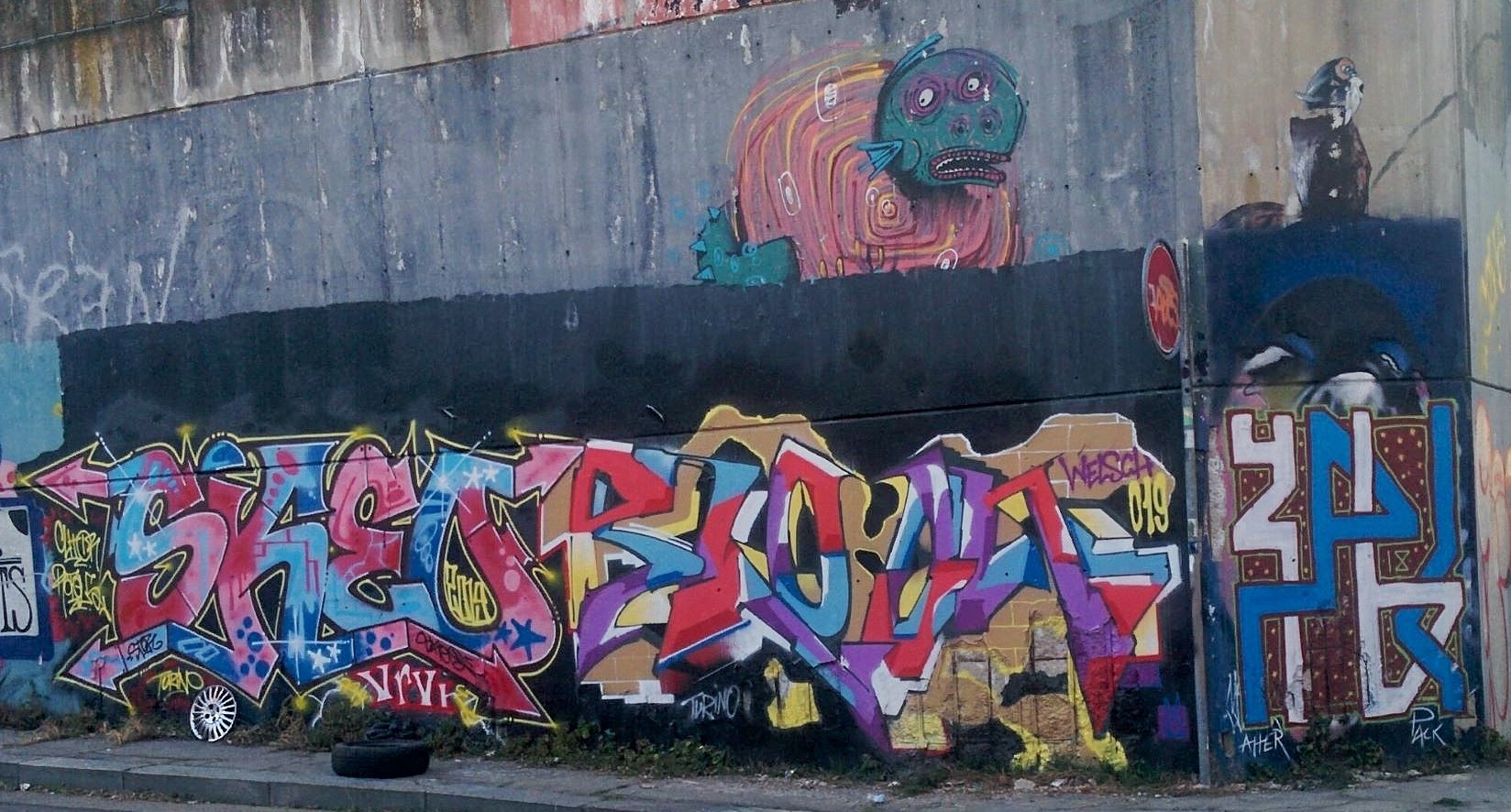 The graffiti on the right are from unknown and the creature above is from a previous piece made by MRFIJODOR