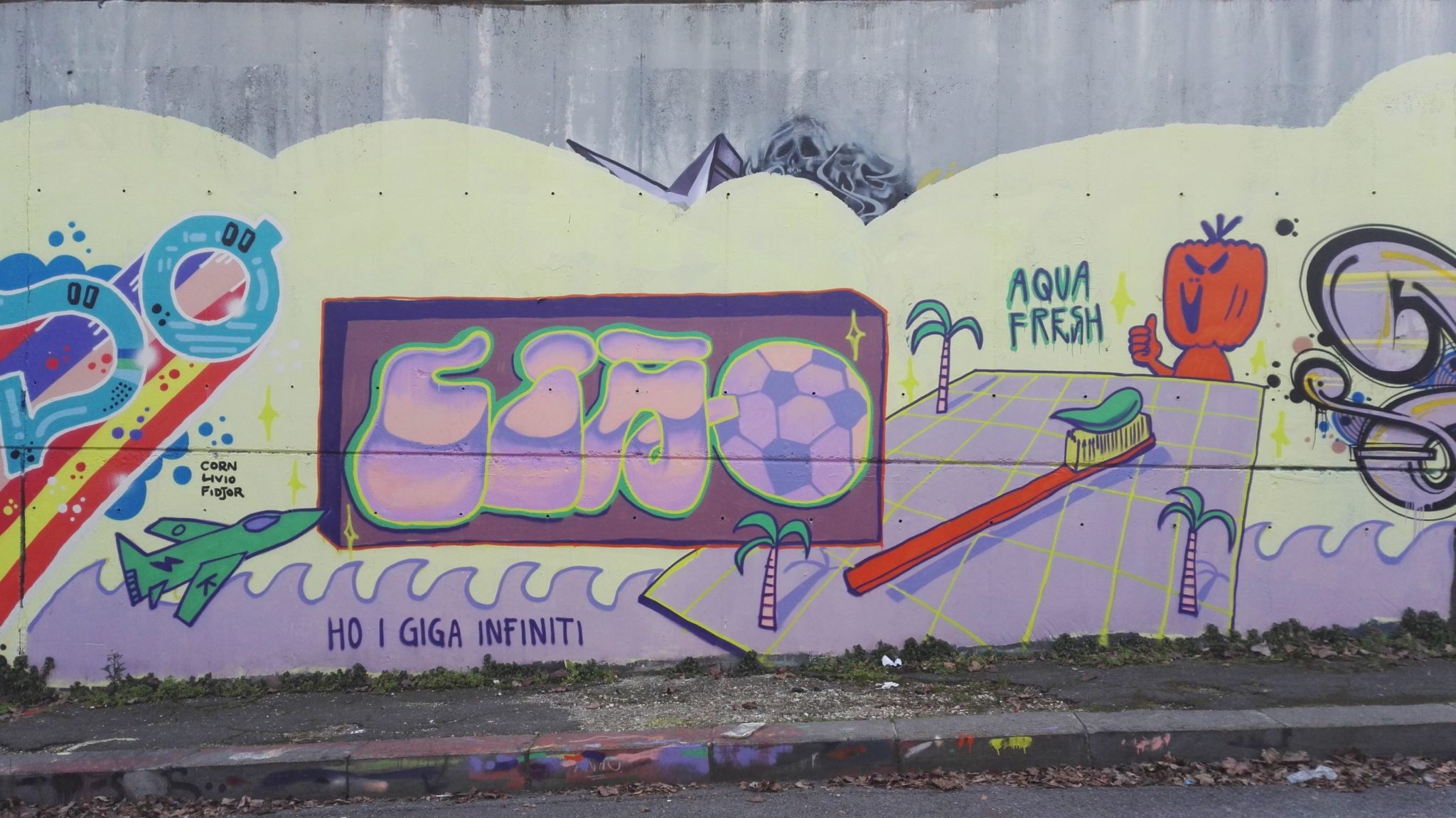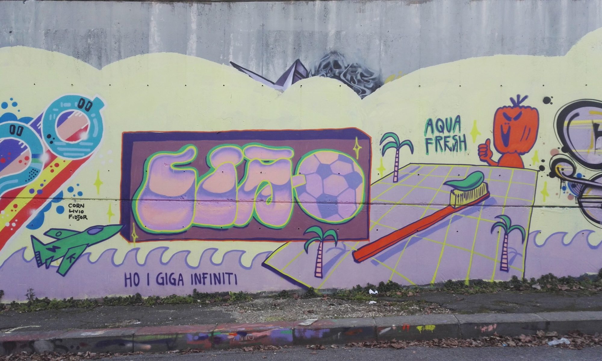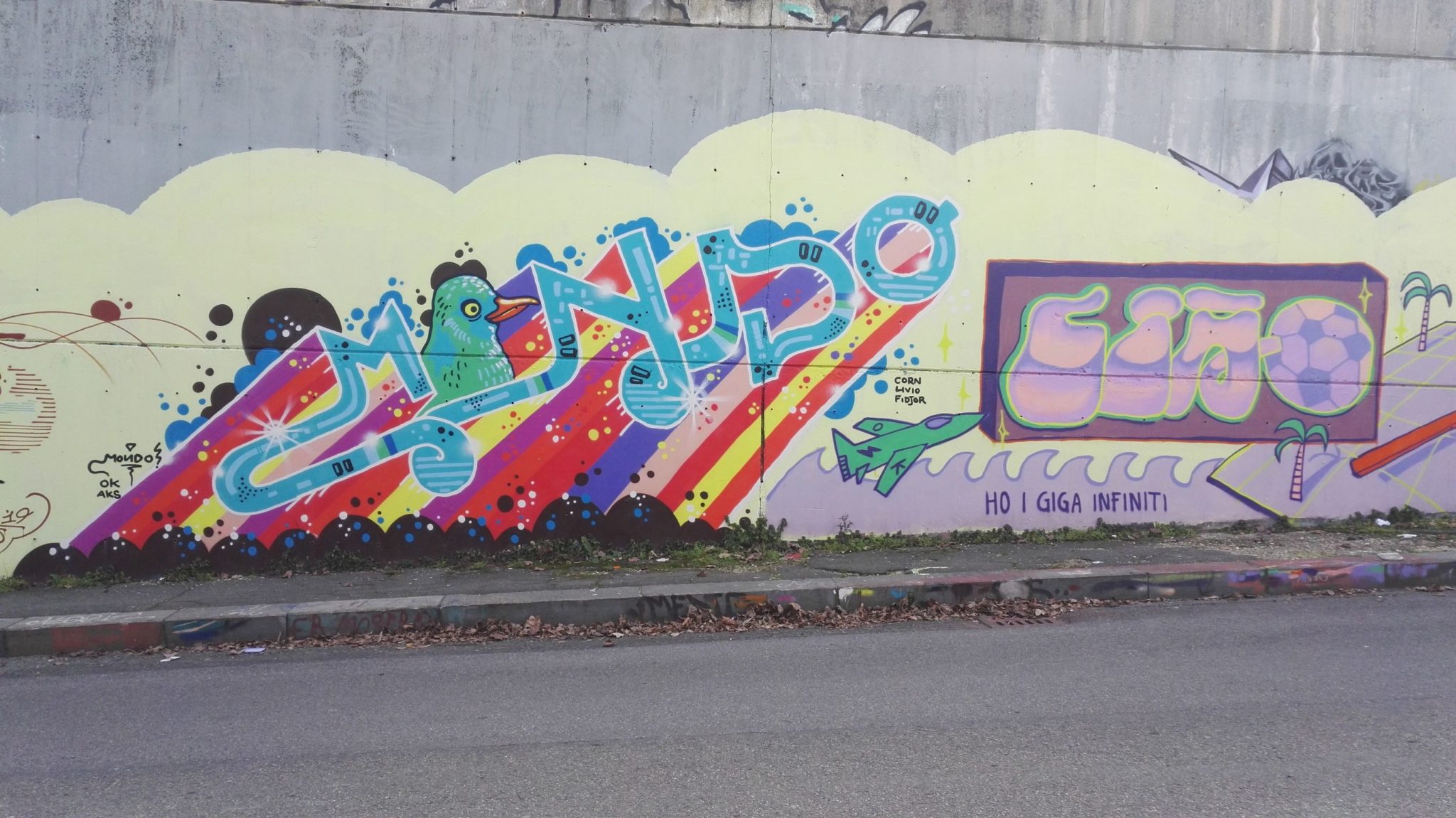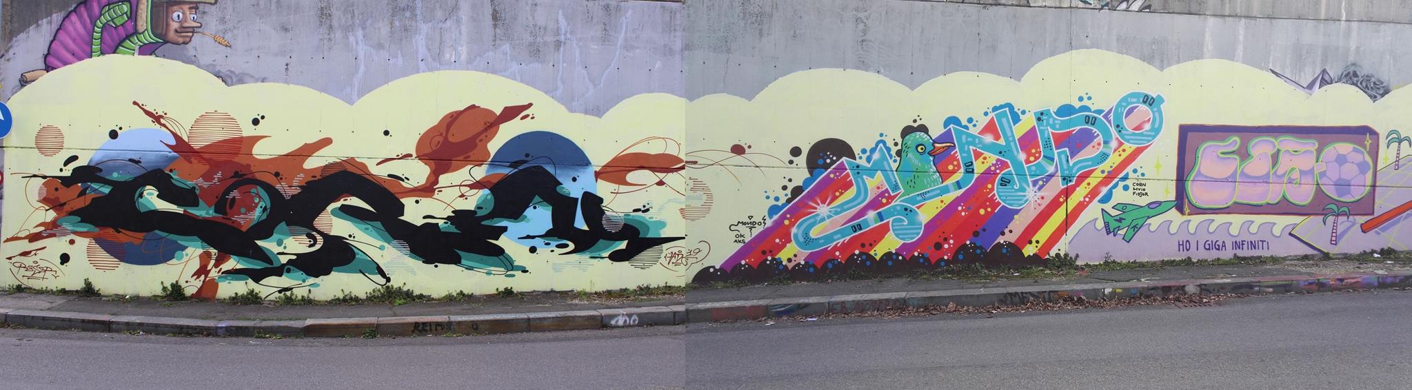 The graffiti on the left are from CORN 79 and MONDO. The character on the far left above the group work is from a previous artwork made by RICCARDO RIZZO