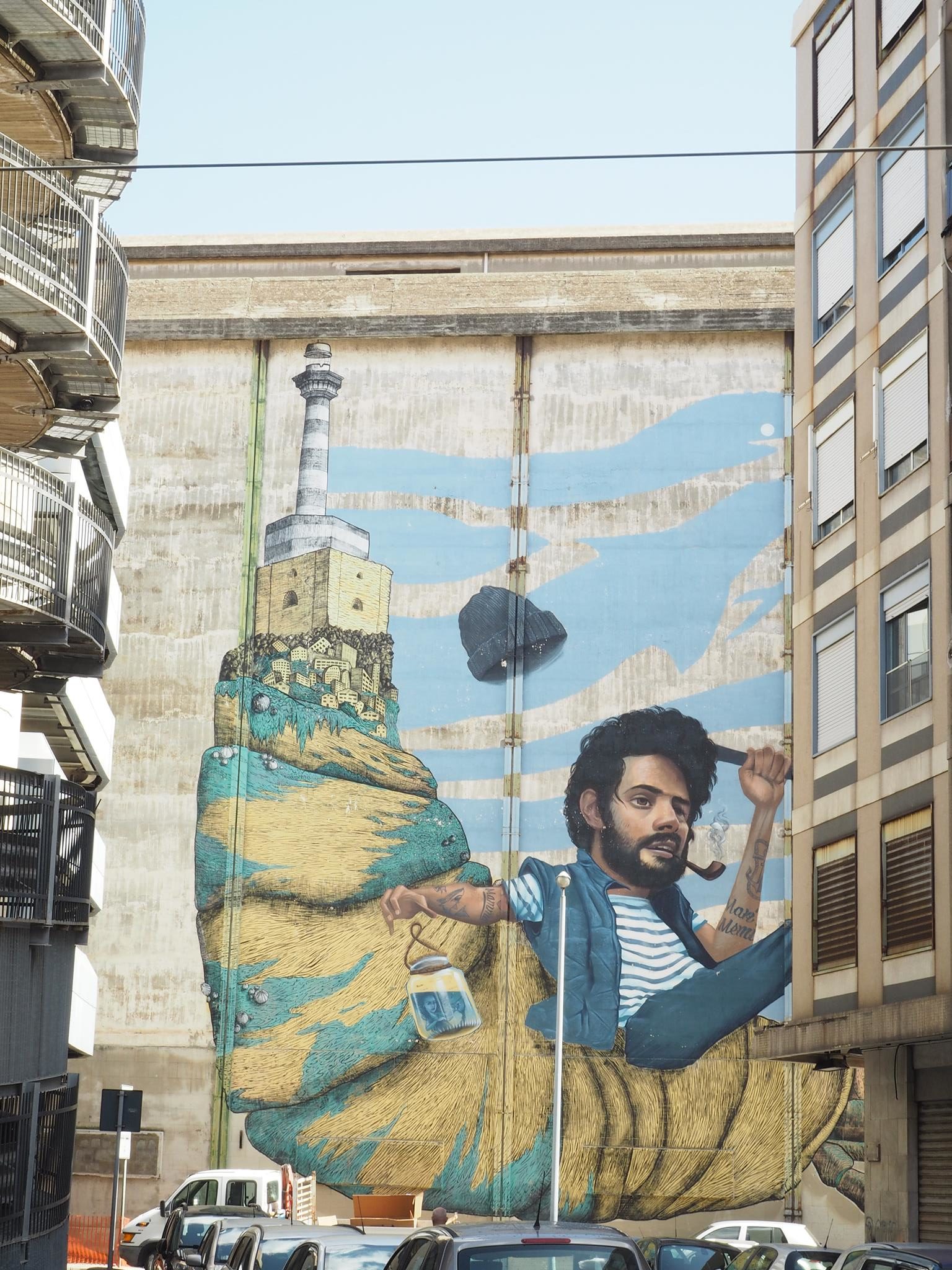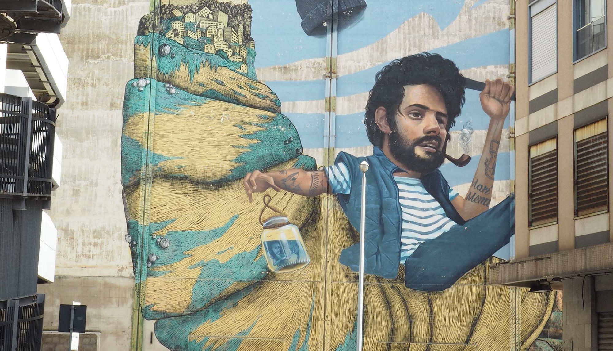 The other murals are “Mediterranea” by JULIETA.XLF, a young Spanish artist, places a blue mermaid crying blood in the foreground against a background of polychrome majolica, because the sea is full of blood. LUCA ZAMOC depicts “Jason and the Dragon,” the myth of the Argonauts who passed through the Strait. SEACREATIVE, on the façade of the former General Warehouses, painted the figure of “Lillo the Sailor,” a name from Messina because it is short for Letterio, who turns his back to the sea and after his toil of the day returns home with a fish under his arm. Finally, NEMO’S, proposes the dramatic theme of the deaths of migrants at sea, four naked bodies hanging like cloths hung out to dry. – City of Messina