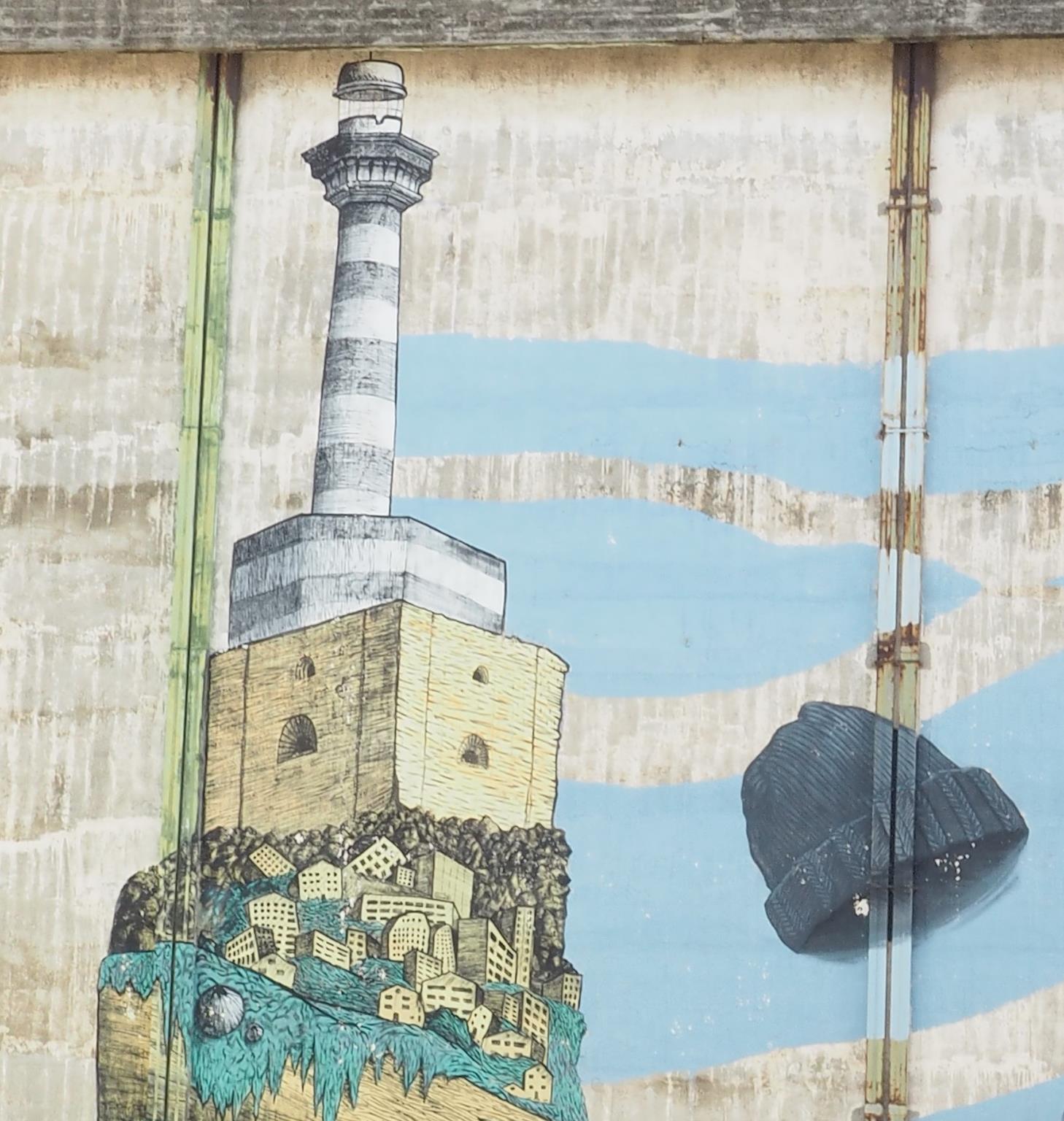 As part of the City of Messina’s “Distrart” project, an urban regeneration event through the language of street art, five large murals were painted in 2015 on some of the facades of the former granaries and former general warehouses silos in the Campo delle Vettovaglie street area. The giant mural on the facade of the former granaries silos near the Cavallotti parking lot is titled “Metamorphosis,” the work was made by the artists ANC and POKI where Messina is depicted as a huge hermit crab with Montorsoli’s 16th-century lantern at the top.