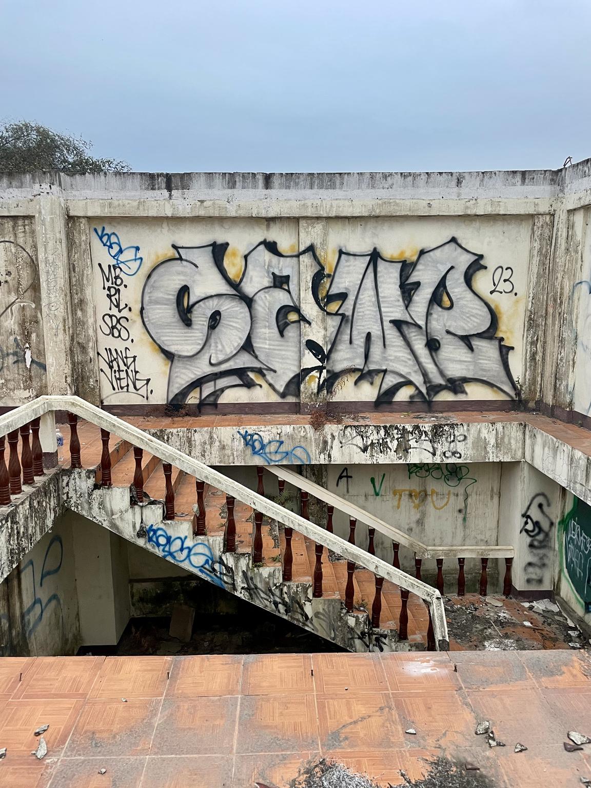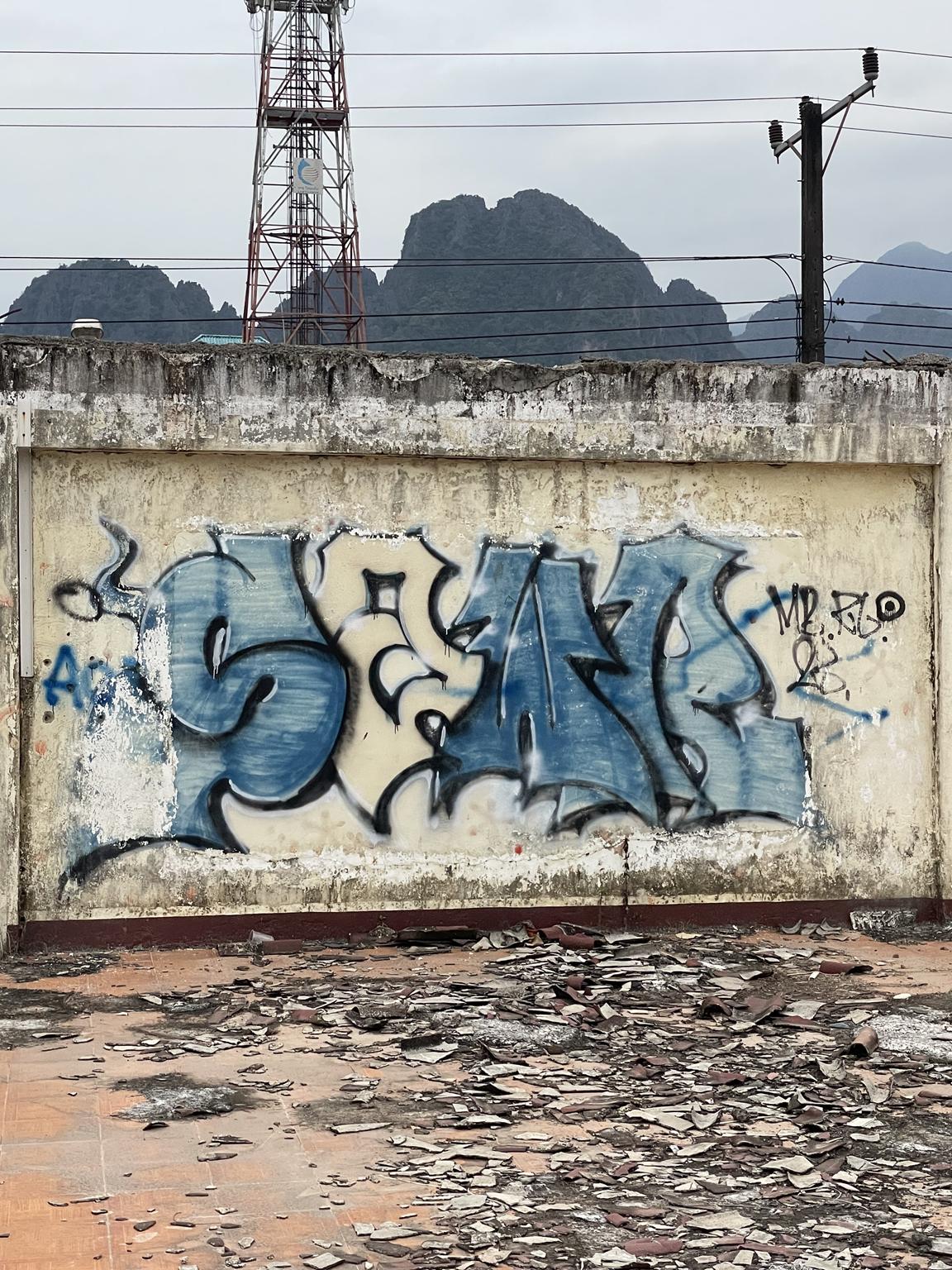 For many years, Vang Vieng was known as the ultimate party location with raves in the jungle and legendary tubing, where you float down the Nam Song River from one bar to the next in an inflated car tire tube. Things have quietened down a bit in the town now, as it became too wild at some point and there were more and more accidents. But you can still enjoy the colorful nightlife and tubing is still offered, just not to the same extent as before. Regardless, the town is a good starting point for activities in the Karst Mountains, a fantastically beautiful natural landscape. You can rent bikes, scooters, or even quads to get to the respective locations faster. However, you still have to climb up to the peaks and viewpoints or down into the caves yourself. For fans of urban art, the place also has a lot to offer. You can find graffiti in the streets, and many of the bars, cafés, and lounges are decorated with urban art. Here we have a collection photographed by the NOMADS ON WHEELS.
