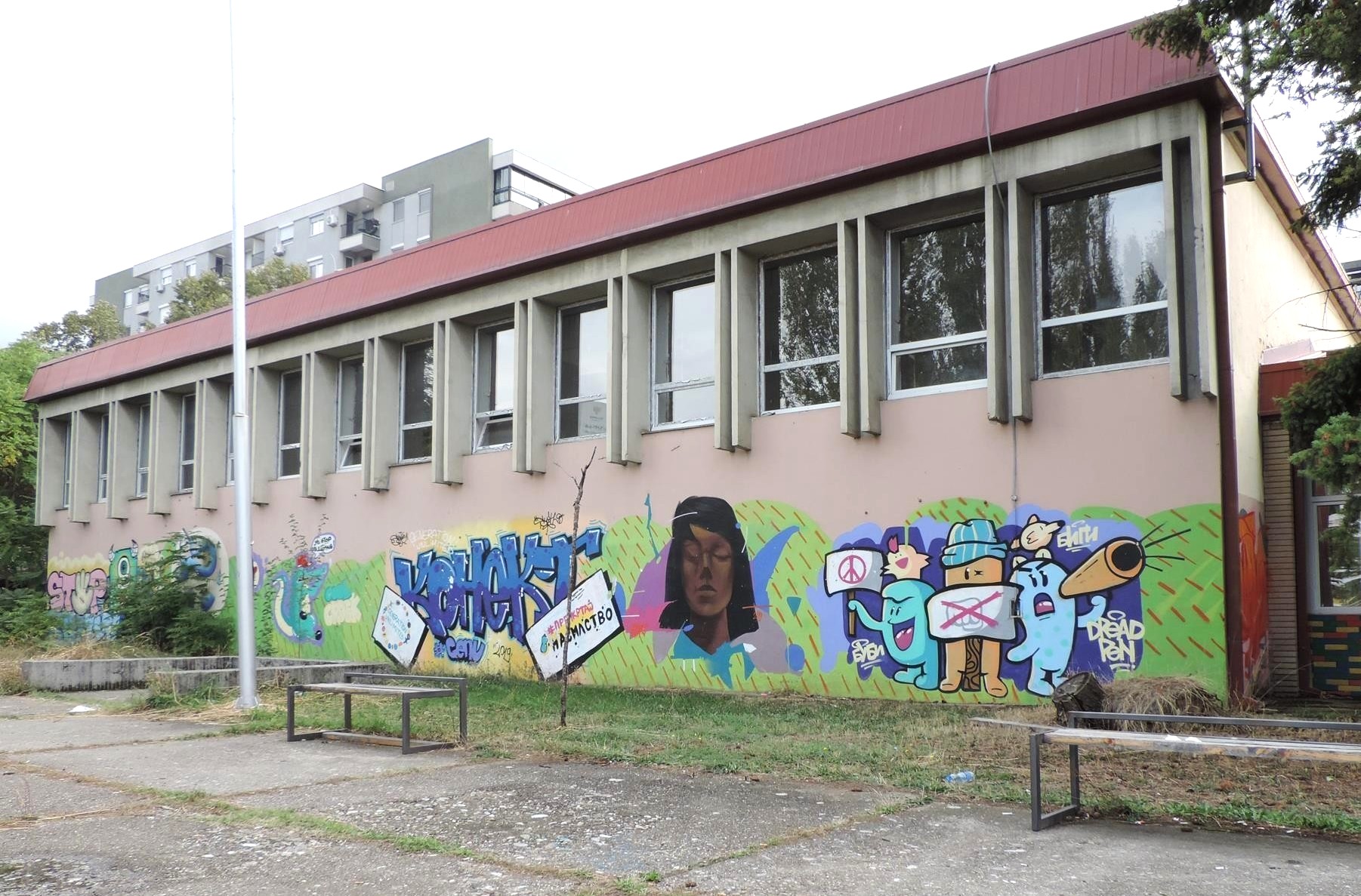The Zdravko Cvetkovski High School in Skopje is a public secondary school with a long tradition dating back to 1944. It is located in the Karpoš district and is one of the city’s most important educational institutions, particularly in the technical field. In 2019, a fantastic graffiti jam took place on the school campus under the motto “Stop Bullying,” which addressed the themes of discrimination and exclusion. Several fantastic writing pieces and characters were created on a section of the sports facility wall, and additional graffiti can be found around the premises.