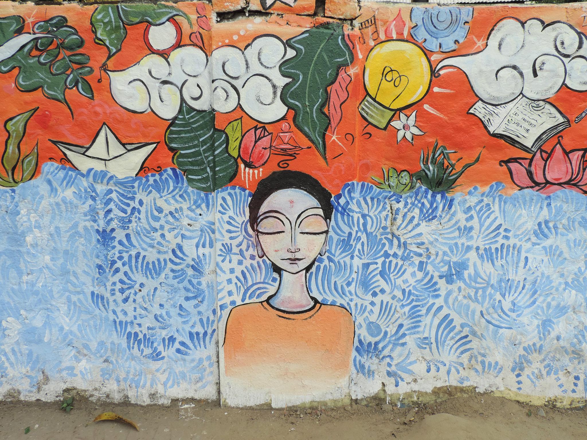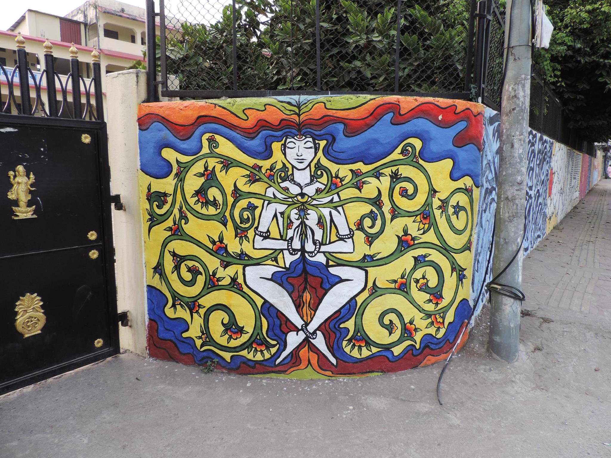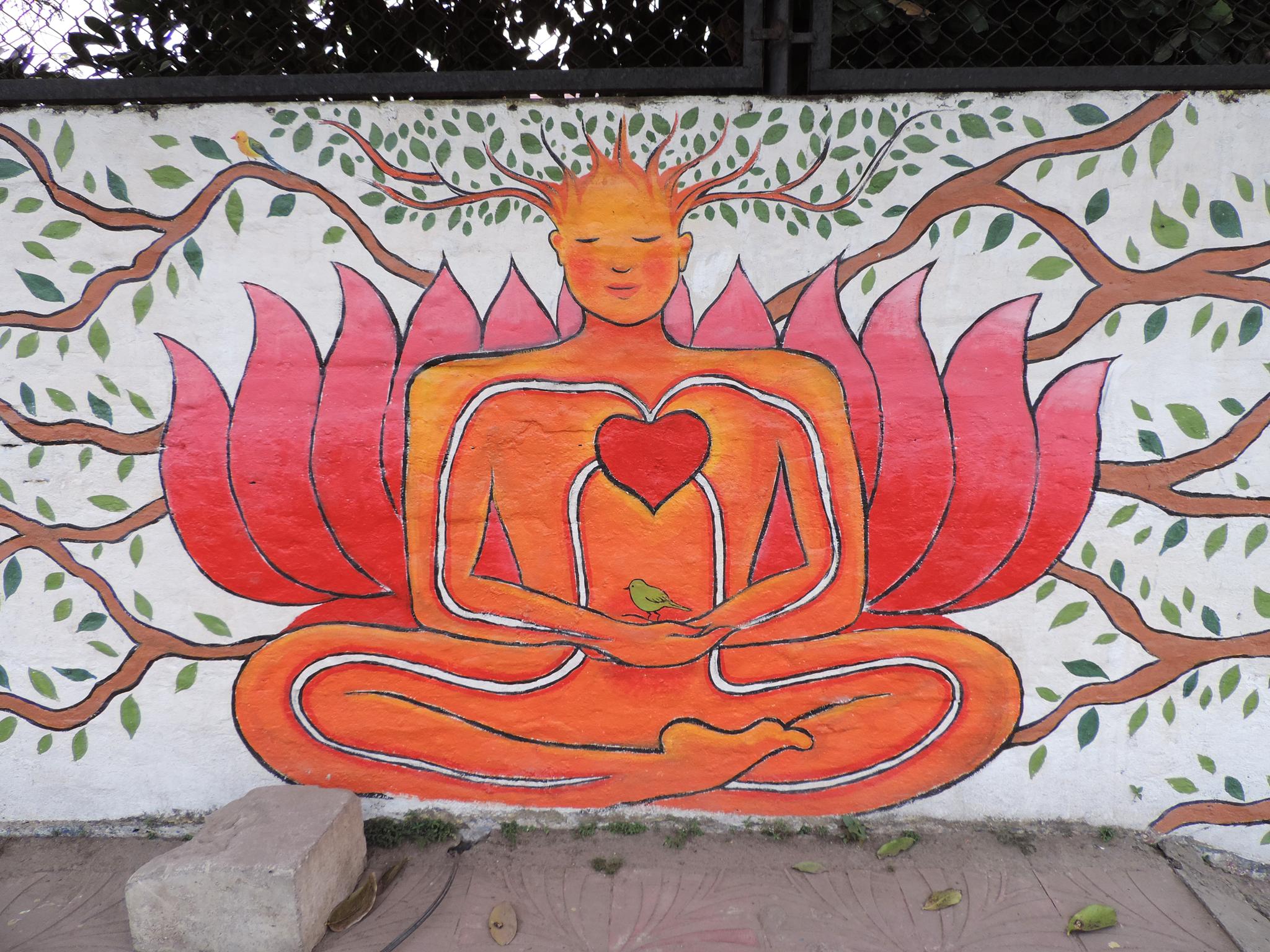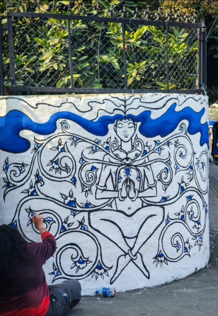 For this mural, Tara created a meditative figure floating in stillness, with the heart and eye chakras open. Energy expands gently around the body, while the figure remains calm and grounded. The work reflects a sense of balance and inner peace. It speaks about flourishing from within and nurturing the soul and mind through art.  –  Bharatpur Streetart Festival