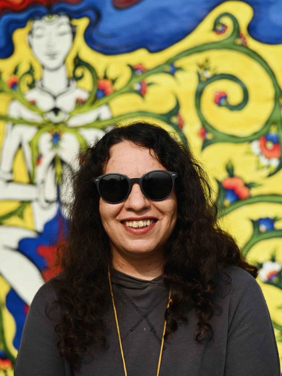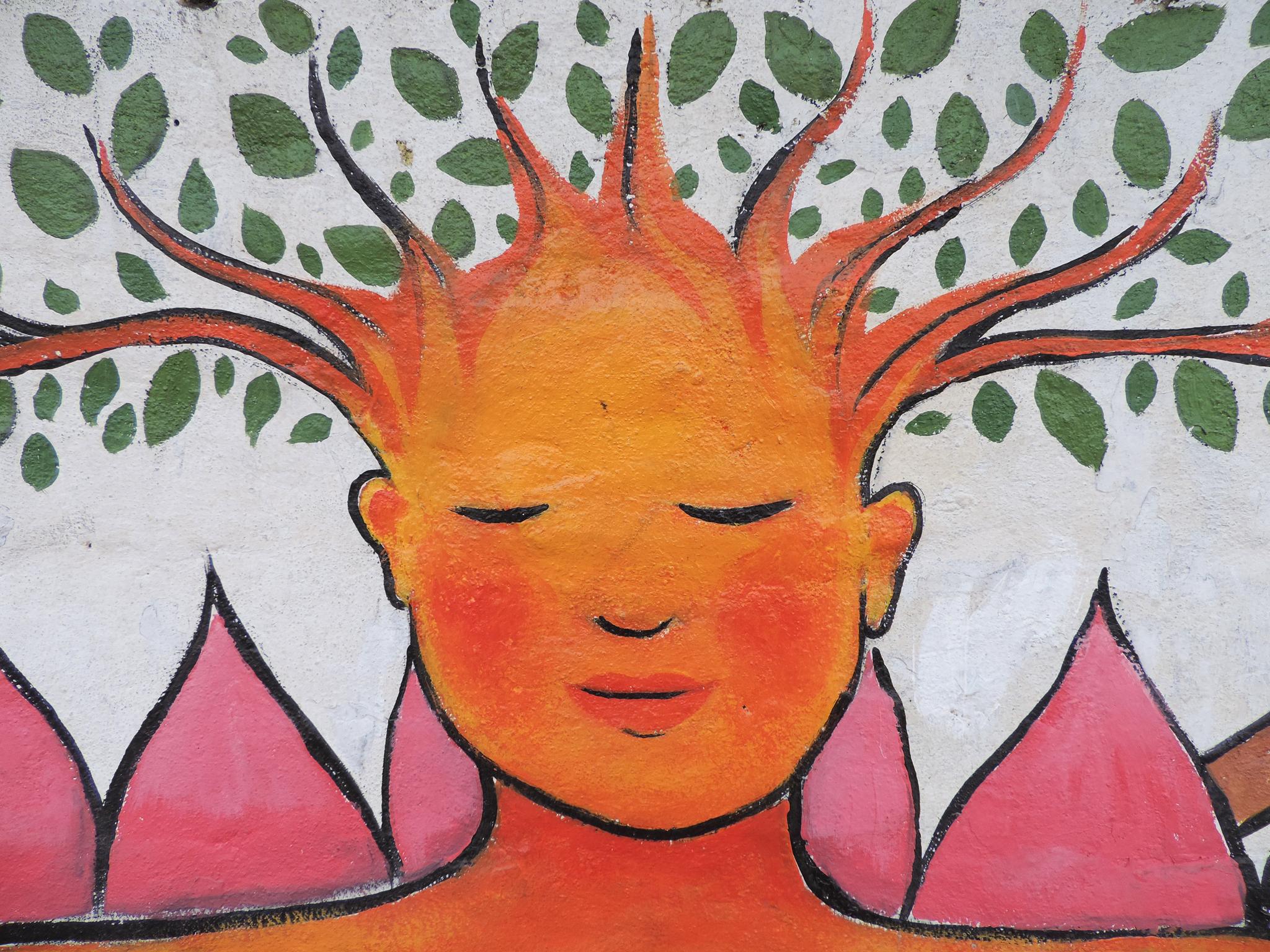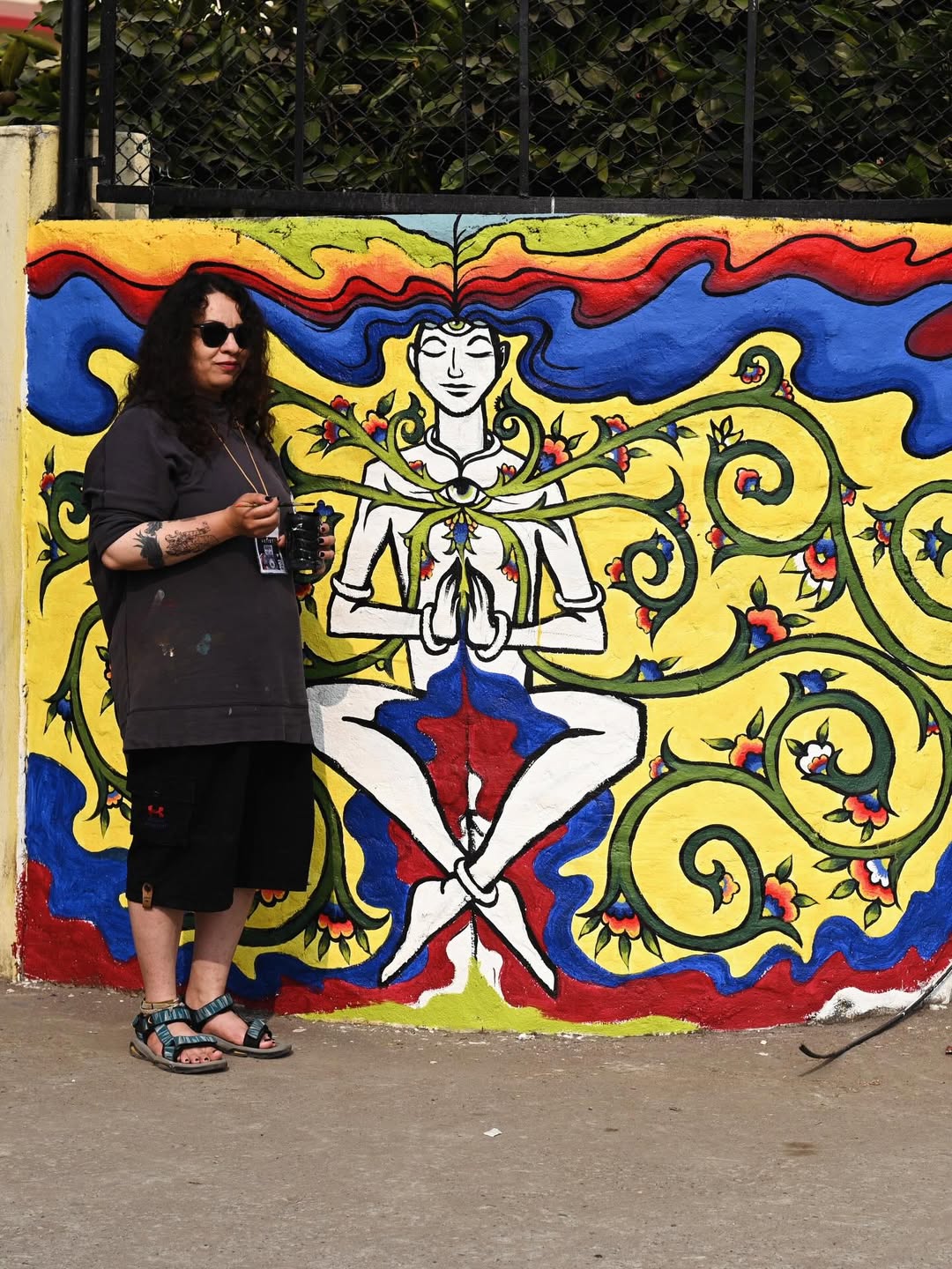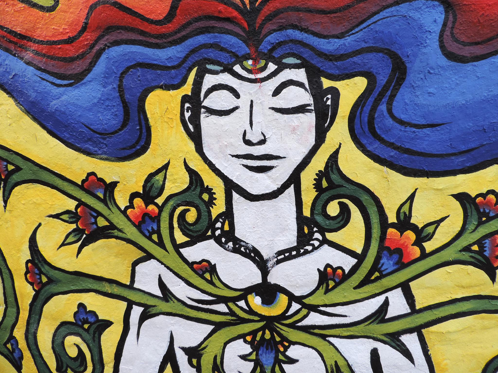 For this mural, Tara created a meditative figure floating in stillness, with the heart and eye chakras open. Energy expands gently around the body, while the figure remains calm and grounded. The work reflects a sense of balance and inner peace. It speaks about flourishing from within and nurturing the soul and mind through art.  –  Bharatpur Streetart Festival