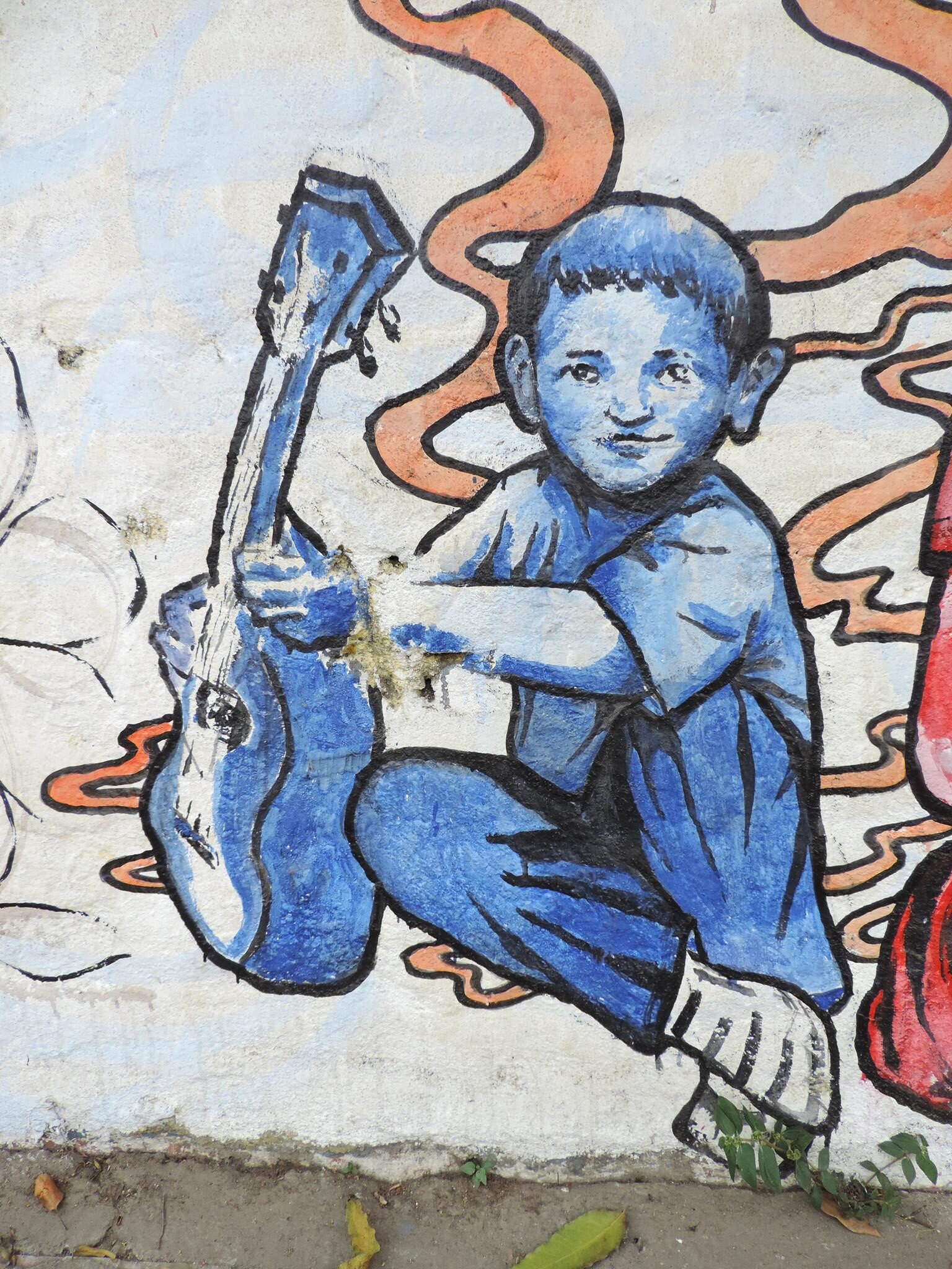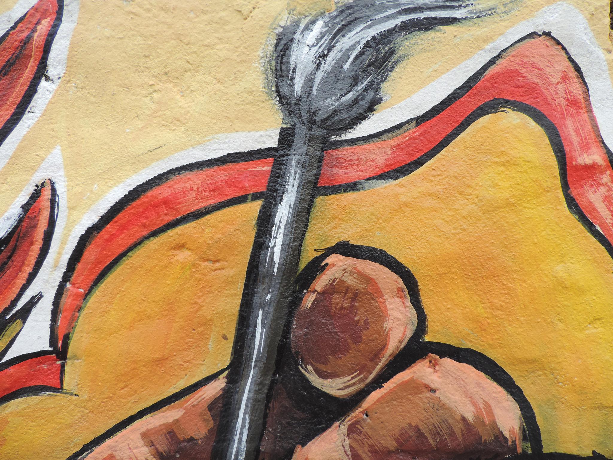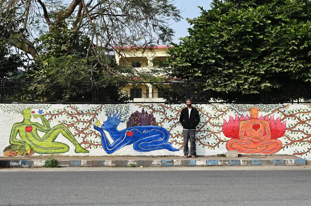 For this mural, Rojan paints two hands rising from the ground. One hand holds a pencil. The other holds a guitar pick. Together they stand for art and music. The image speaks of strength through creativity. In difficult moments, art and music can hold us up. They give us language when words fall short. They remind us that even from the ground, we can rise. A simple and powerful reflection on how creativity sustains us.  –  Bharatpur Streetart Festival