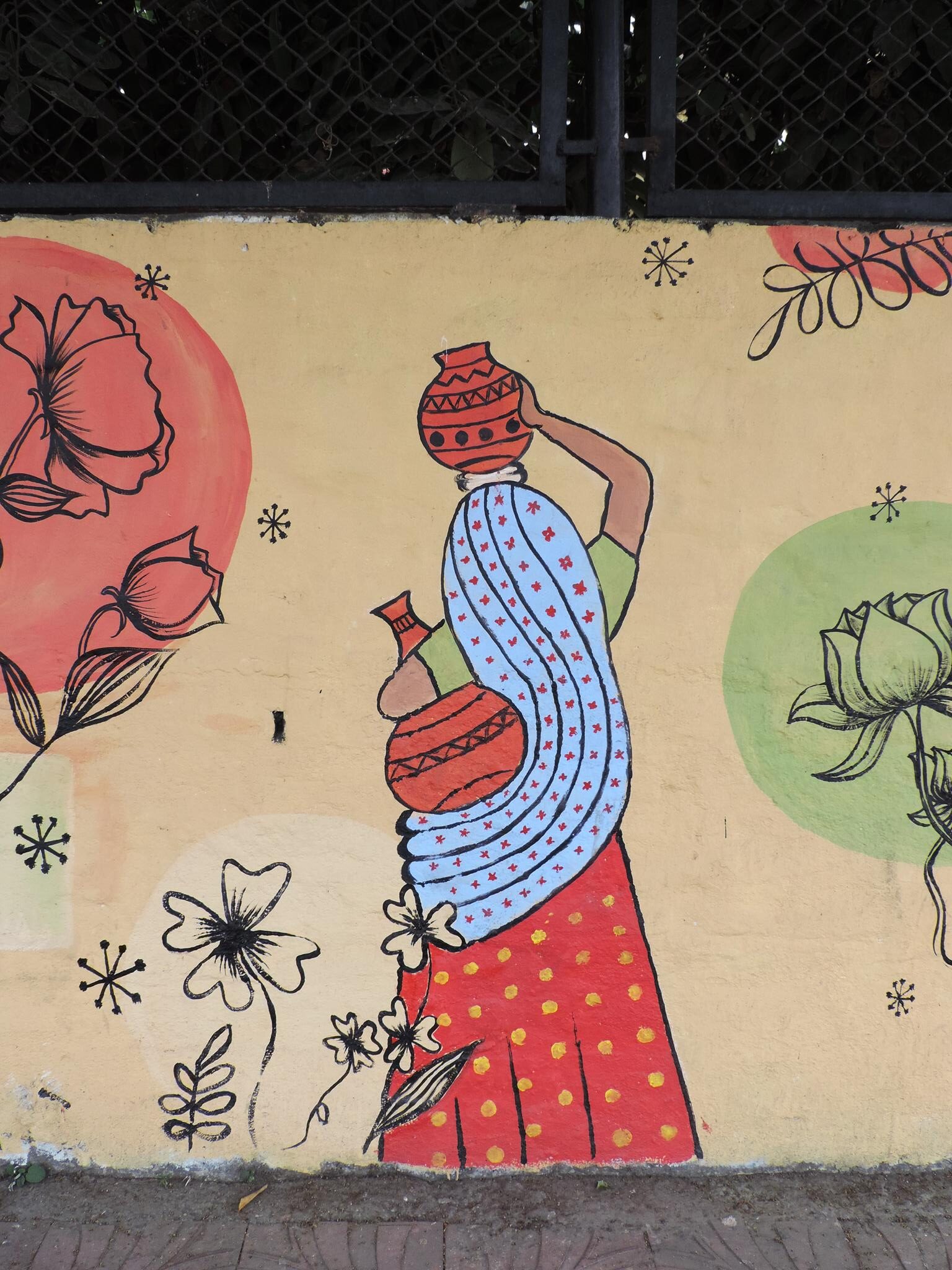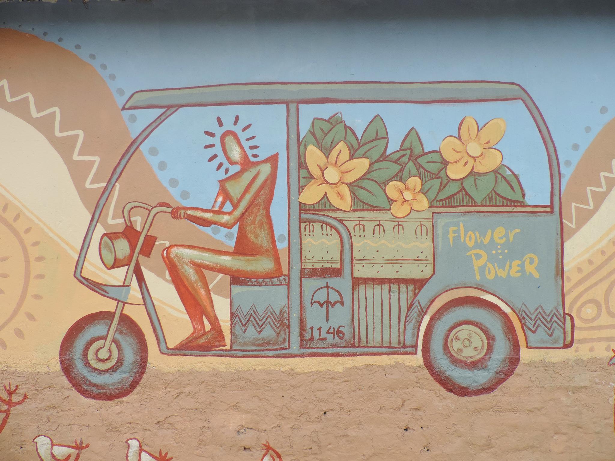 For this mural, Ryan draws from Tharu folk art. Traditional symbols, flowing lines, and tattoo-inspired temple motifs shape the work. Children on their way to school and a tuktuk carrying flowers reflect the quiet beauty of daily rhythms. A warm homage to local culture.  –  Bharatpur Streetart Festival