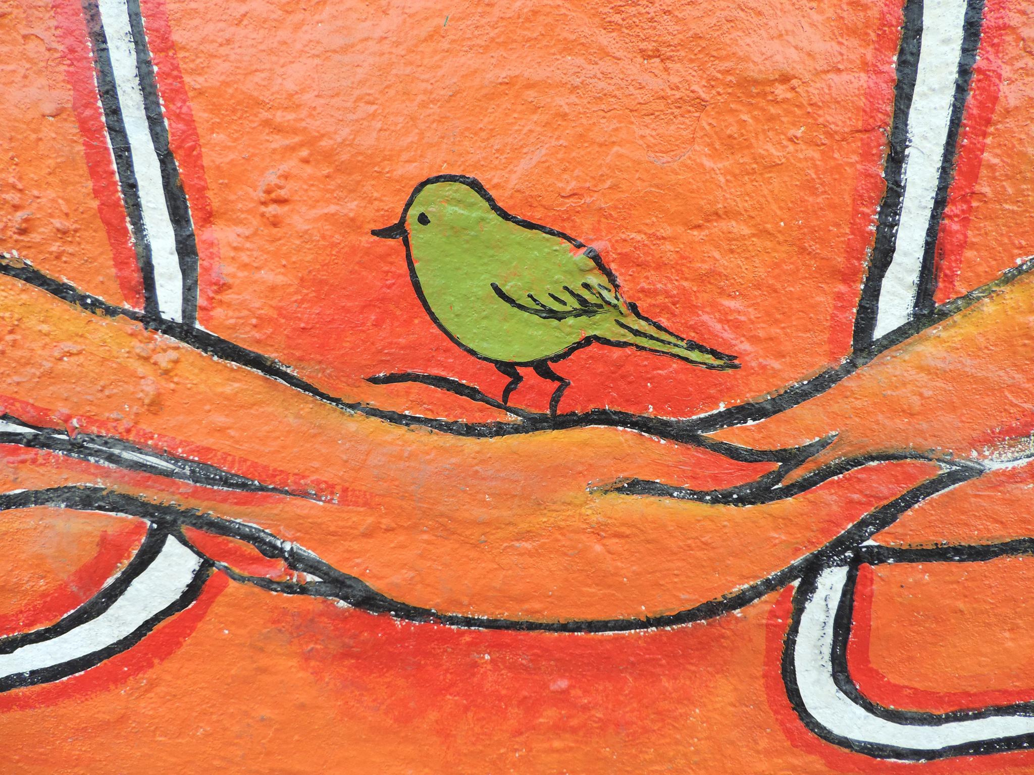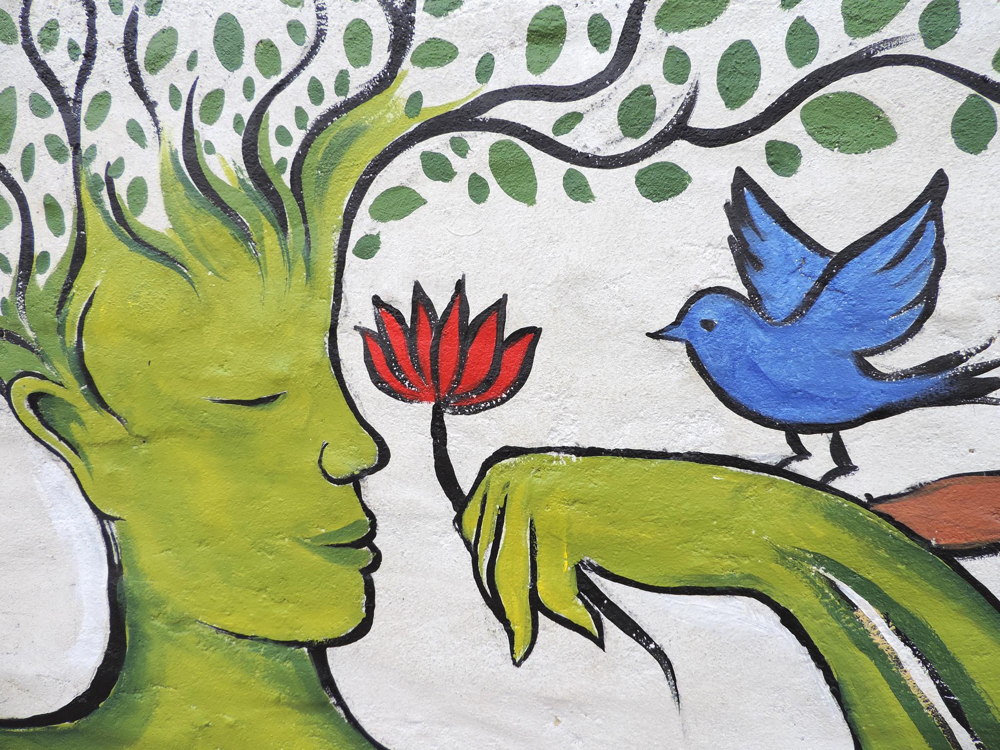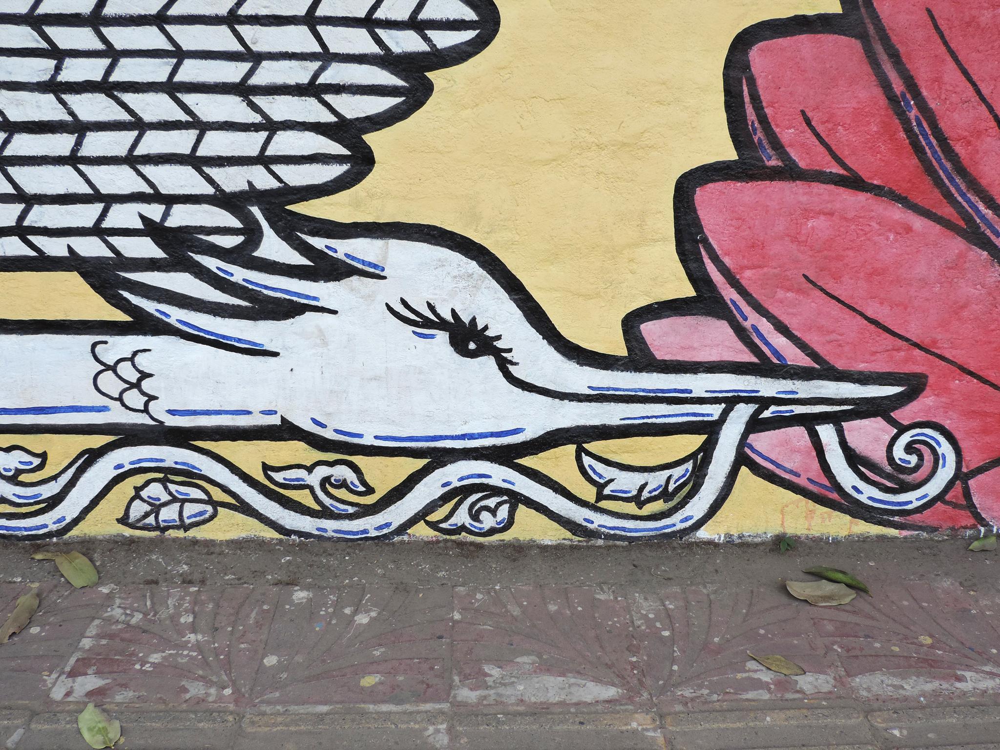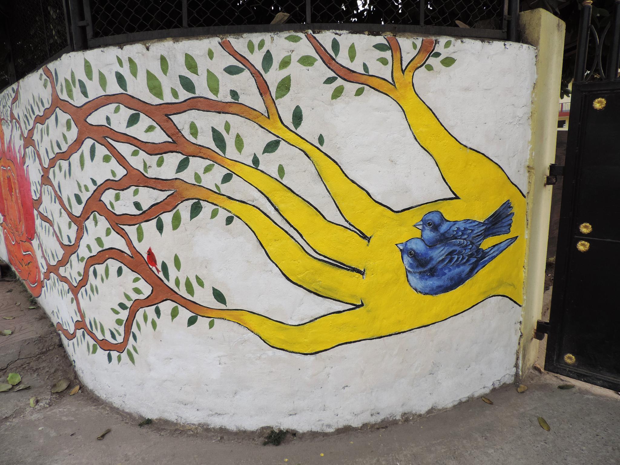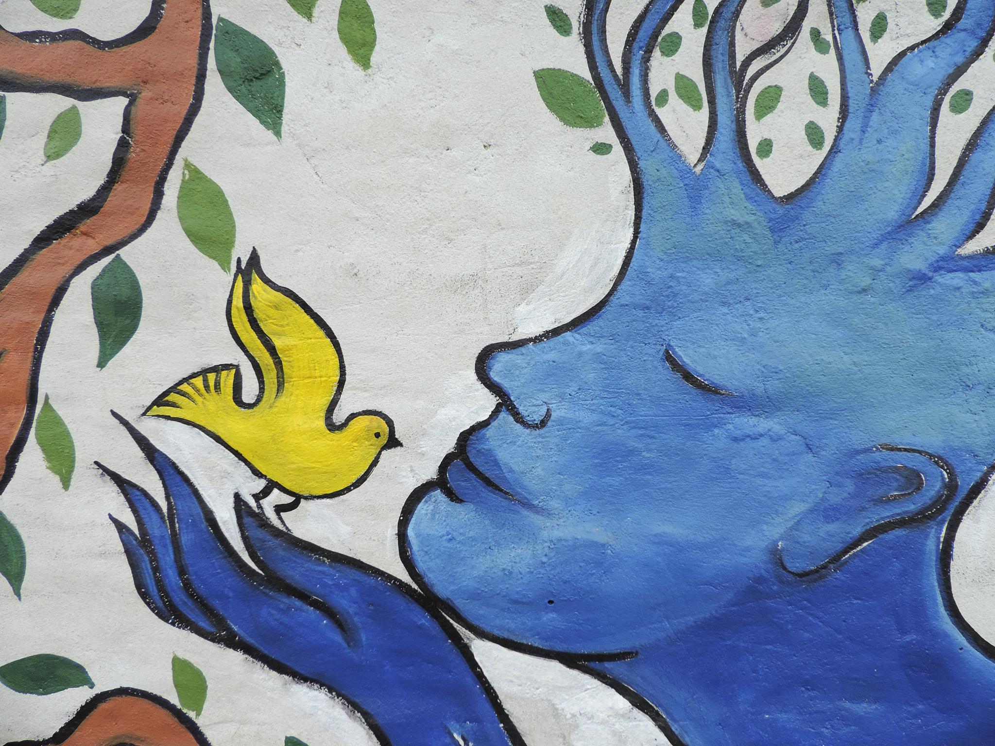 For this mural, Bipin brings together humans, nature, society, and religion as one interconnected whole. Two hands form the shape of a nest. Inside, two birds rest safely. The birds represent school children waiting for their parents at the school gate. One day, they will grow and fly into the world.