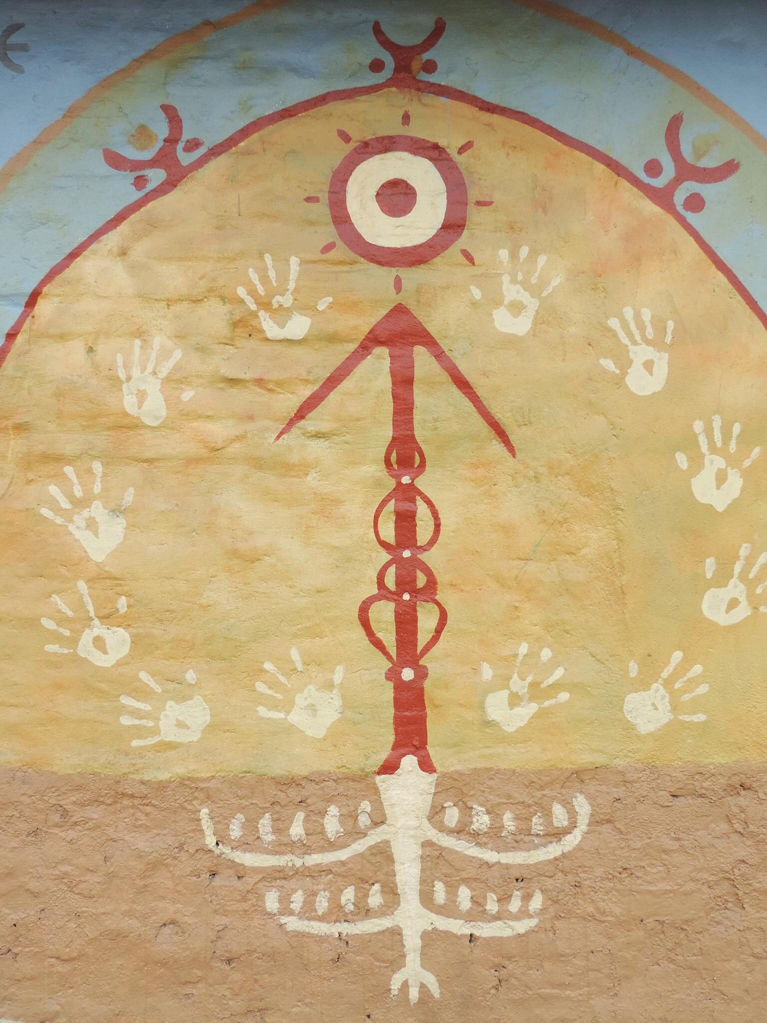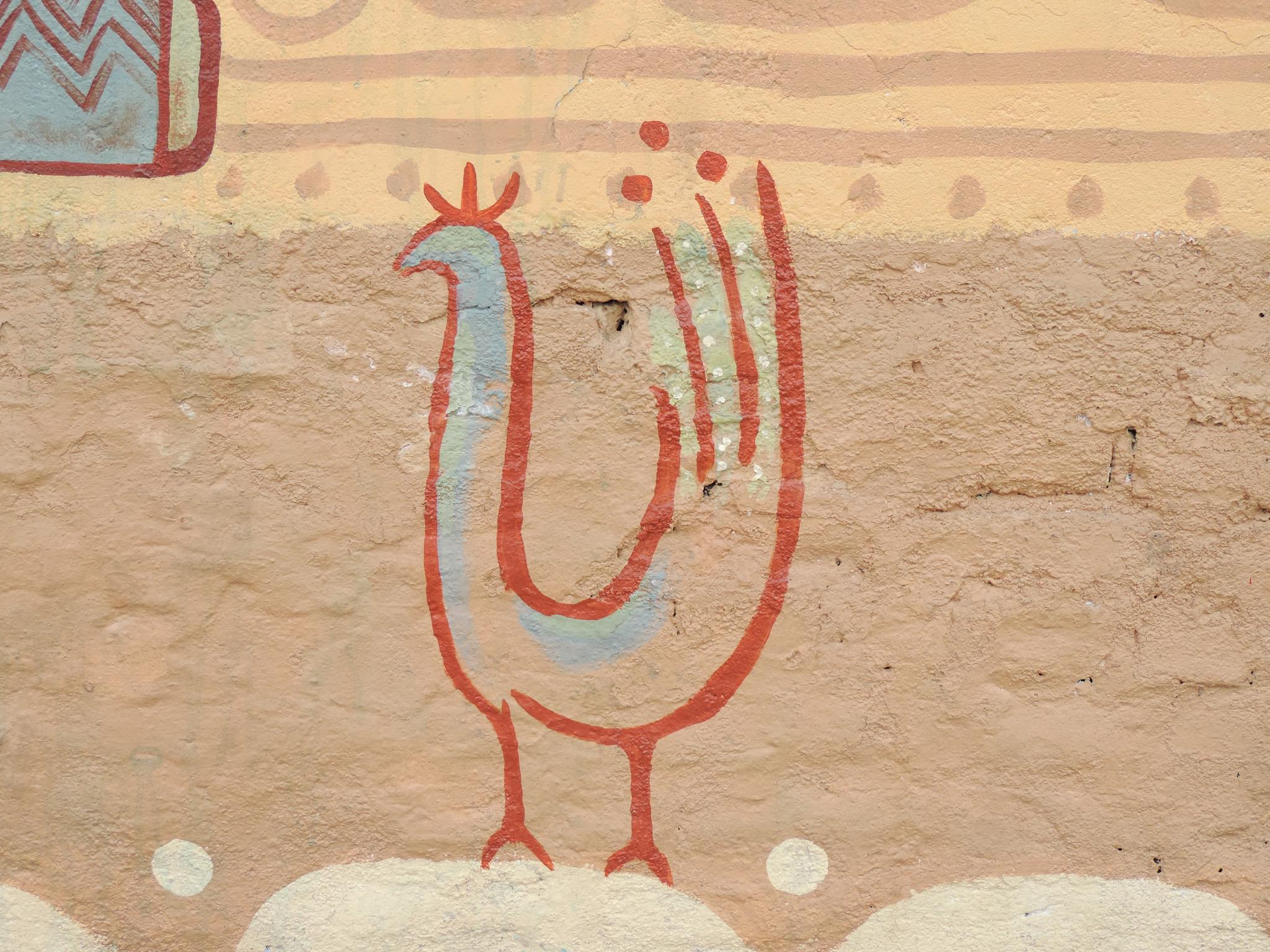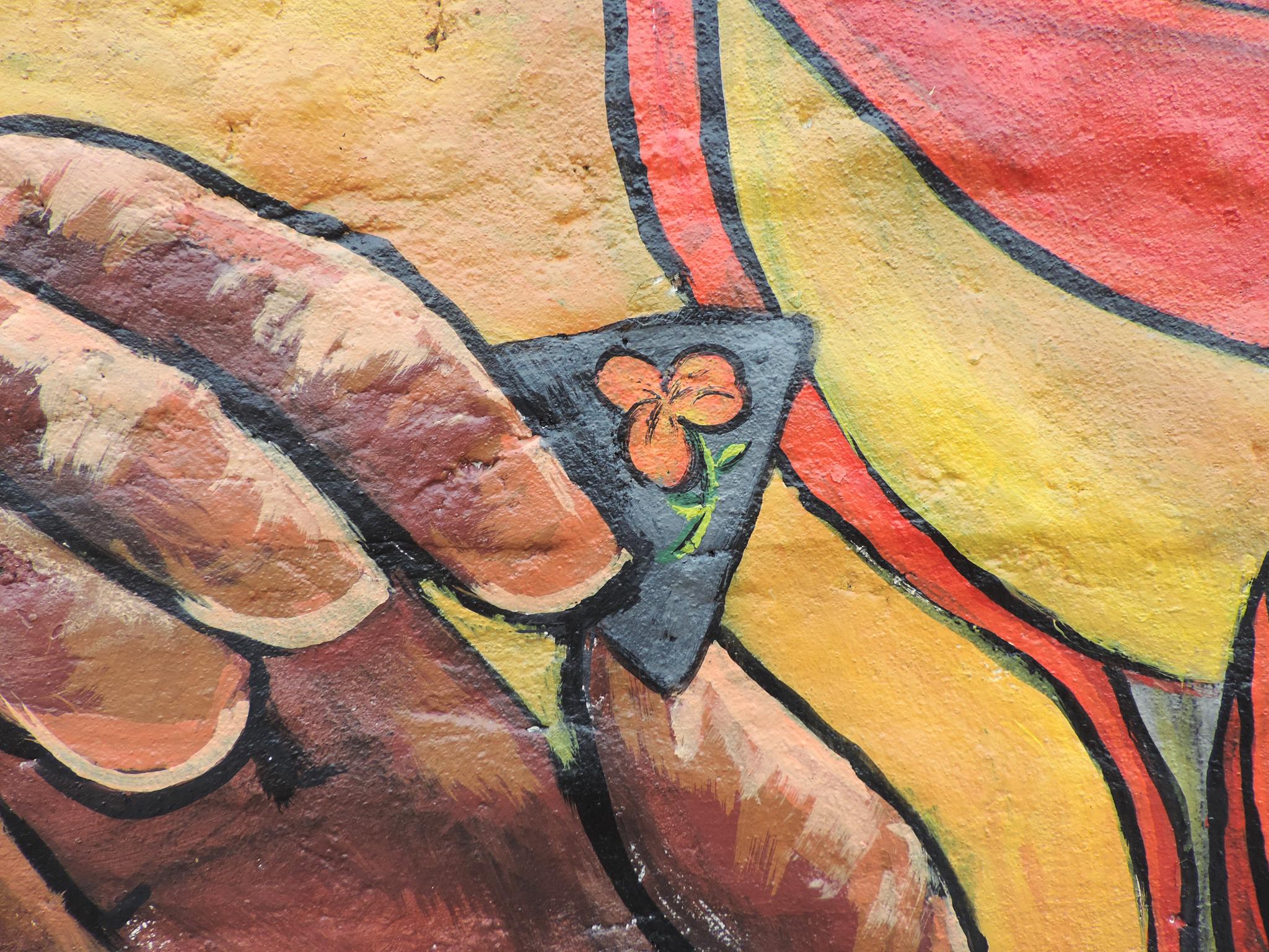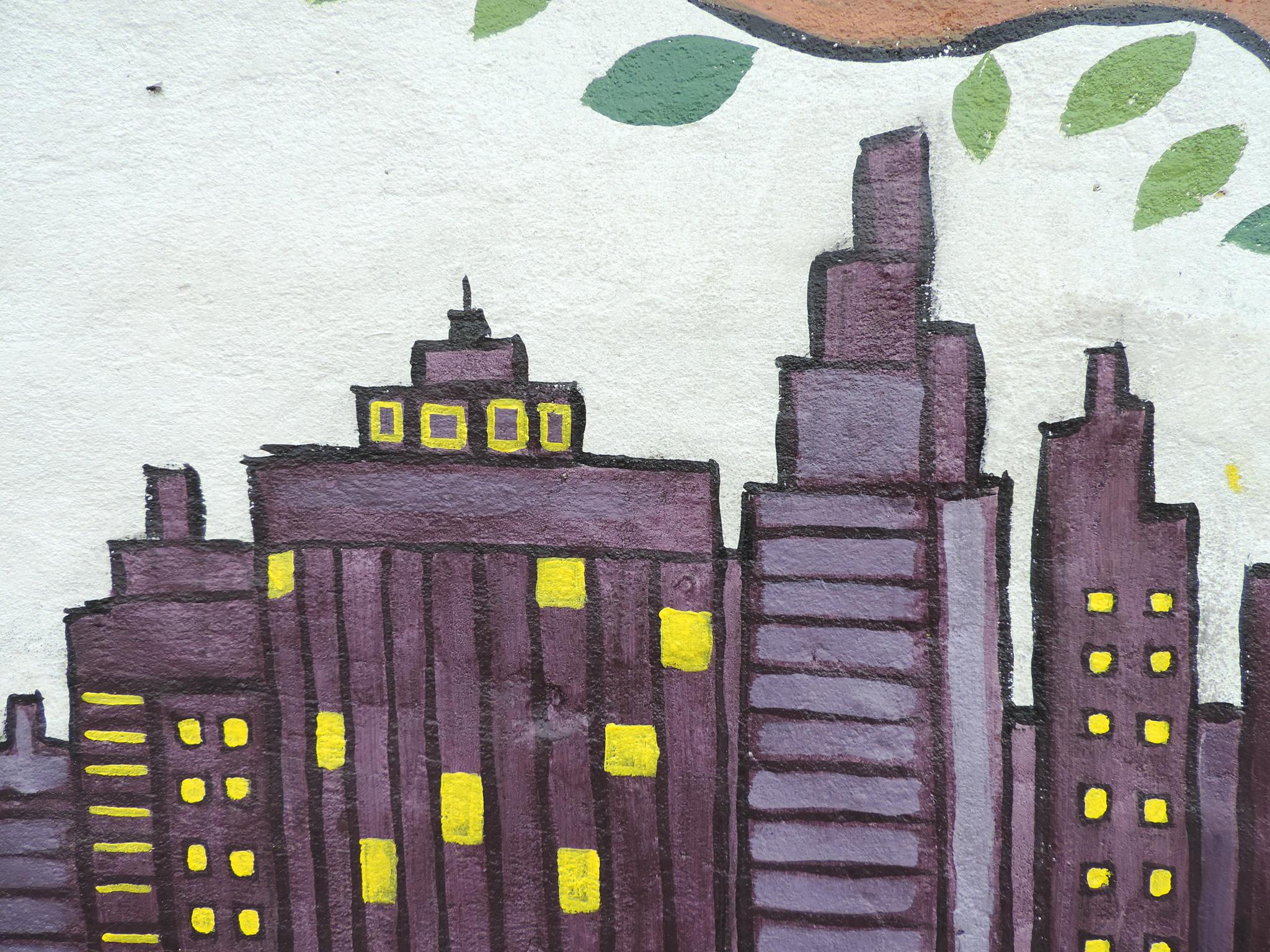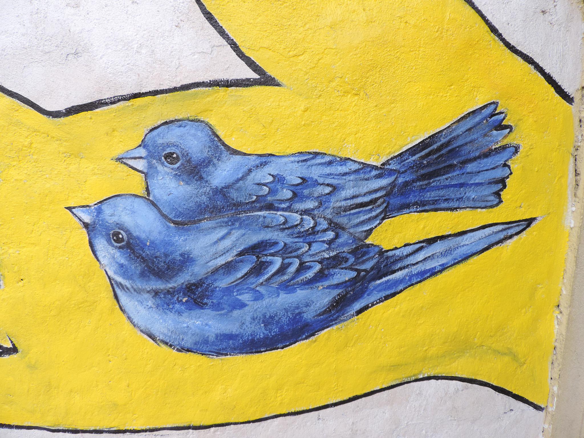 For this mural, Bipin brings together humans, nature, society, and religion as one interconnected whole. Two hands form the shape of a nest. Inside, two birds rest safely. The birds represent school children waiting for their parents at the school gate. One day, they will grow and fly into the world.