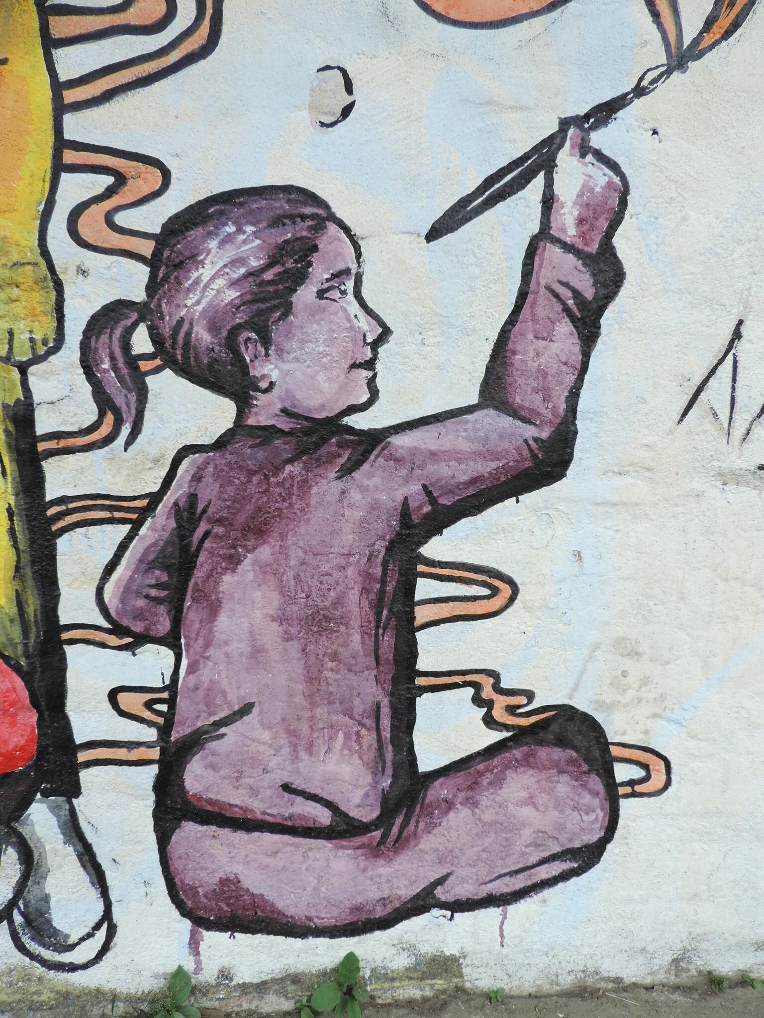 For this mural, SEAMAN collaborated with UTSAV. The artwork reflects the innocence of children and the beauty of simple, joyful moments. Young figures are shown creating art and making music, immersed in what they love without fear or hesitation. Surrounding them are flowing calligraphy messages by SeaMan, inspired by the Saraswati mantra, offering words of encouragement and empowerment.