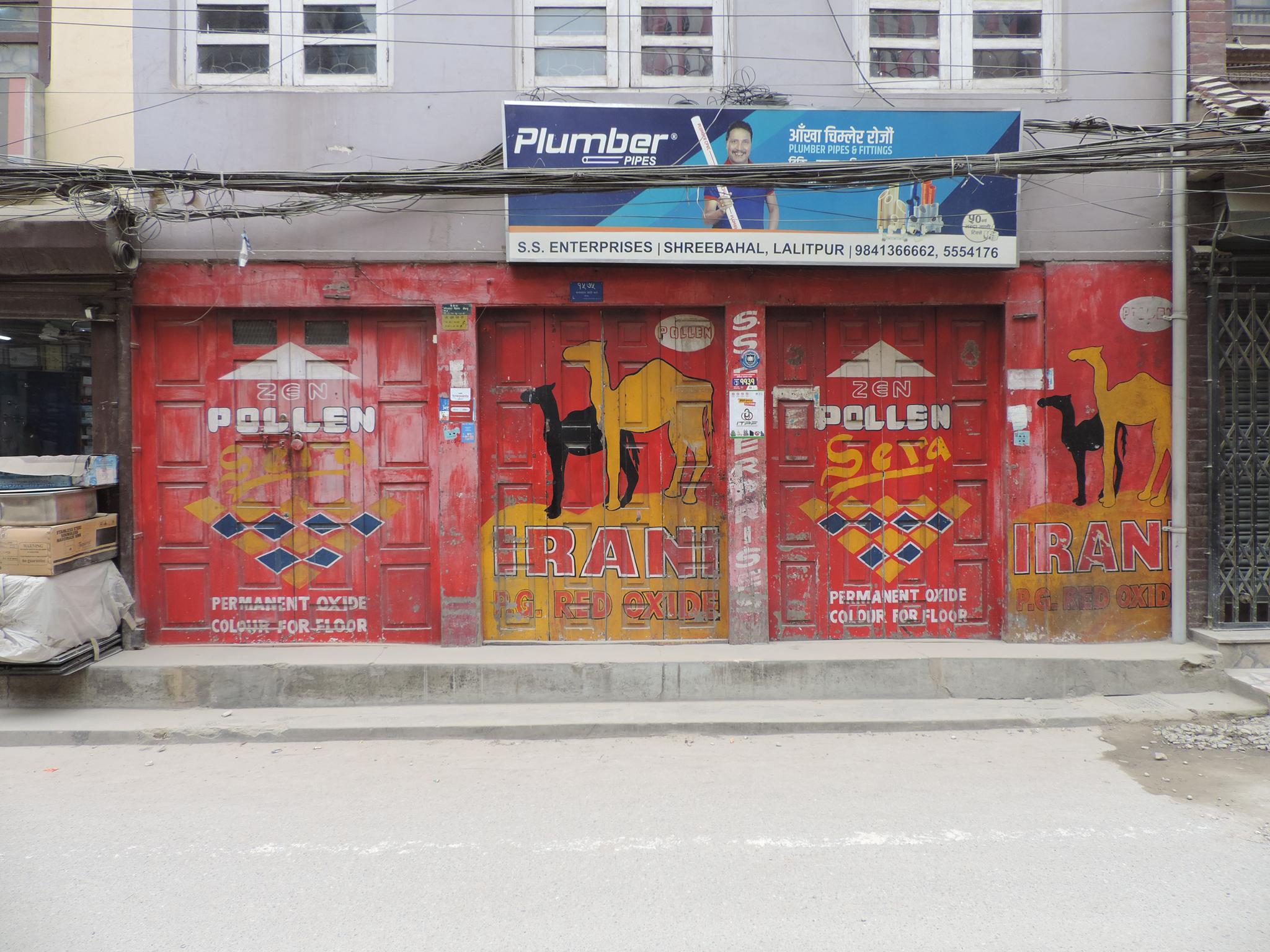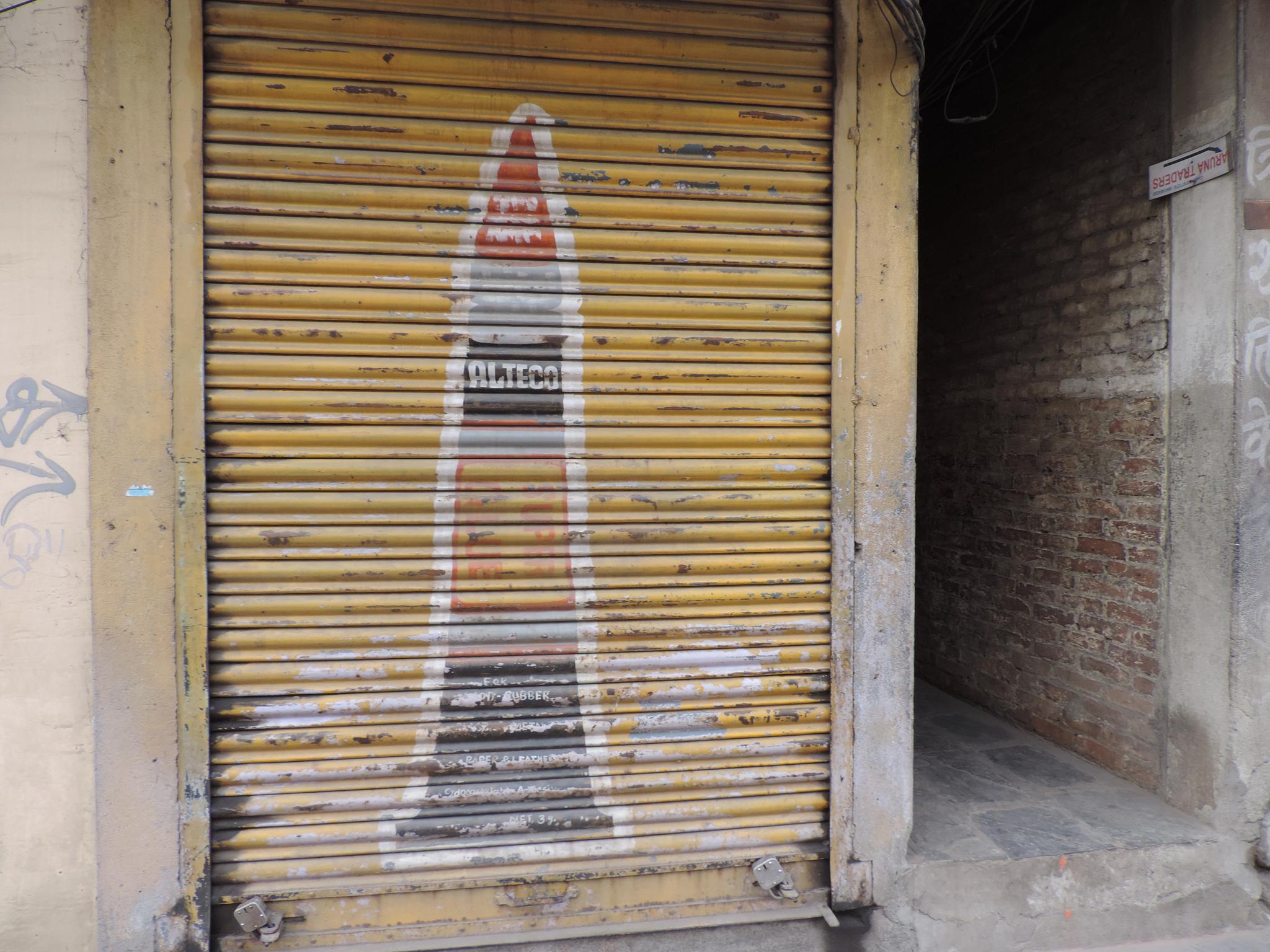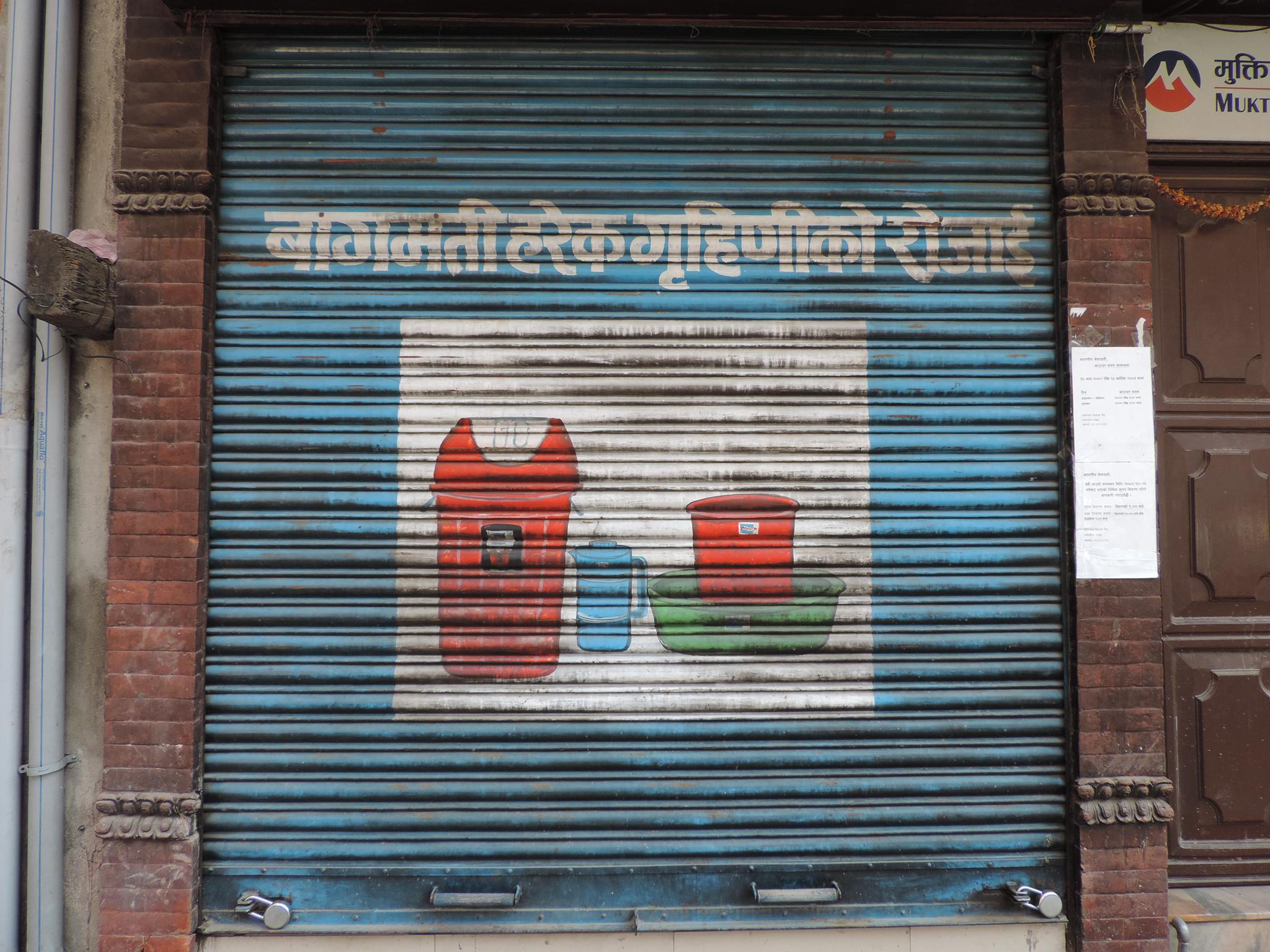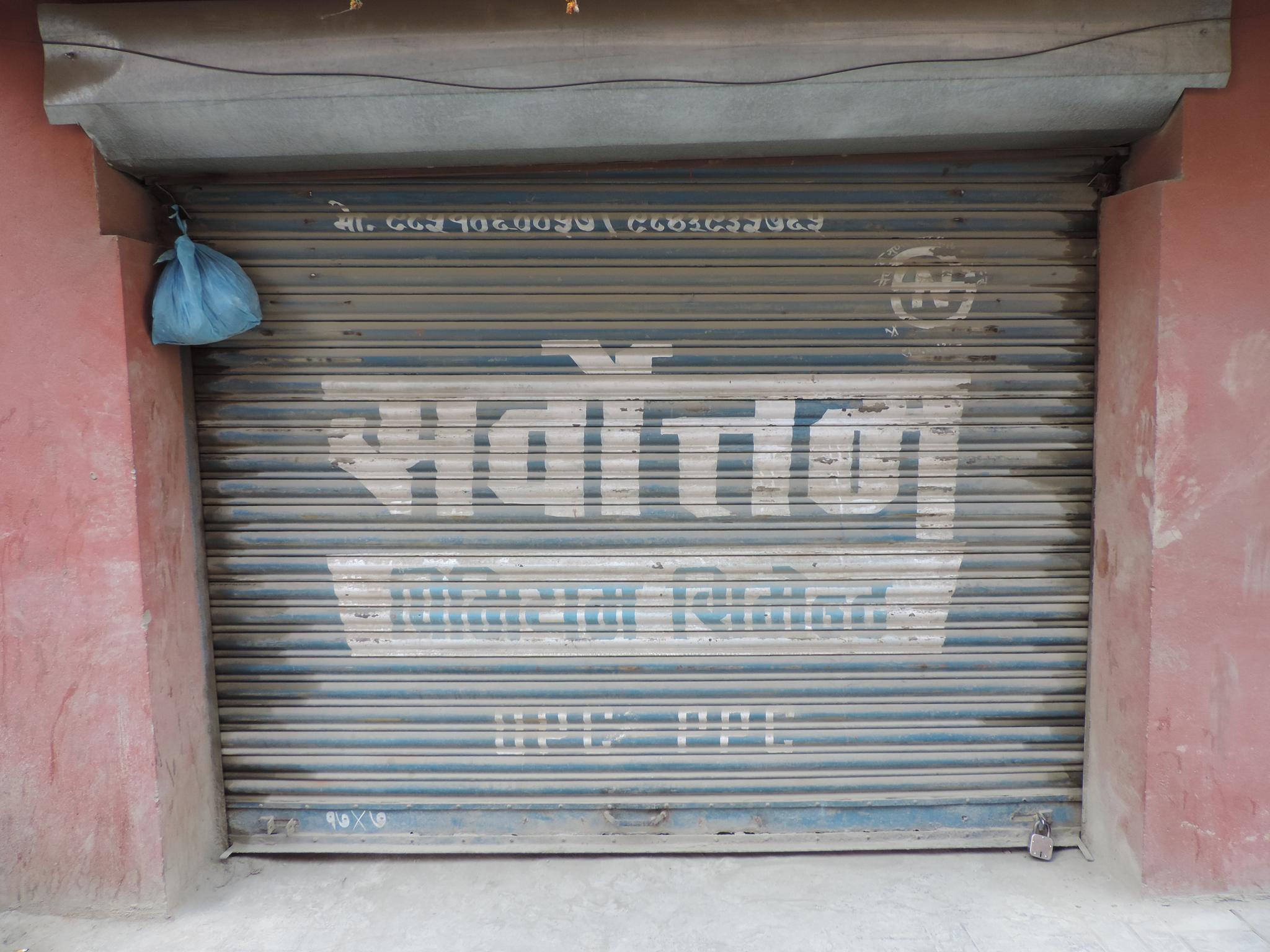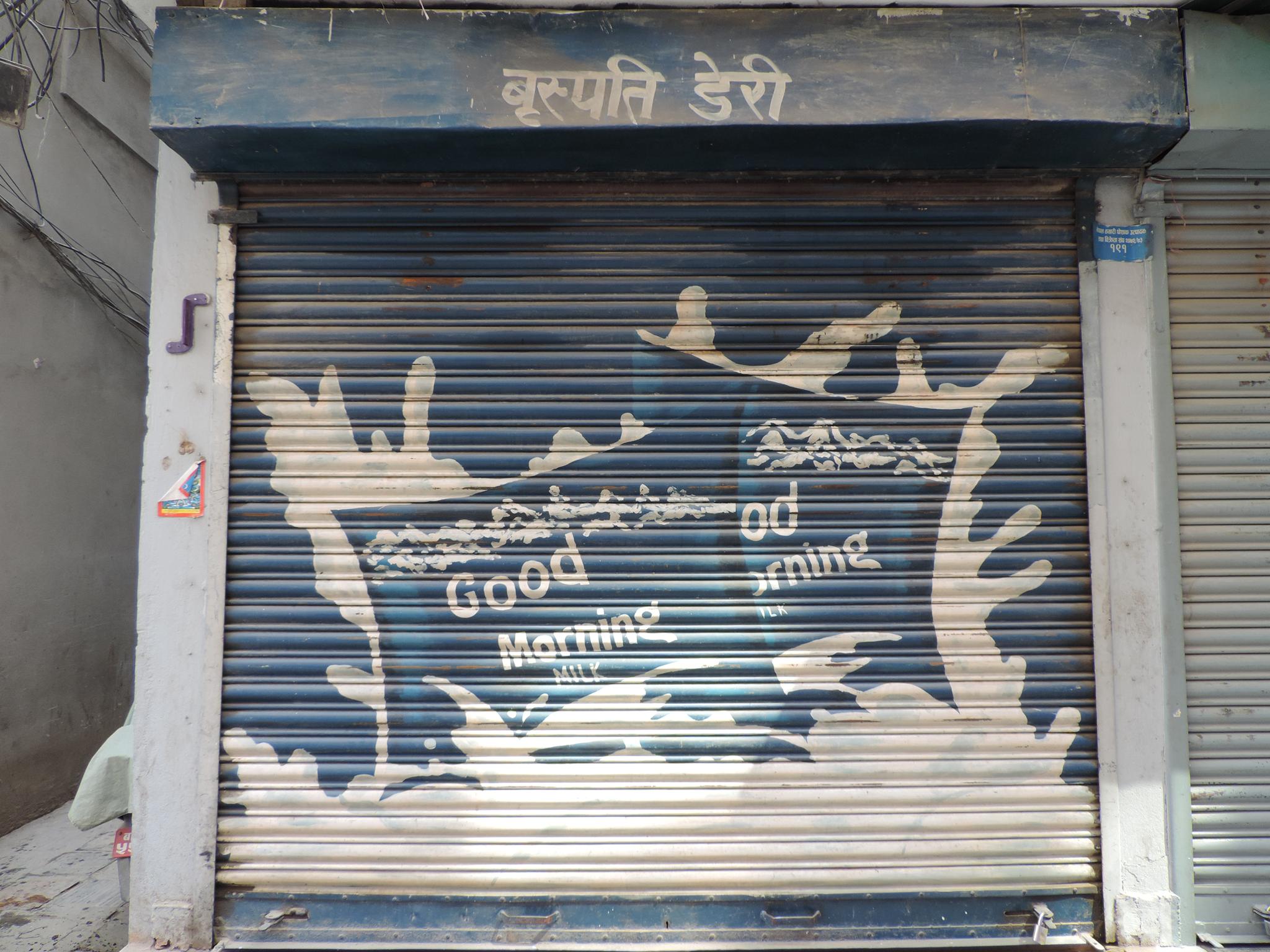 The streets of Kathmandu and Patan are lined with countless stores, handcraft workshops, and small retailers. Their corrugated roll-up doors are each adorned with logos and business names, but here in Nepal, these advertisements are still painted in selfmade processes. At first, we had only photographed a few of these intriguing shutters, but more and more were added, and so a whole collection of nearly 150 of these doors has now been created. It is certainly a noticeable and significant part of the street scene and urban landscape; moreover, aside from the commercial aspect, these are nonetheless painted graphics in urban space.