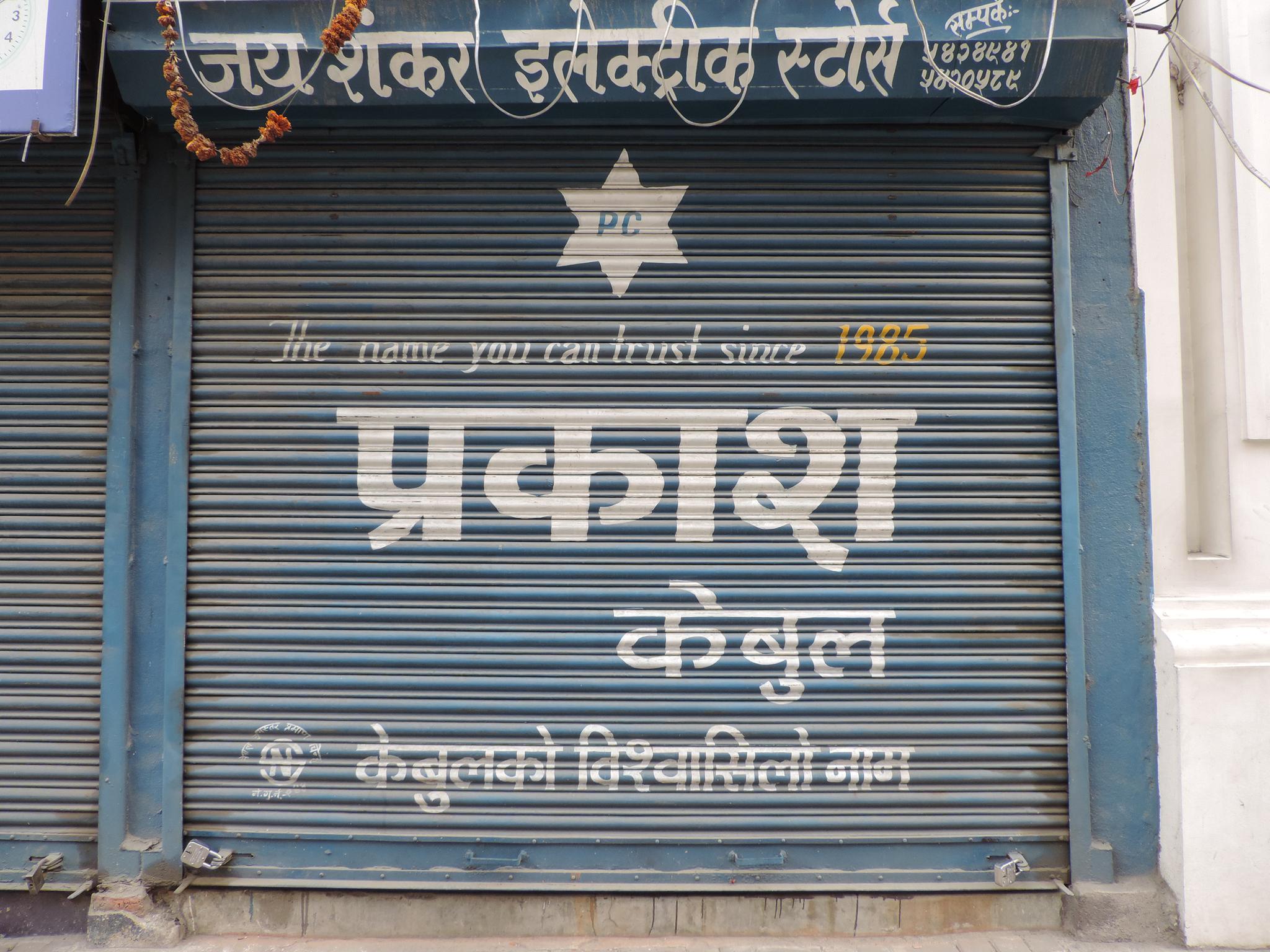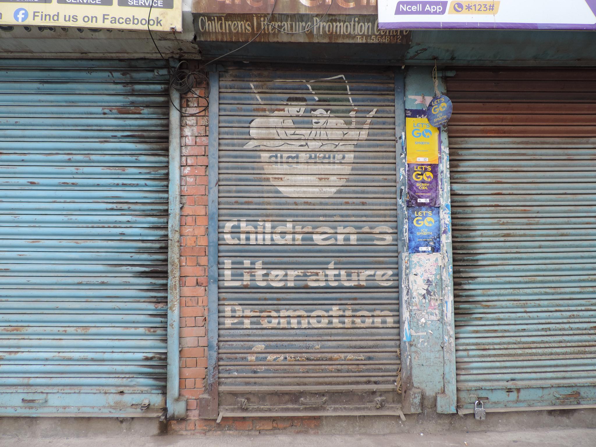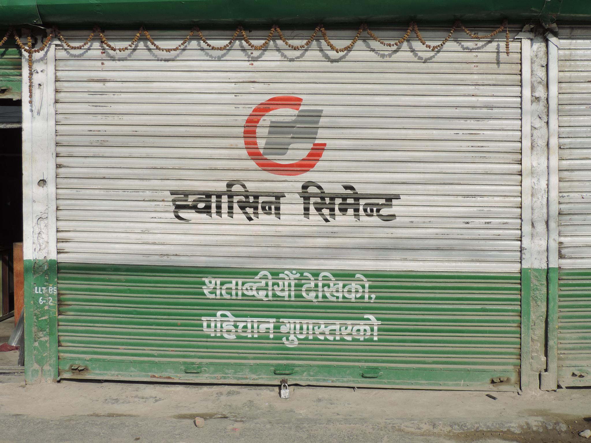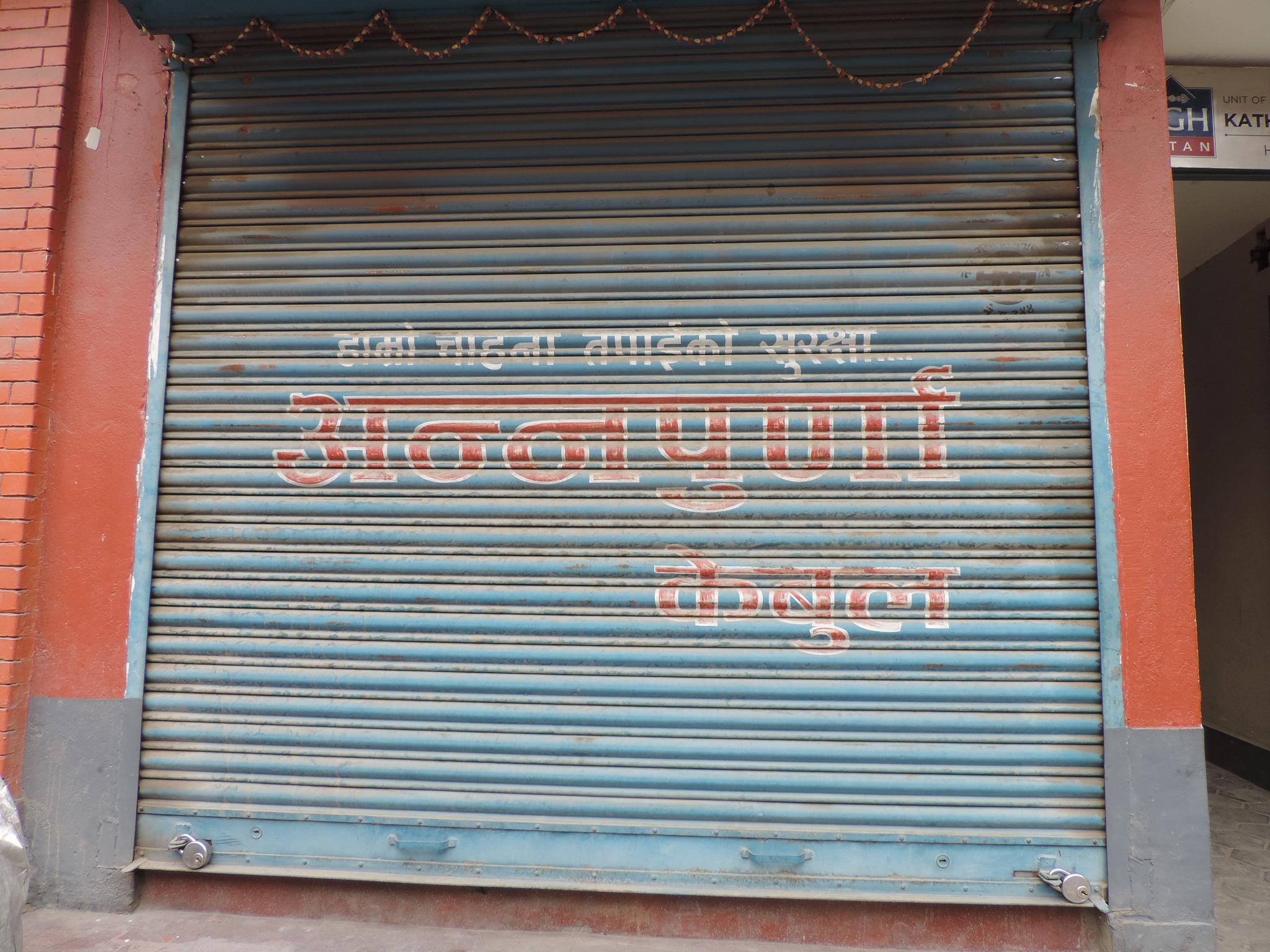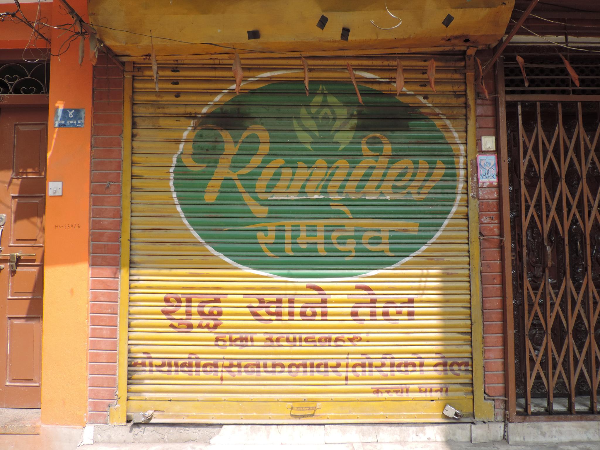 The streets of Kathmandu and Patan are lined with countless stores, handcraft workshops, and small retailers. Their corrugated roll-up doors are each adorned with logos and business names, but here in Nepal, these advertisements are still painted in selfmade processes. At first, we had only photographed a few of these intriguing shutters, but more and more were added, and so a whole collection of nearly 150 of these doors has now been created. It is certainly a noticeable and significant part of the street scene and urban landscape; moreover, aside from the commercial aspect, these are nonetheless painted graphics in urban space.