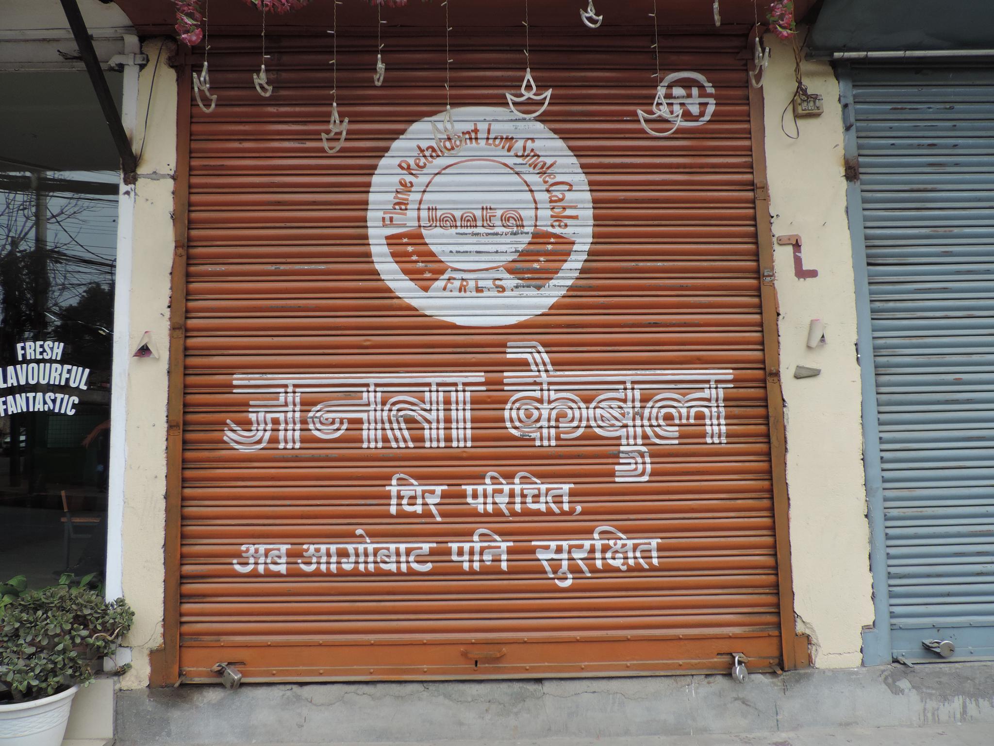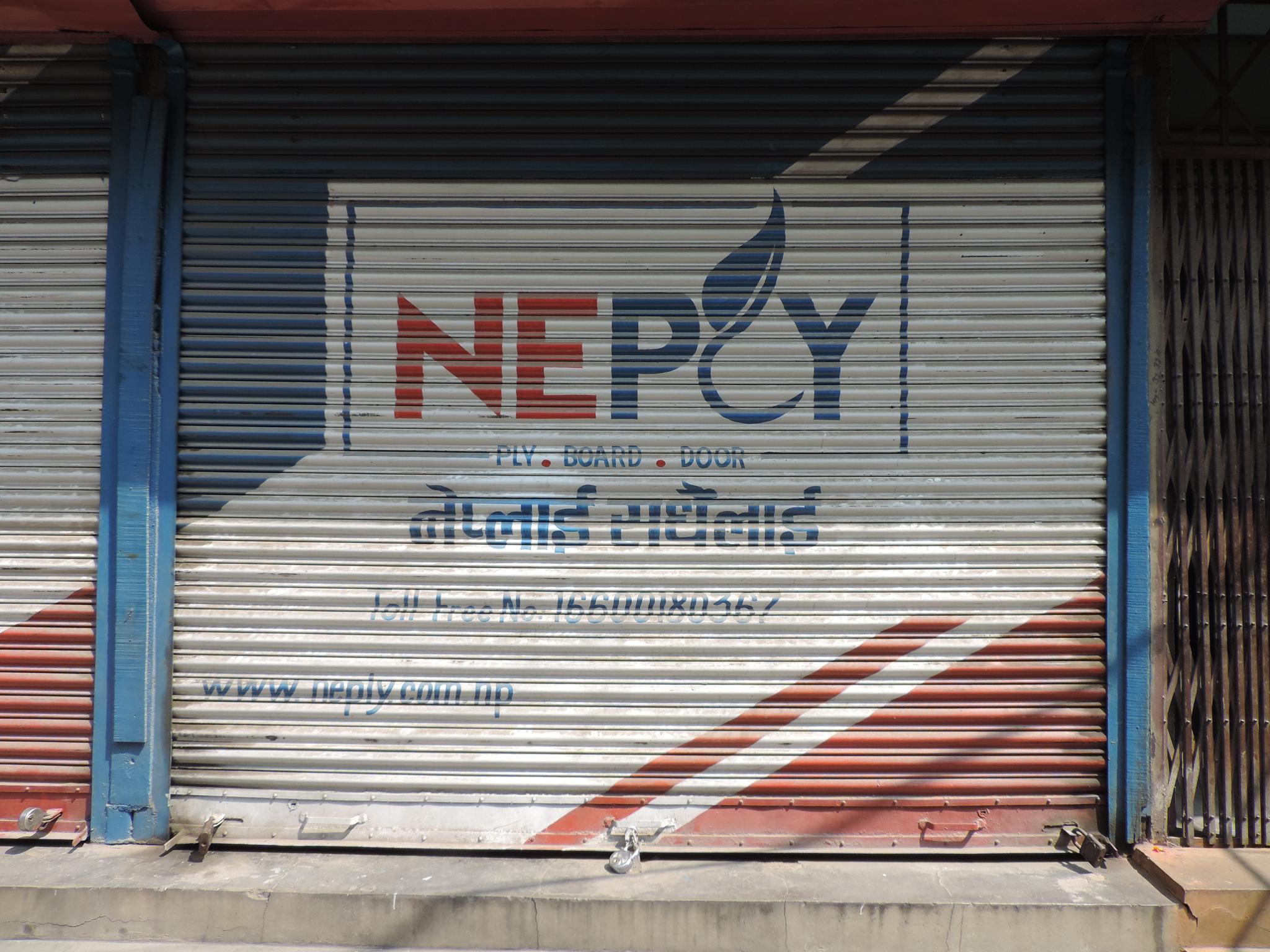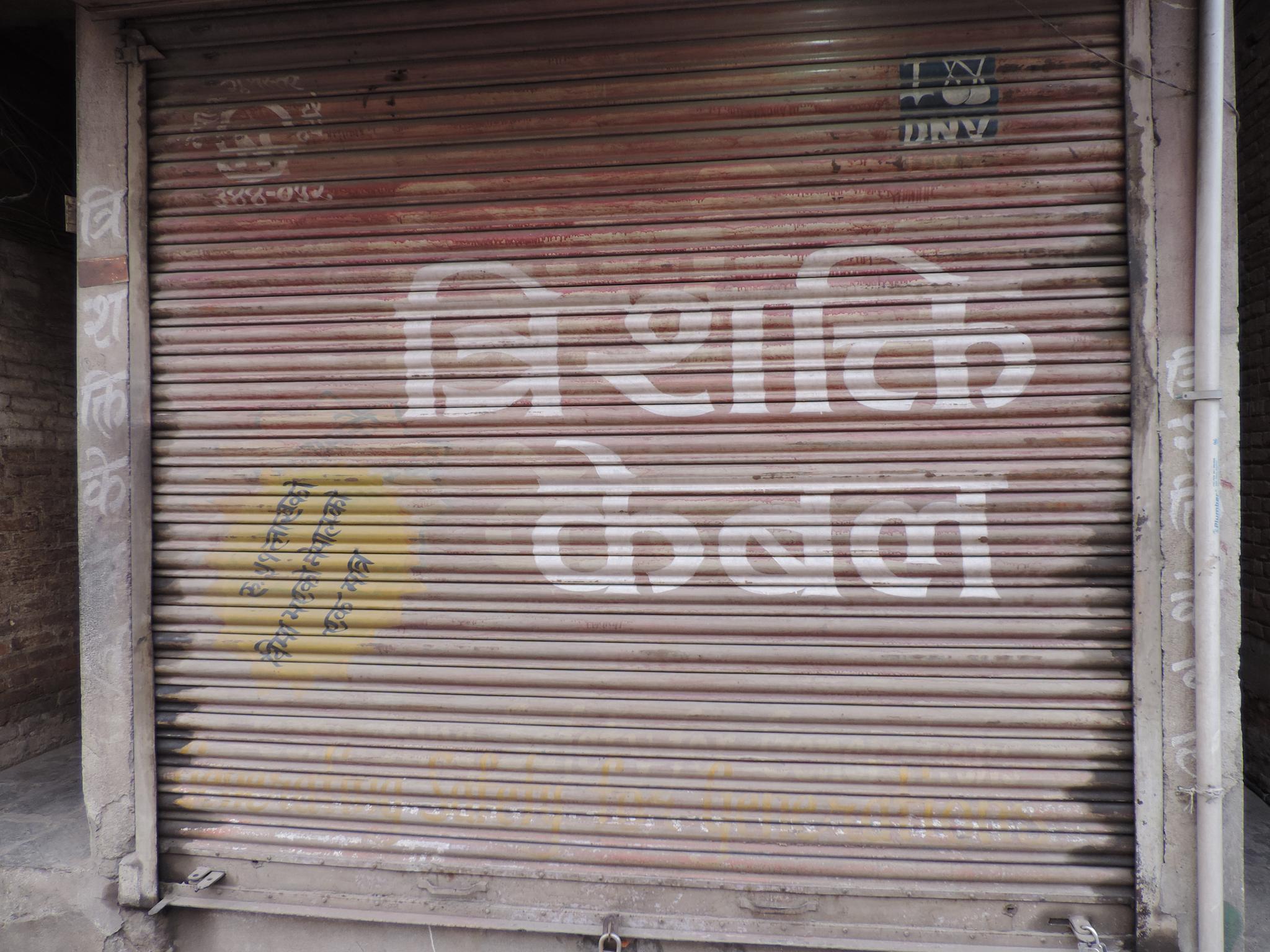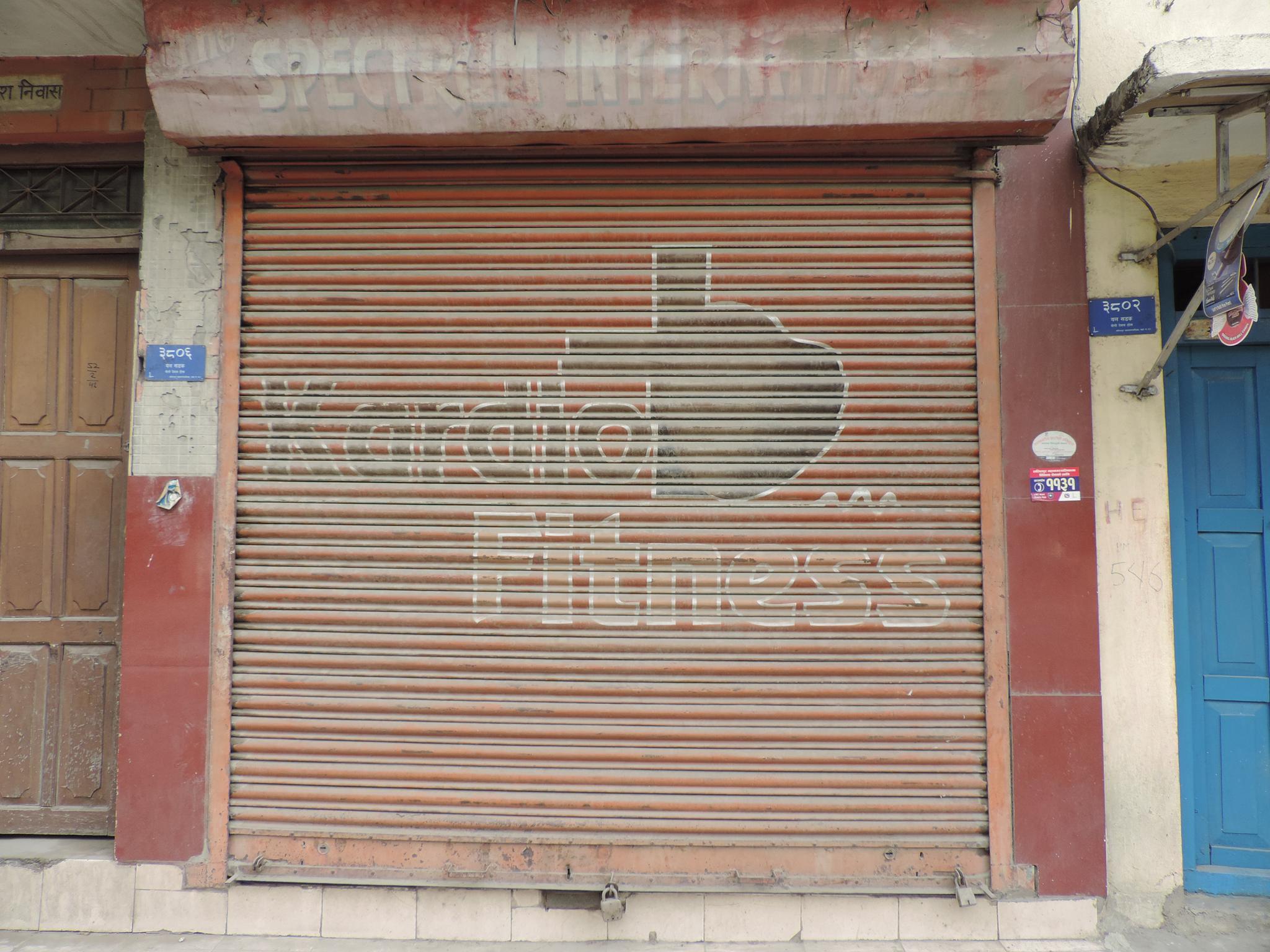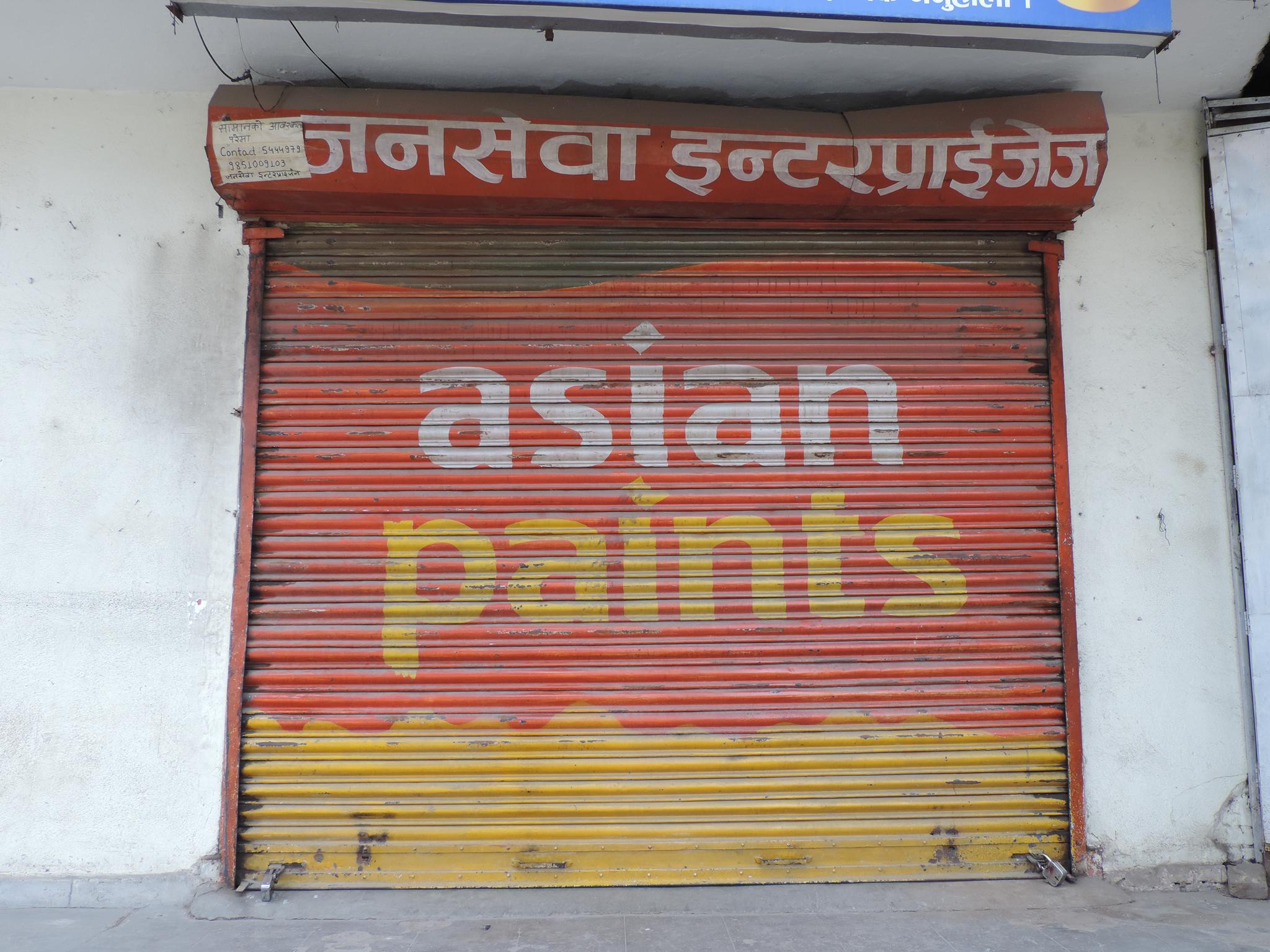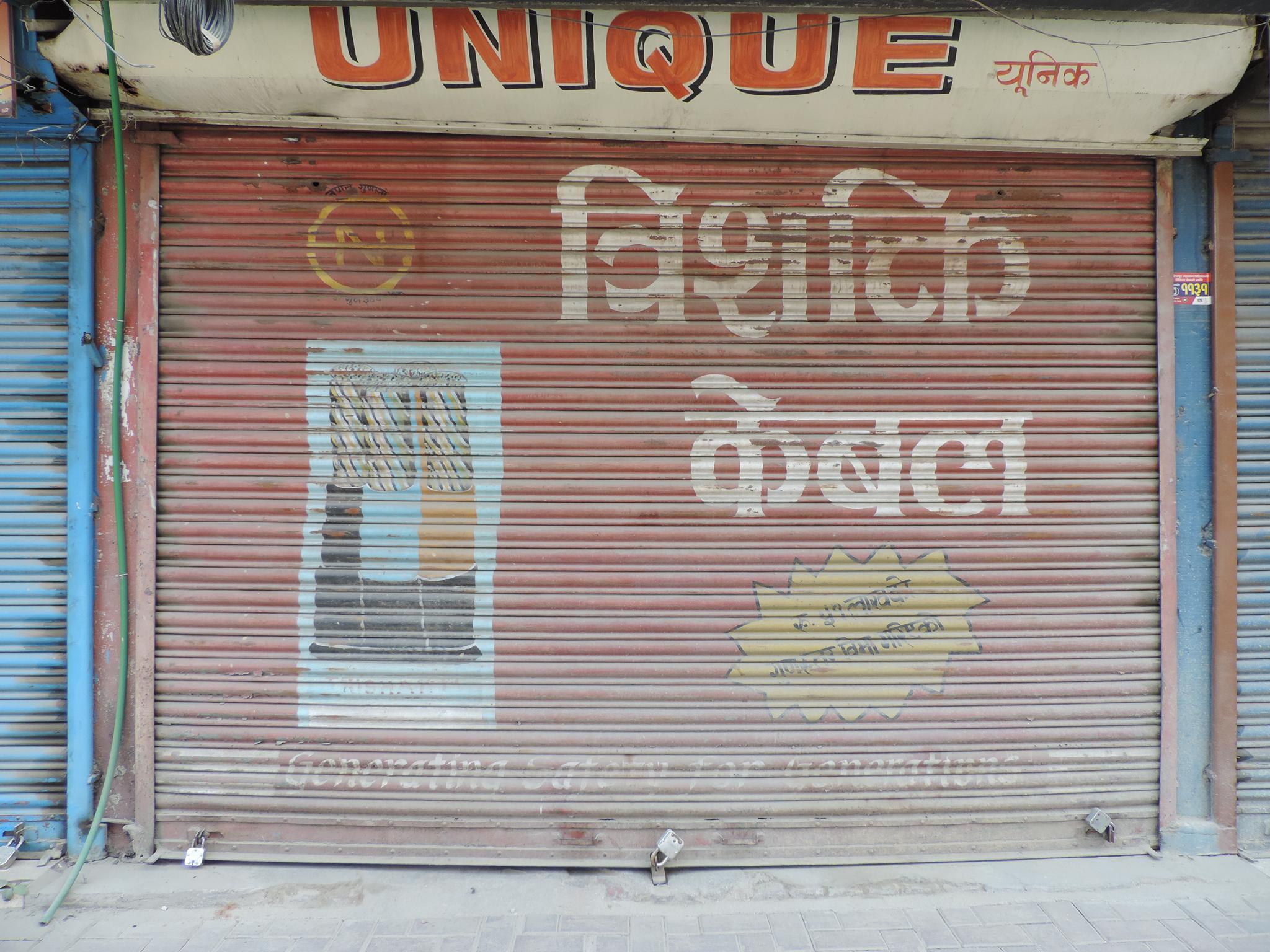 The streets of Kathmandu and Patan are lined with countless stores, handcraft workshops, and small retailers. Their corrugated roll-up doors are each adorned with logos and business names, but here in Nepal, these advertisements are still painted in selfmade processes. At first, we had only photographed a few of these intriguing shutters, but more and more were added, and so a whole collection of nearly 150 of these doors has now been created. It is certainly a noticeable and significant part of the street scene and urban landscape; moreover, aside from the commercial aspect, these are nonetheless painted graphics in urban space.