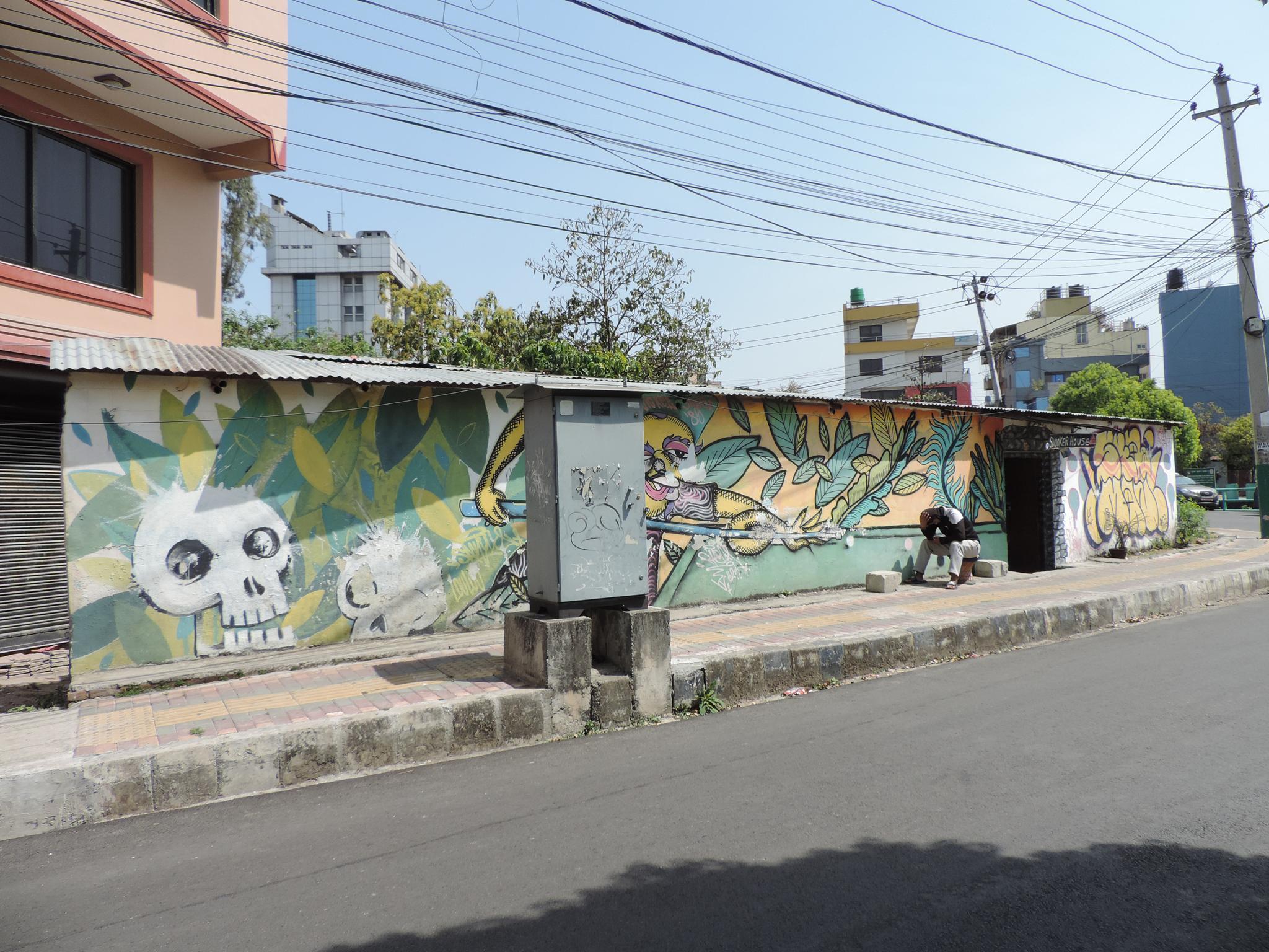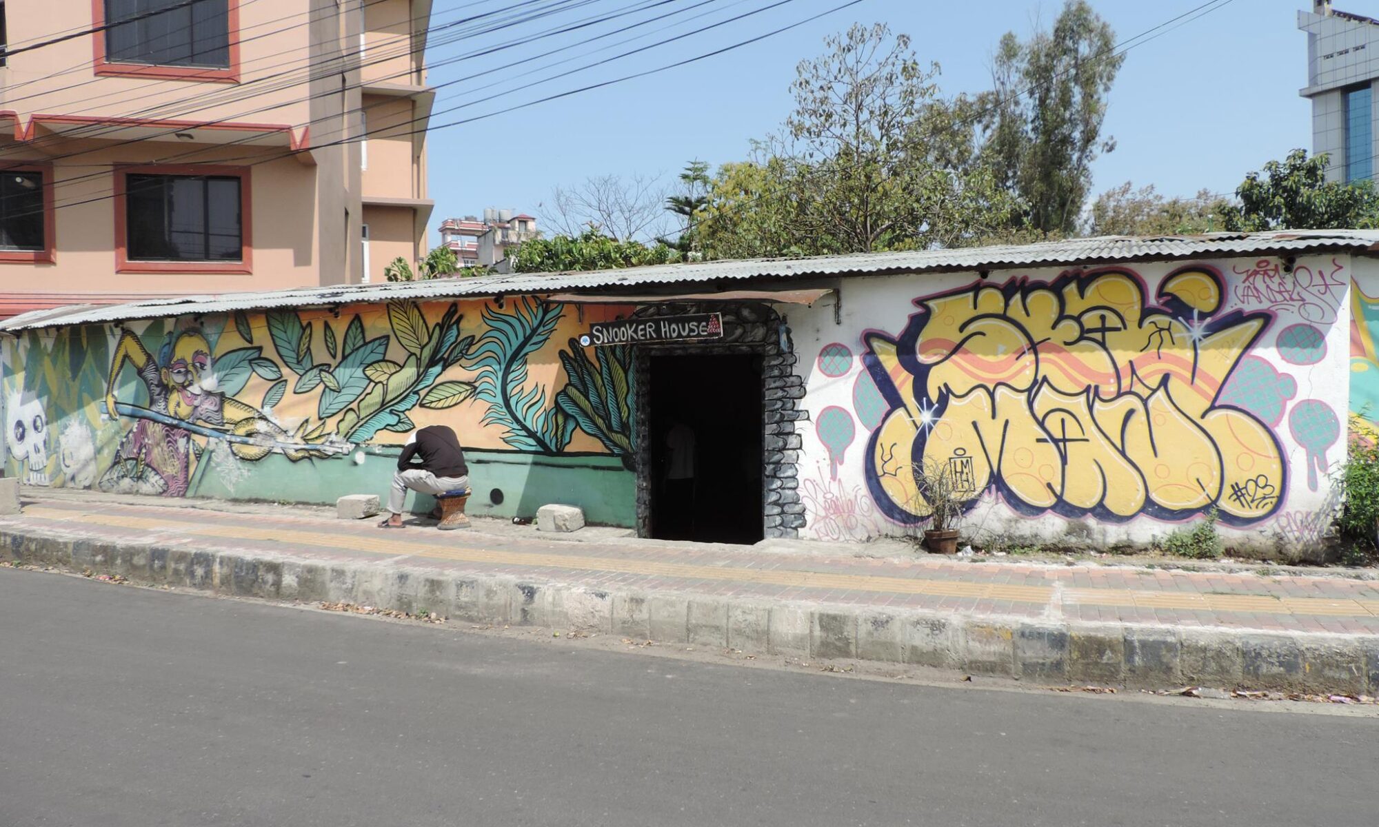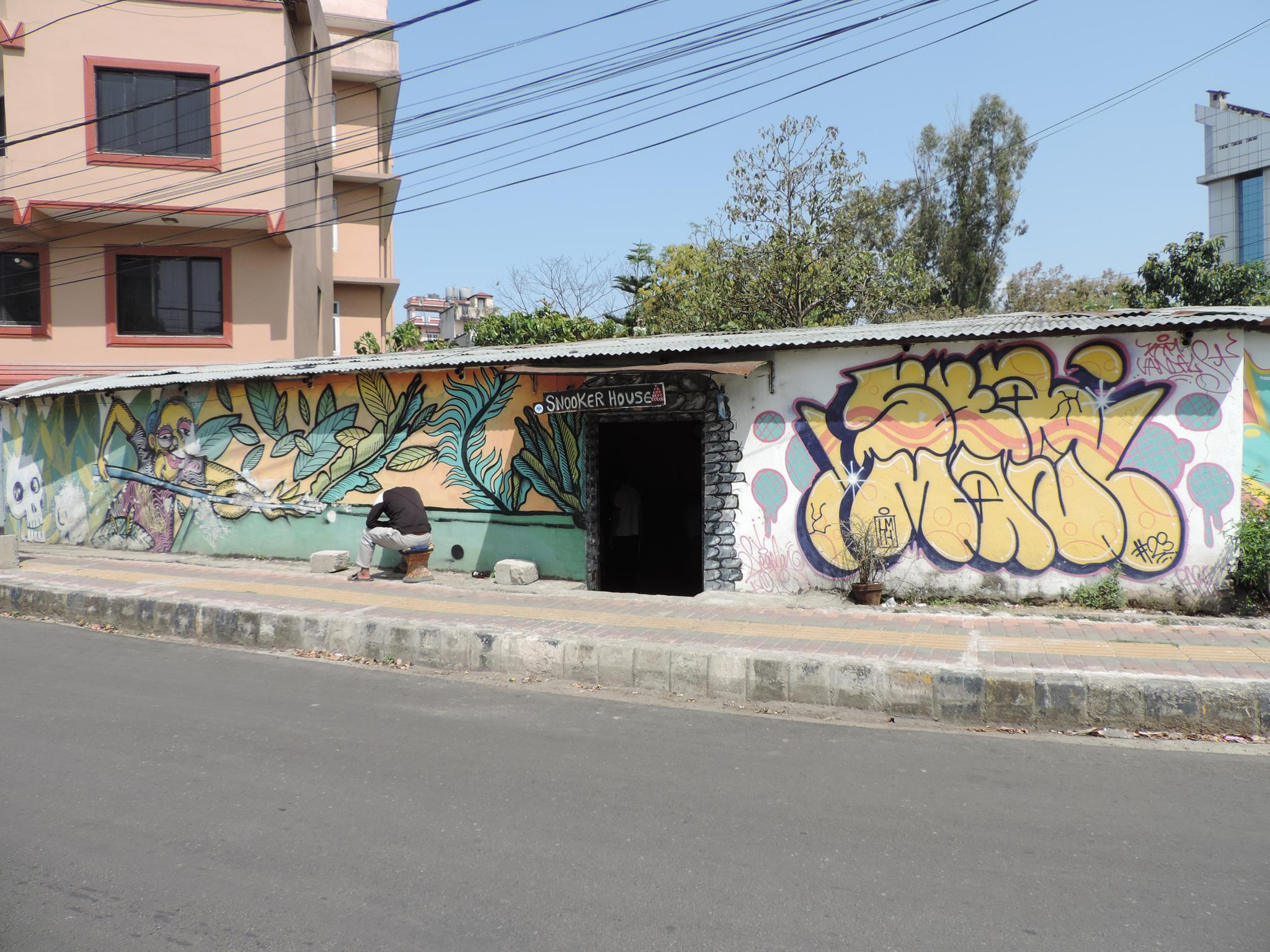In the Buddhanagar district of Kathmandu, on Rajesh Marg along the Dhobi Khola River, there is a snooker hall called Babarmahal Snooker House. The exterior walls of this building and the adjacent ones are covered with graffiti; especially the PSD CREW was active here, as well the artist SAADHUX left a great character szenario. There are also some wall works inside, and streetart can also be found on other buildings along the road.