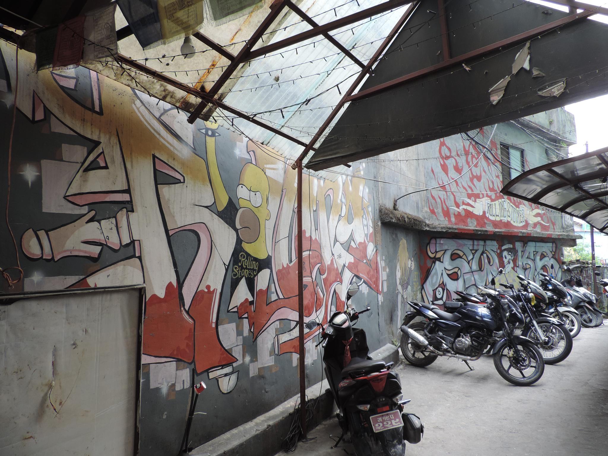 The Rolling Stones Rock Bar is one of the most famous live music venues in Pokhara, located on Lakeside Road. It was founded around 2017 and quickly became a central gathering place for rock music fans as well as for local and international musicians such as Abhaya & The Steam Engines, The Uglyz, Cobweb or Sabin Rai & The Pharaoh. In addition to nearly daily concerts, the space hosts as well DJ sets and parties. Graffiti enthusiasts will also find plenty to enjoy here, as the small alley leading to the entrance is adorned with several graffiti and streetart pieces. At the start rocking Homer Simpson is welcoming you!