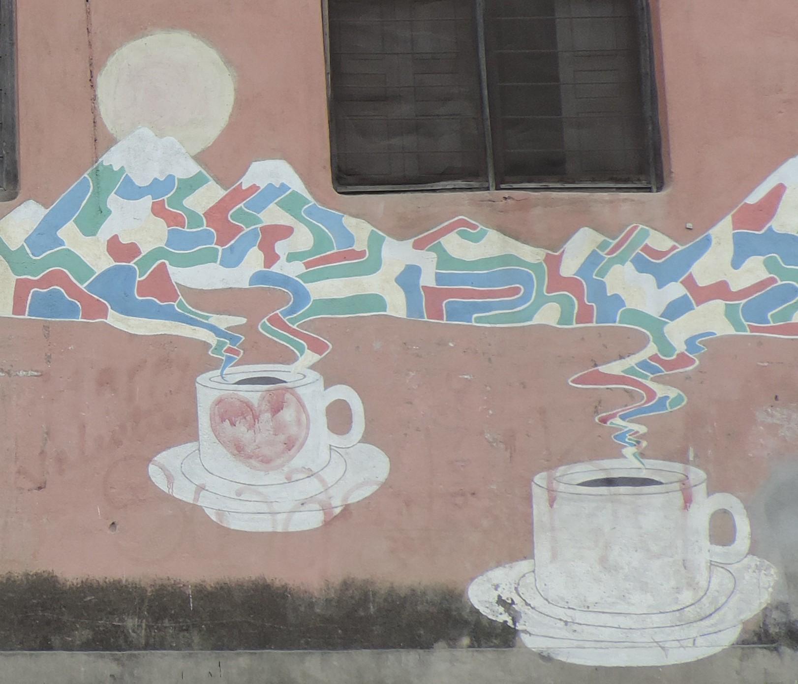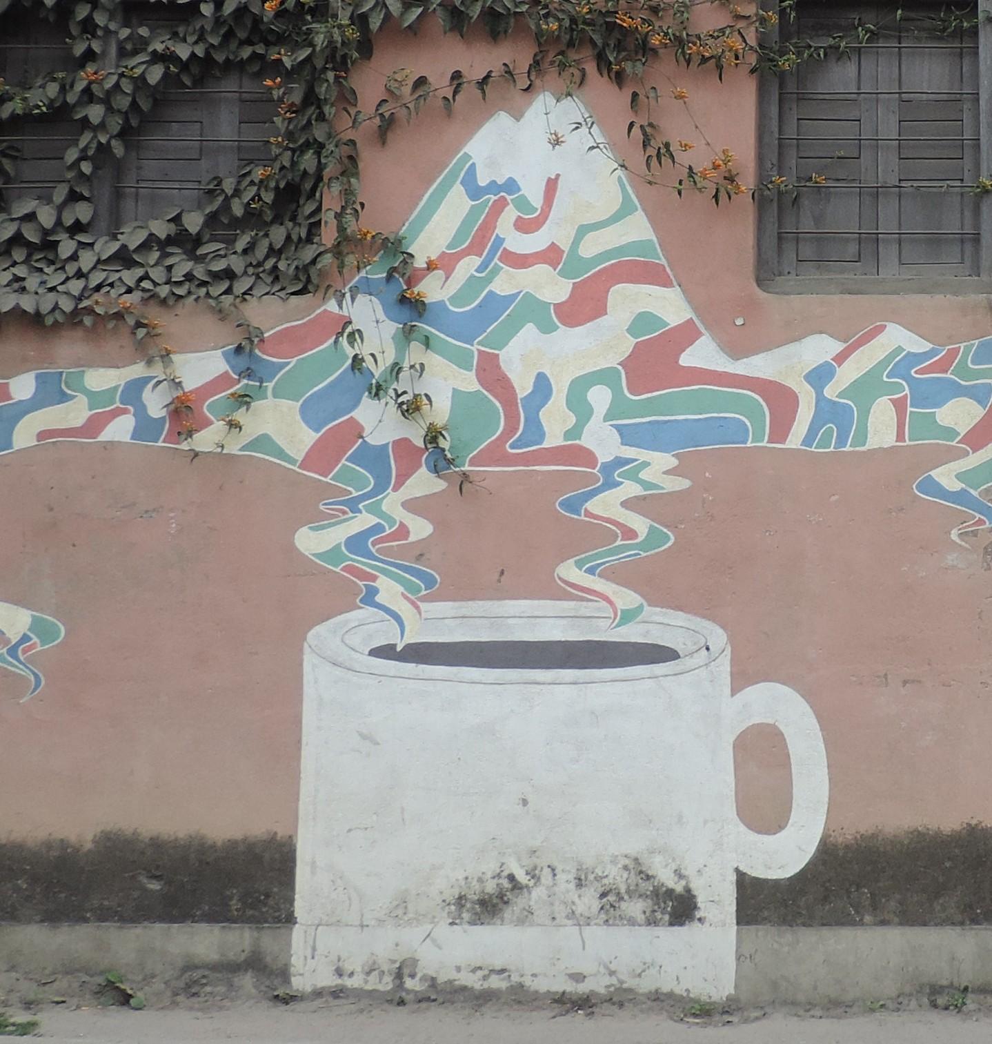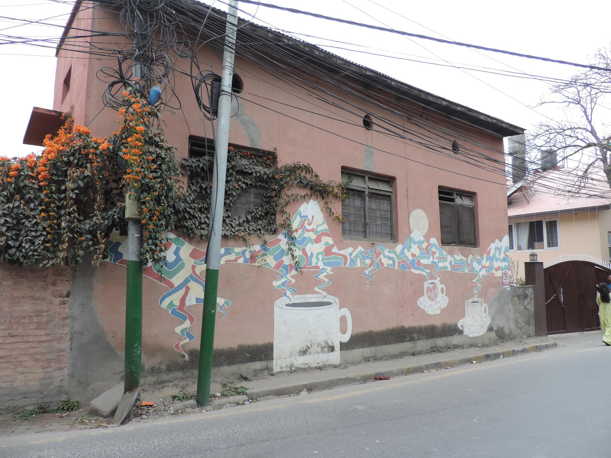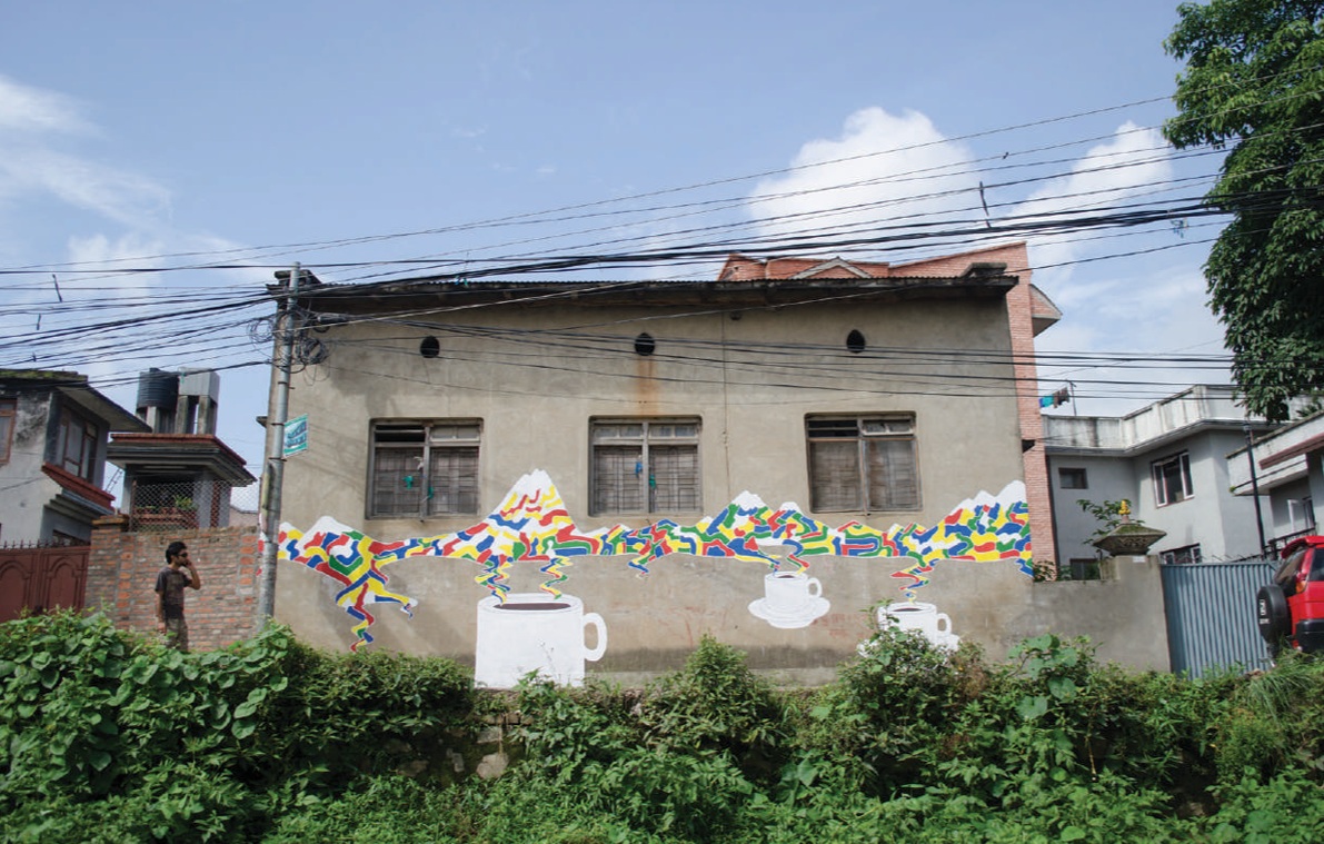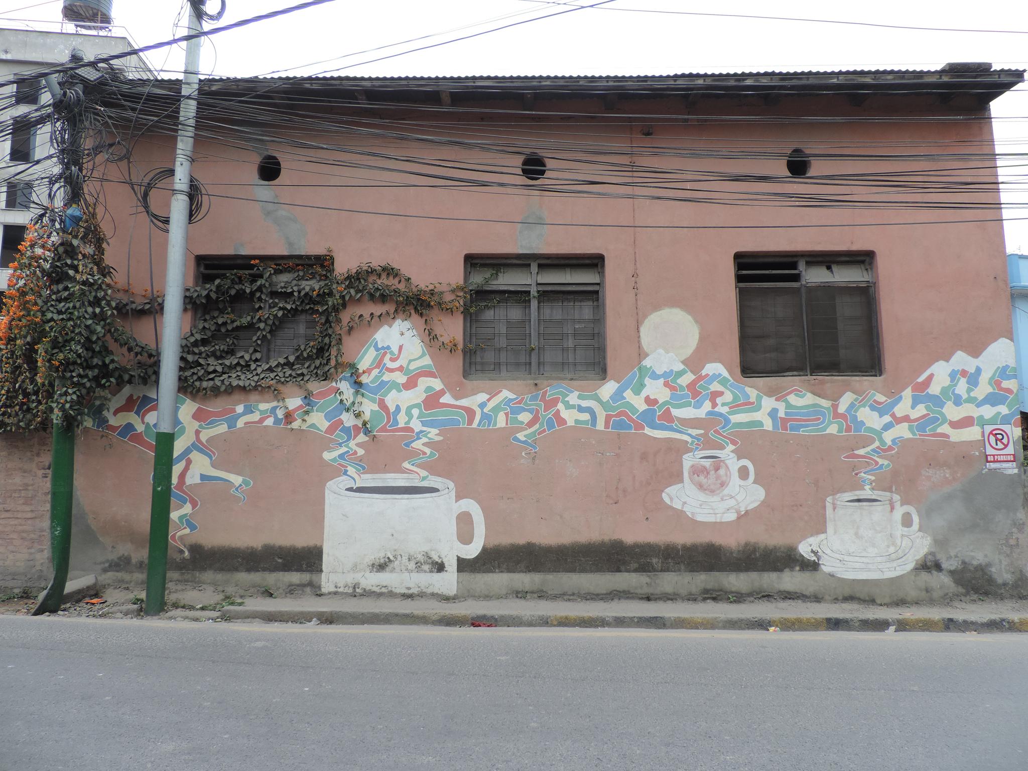 This artwork is part (54) of the awesome series KOLOR KATHMANDU, which consists of 75 murals made throughout the cities of Kathmandu and Lalitpur representing the 75 districts of the country. The fantastic project initiated by the SATTYA MEDIA ARTS COLLECTIVE took part in 2013 and at this time the country had 75 districts, after 2015 with an updated constitution there are now 77 districts. The shown wall painting shows the artwork for the district Gulmi and its connection to coffee.