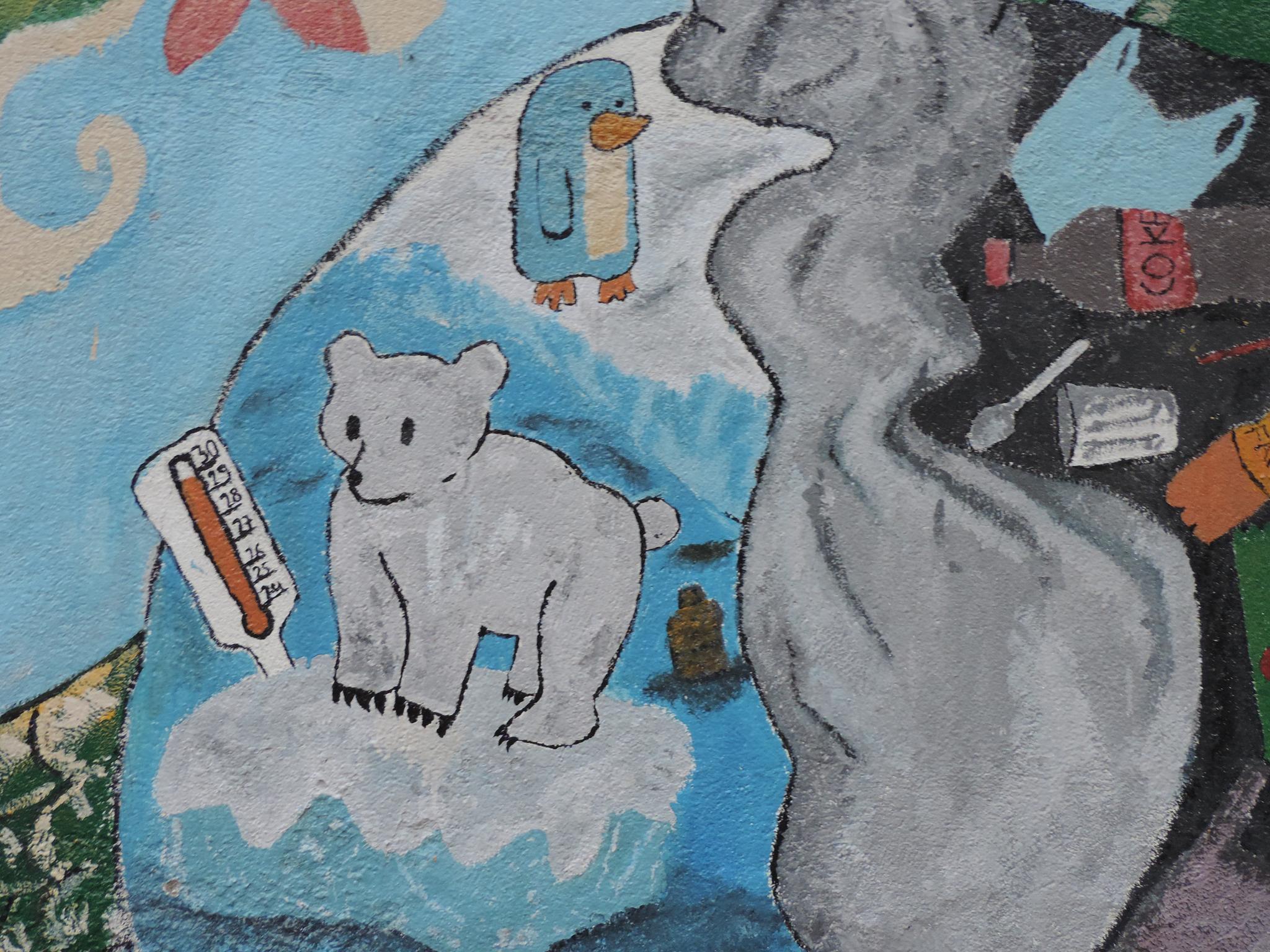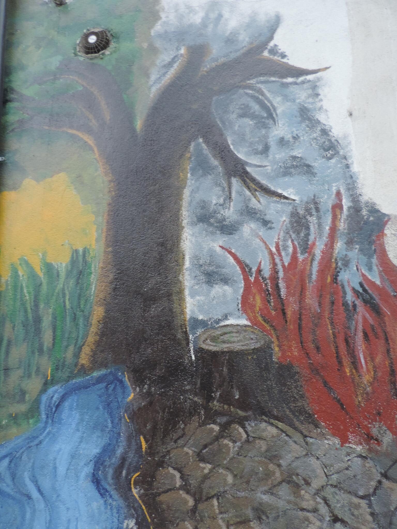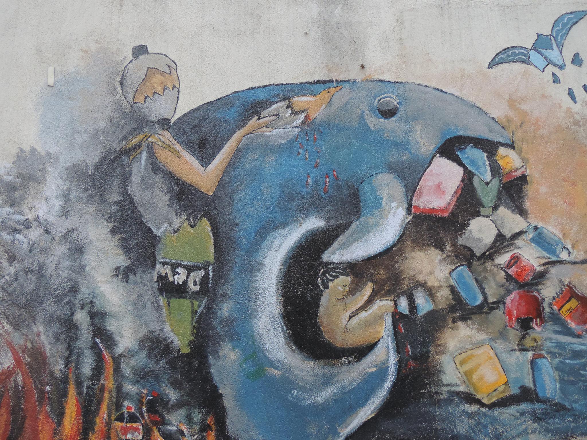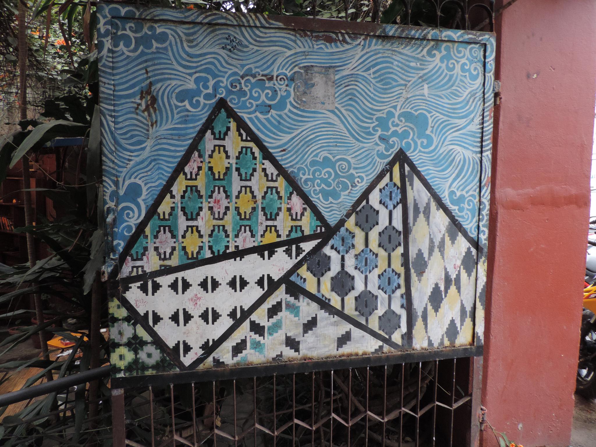 Coffee is one of the features that gives Gulmi its fame. In this mural, wisps of steam from the coffee colorfully blend into mountains, creating a unified image of this sometimes-overlooked district. It is believed that the district is a hidden treasure for natural beauty. The mural now rests on a wall that used to be heavily covered by ugly commercial posters. The artist hopes his homage to this beautiful district will stop more posters from vandalizing the wall.