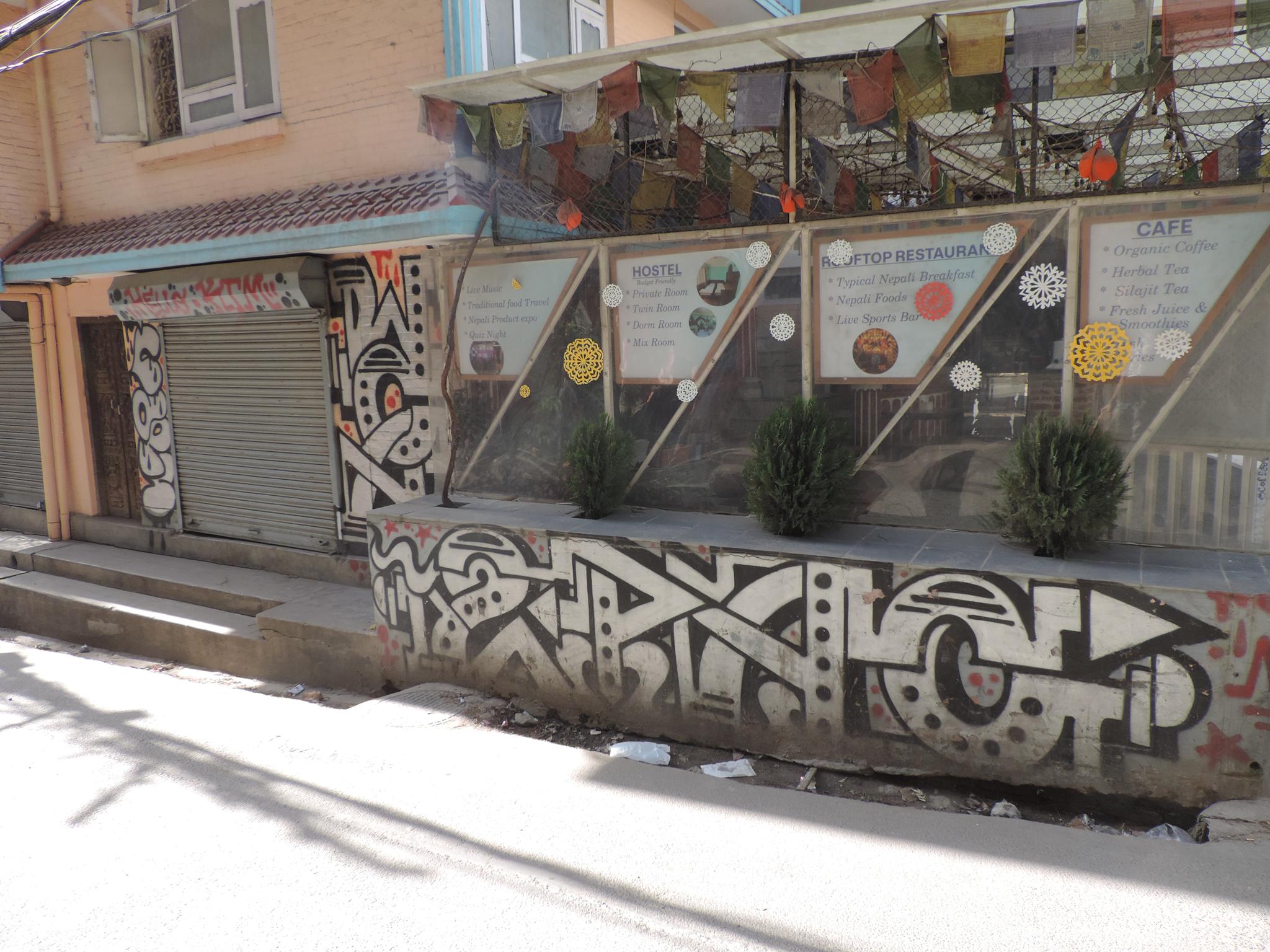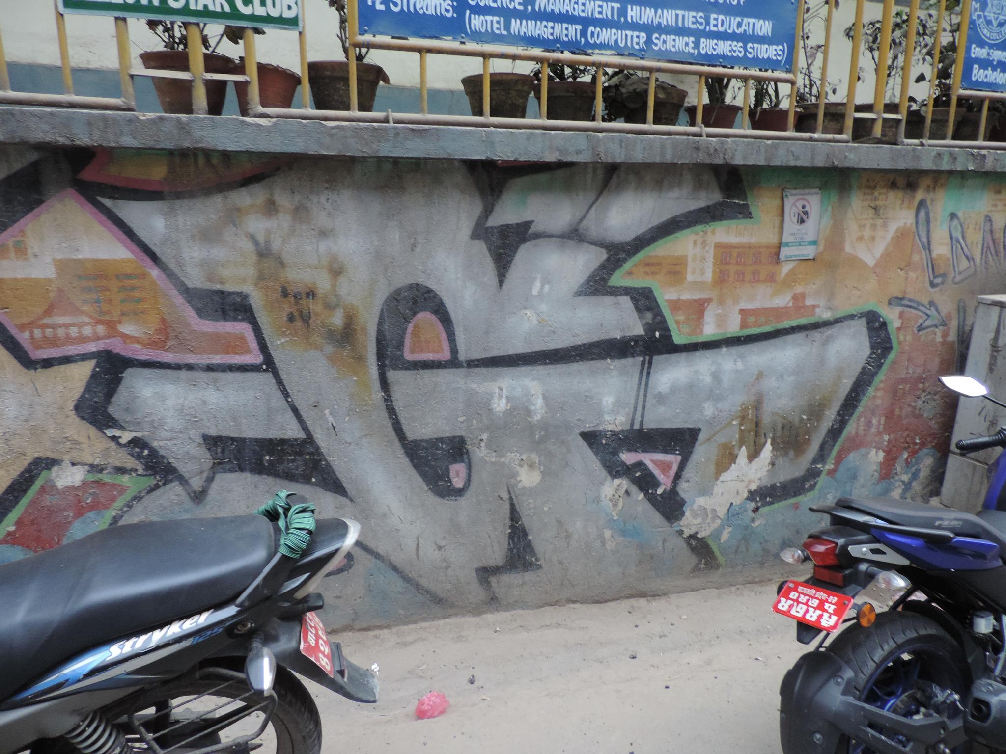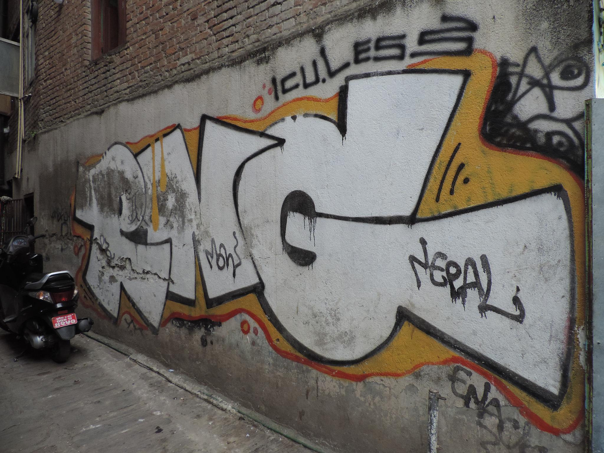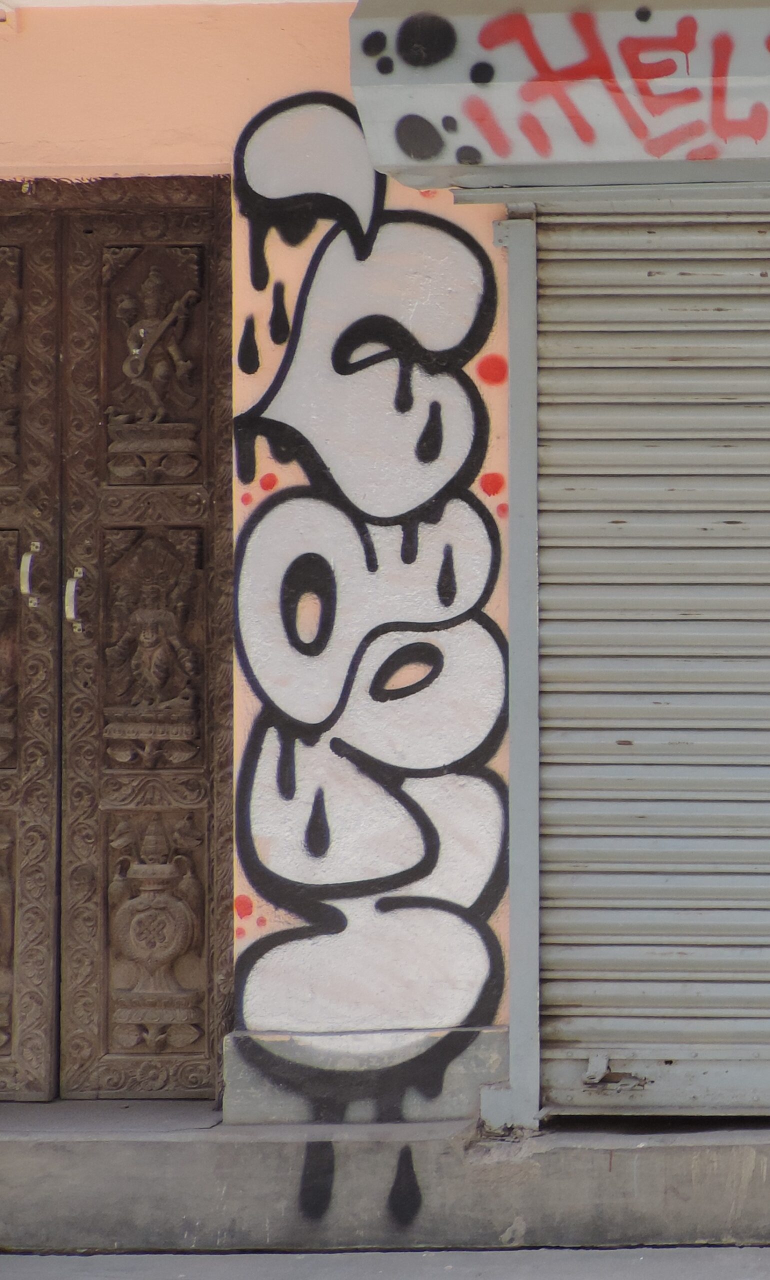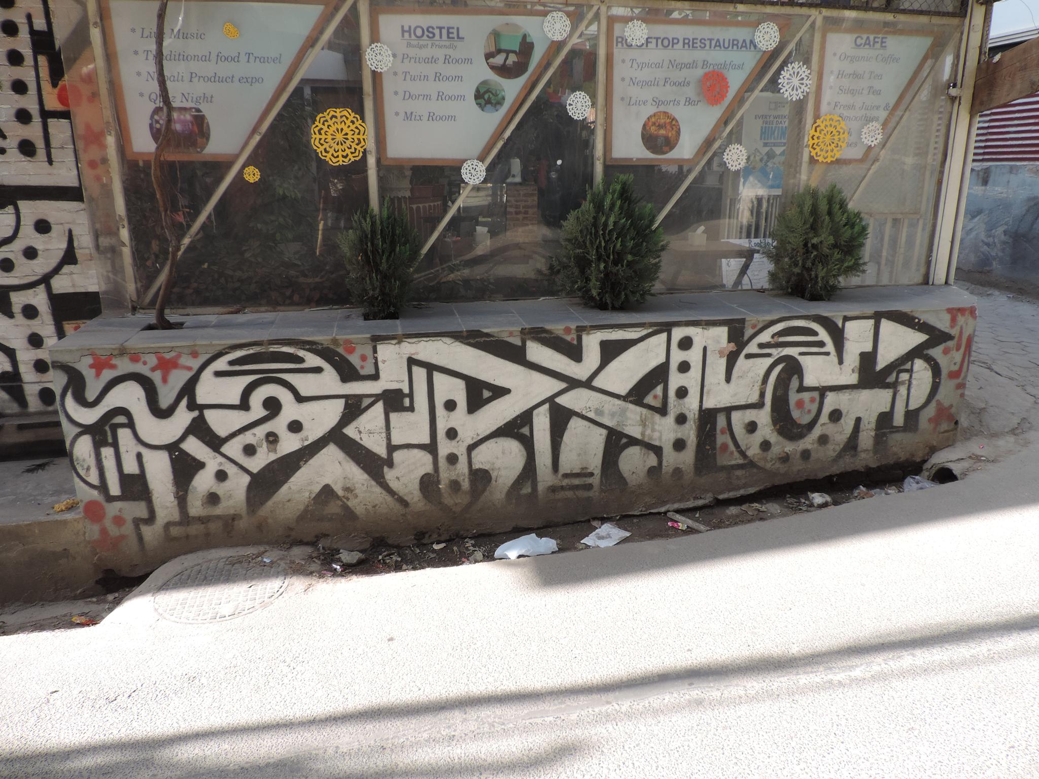 On this page, you’ll find graffiti and styles from the Thamel district in western Kathmandu. These pieces are more elaborate than the throw-ups, featuring different colors, three-dimensional effects, and outlines. They are more complex works, and now and then there’s even a character included. We have a lot of photos, so we’ve divided them into categories. Check as well the pages for the Thamel district featuring Tags & Signatures, Throw Ups & Bombings, Streetart & Characters and the Amrit Marg Collaboration Wall.